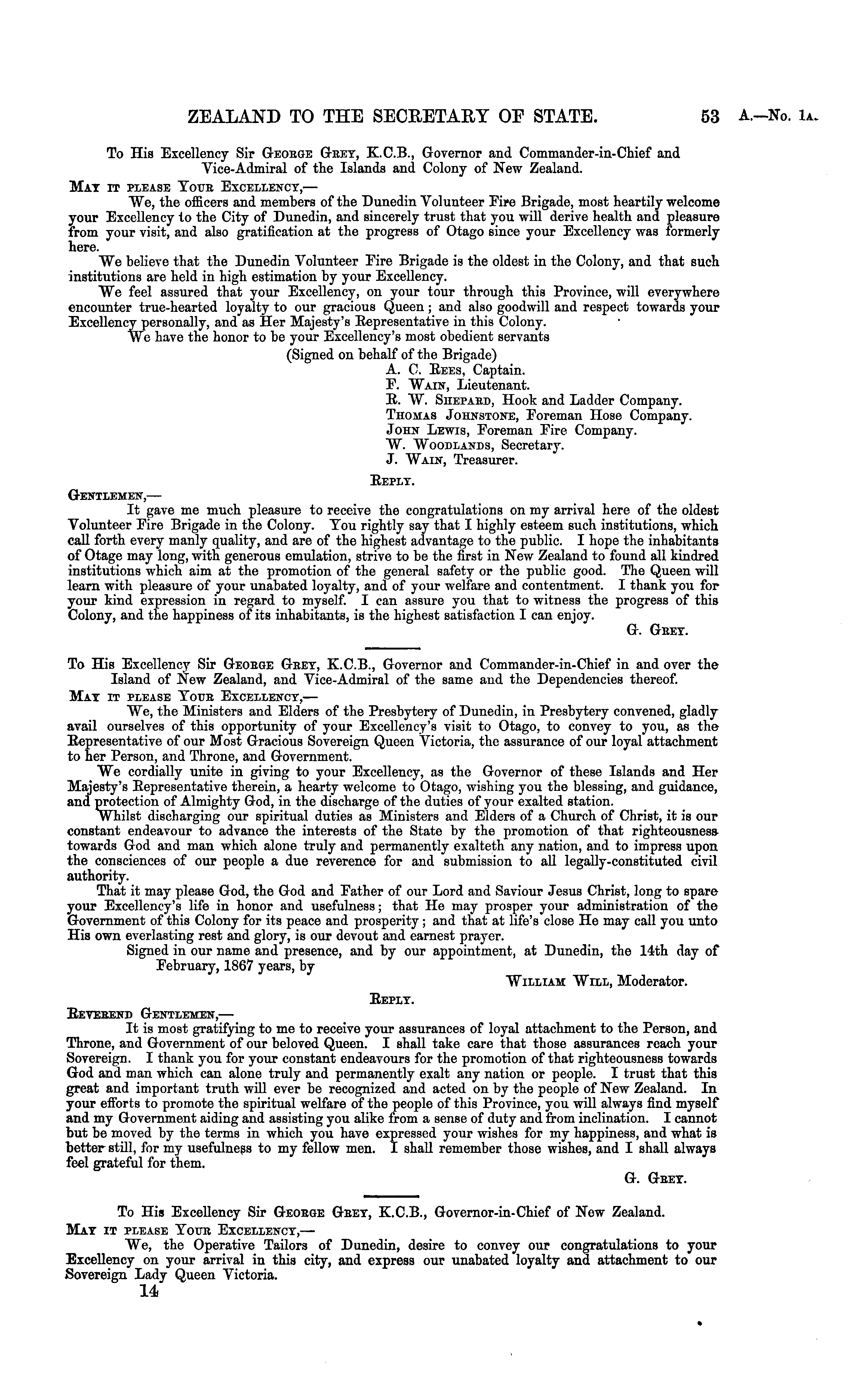 To His Excellency Sir George Gret, K.C.8., Governor and Commander-in-Chief in and over the Island of New Zealand, and Vice-Admiral of the same and the Dependencies thereof. Mat it please Your Excellenct, — We, the Ministers and Elders of the Presbytery of Dunedin, in Presbytery convened, gladly avail ourselves of this opportunity of your Excellency's visit to Otago, to convey to you, as the Bepresentative of our Most Gracious Sovereign Queen A^ictoria, the assurance of our loyal attachment to her Person, and Throne, and Government. We cordially unite in giving to your Excellency, as the Governor of these Islands and Her Majesty's Bepresentative therein, a hearty welcome to Otago, wishing you the blessing, and guidance, and protection of Almighty God, in the discharge of the duties of your exalted station. Whilst discharging our spiritual duties as Ministers and Elders of a Church of Christ, it is our constant endeavour to advance the interests of the State by the promotion of that righteousness towards God and man which alone truly and permanently exalteth any nation, and to impress upon the consciences of our people a due reverence for and submission to all legally-constituted civil authority. That it may please God, the God and Father of our Lord and Saviour Jesus Christ, long to spare your Excellency's life in honor and usefulness; that He may prosper your administration of the Government of this Colony for its peace and prosperity; and that at life's close He may call you unto His own everlasting rest and glory, is our devout and earnest prayer. Signed in our name and presence, and by our appointment, at Dunedin, tho 14th day of February, 1867 years, by William Will, Moderator. Beplt. Beverend Gentlemen, — It is most gratifying to me to receive your assurances of loyal attachment to the Berson, and Throne, and Government of our beloved Queen. I shall take care that those assurances reach your Sovereign. I thank you for your constant endeavours for the promotion of that righteousness towards God and man which can alone truly and permanently exalt any nation or people. I trust that this great and important truth will ever be recognized and acted on by the people of New Zealand. In your efforts to promote tho spiritual welfare of the people of this Province, you will always find myself and my Government aiding and assisting you alike from a sense of duty and from inclination. I cannot but be moved by the terms in which you have expressed your wishes for my happiness, and what is better still, for my usefulness to my fellow men. I shall remember those wishes, and I shall always feel grateful for them. G. Gret. To His Excellency Sir George Gret, K.C.8., Governor-in-Chief of New Zealand. Mat it please Your Excellenct, — We, the Operative Tailors of Dunedin, desire to convey our congratulations to your Excellency on your arrival in this city, and express our unabated loyalty and attachment to our Sovereign Lady Queen Victoria. 14