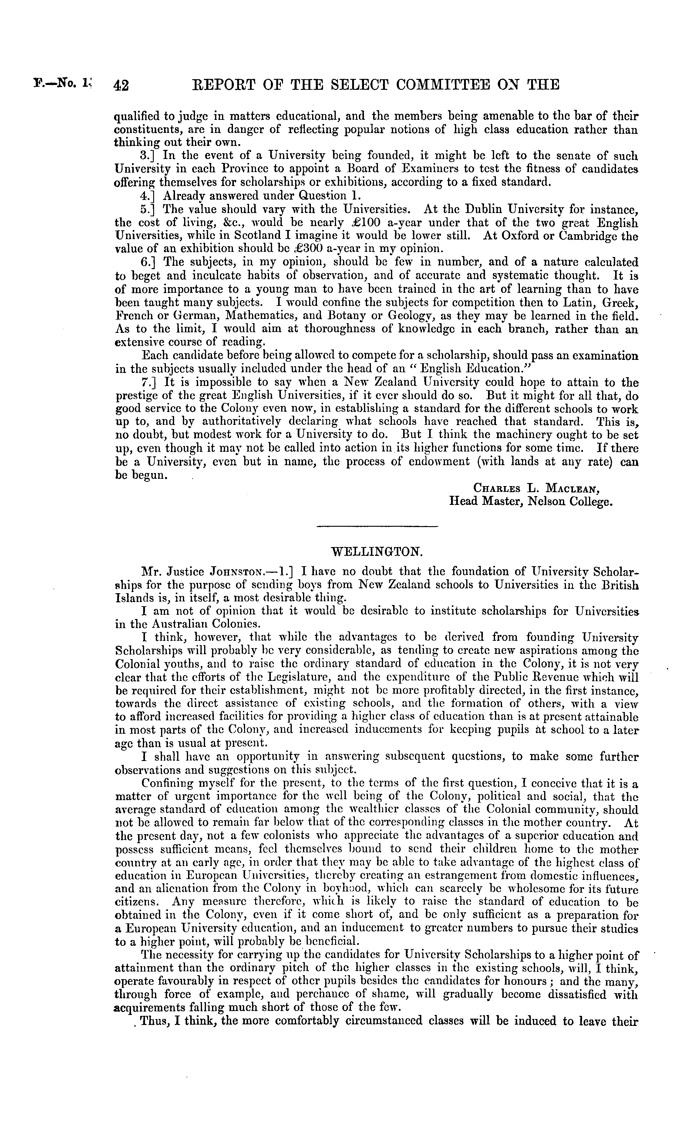 qualified to judge in matters educational, and the members being amenable to the bar of their constituents, are in danger of reflecting popular notions of high class education rather than thinking out their own. 3.] In the event of a University being founded, it might be left to the senate of such University in each Province to appoint a Board of Examiners to test the fitness of candidates offering themselves for scholarships or exhibitions, according to a fixed standard. 4.] Already answered under Question 1. 5.] The value should vary with the Universities. At the Dublin University for instance, the cost of living, &c, would be nearly £100 a-ycar under that of the two great English Universities, while in Scotland I imagine it would be lower still. At Oxford or Cambridge the value of an exhibition should be £300 a-ycar in my opinion. 6.] The subjects, in my opinion, should be few in number, and of a nature calculated to beget and inculcate habits of observation, and of accurate and systematic thought. It is of more importance to a young man to have been trained in the art of learning than to have been taught many subjects. I would confine the subjects for competition then to Latin, Greek, French or German, Mathematics, and Botany or Geology, as they may be learned in the field. As to the limit, I would aim at thoroughness of knowledge in each branch, rather than an extensive course of reading. Each candidate before being allowed to compete for a scholarship, should pass an examination in the subjects usually included under the head of an " English Education." 7.] It is impossible to say when a New Zealand University could hope to attain to the prestige of the great English Universities, if it ever should do so. But it might for all that, do good service to the Colony even now, in establishing a standard for the different schools to work up to, and by authoritatively declaring what schools have reached that standard. This is, no doubt, but modest work for a University to do. But I think the machinery ought to be set up, even though it may not be called into action in its higher functions for some time. If there be a University, even but in name, the process of endowment (with lands at any rate) can be begun. Charles L. Maclean, Head Master, Nelson College.