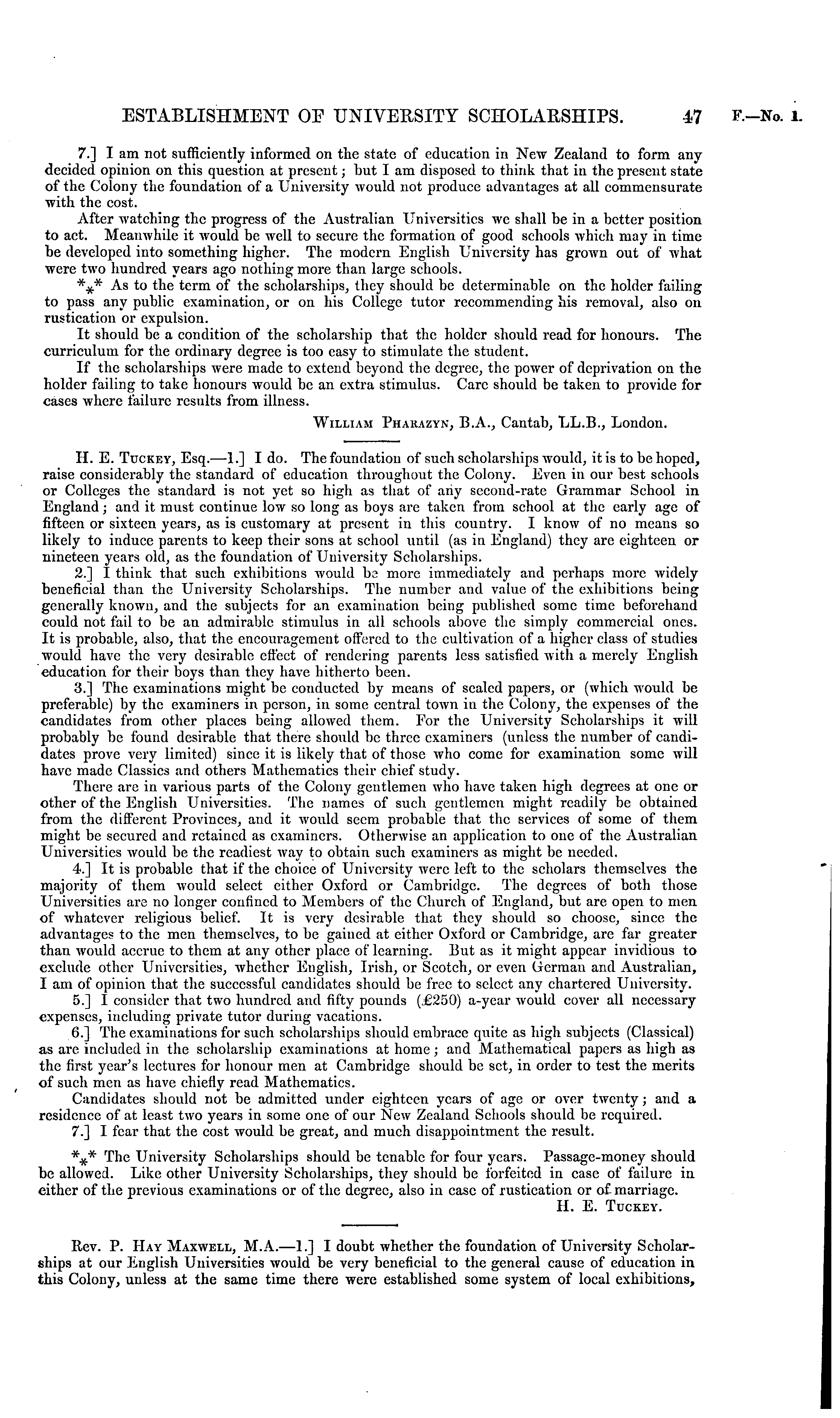 H. E. Tuckey, Esq. —I.] I do. The foundation of such scholarships would, it is to be hoped, raise considerably the standard of education throughout the Colony. Even, in our best schools or Colleges the standard is not yet so high as that of any second-rate Grammar School in England; and it must continue low so long as boys are taken from school at the early age of fifteen or sixteen years, as is customary at present in this country. I know of no means so likely to induce parents to keep their sons at school until (as in England) they are eighteen or nineteen years old, as the foundation of University Scholarships. 2.] I think that such exhibitions would ba more immediately and perhaps more widely beneficial than the University Scholarships. The number and value of the exhibitions being generally known, and the subjects for an examination being published some time beforehand could not fail to be an admirable stimulus in all schools above the simply commercial ones. It is probable, also, that the encouragement offered to the cultivation of a higher class of studies would have the very desirable effect of rendering parents less satisfied with a merely English education for their boys than they have hitherto been. 3.] The examinations might be conducted by means of scaled papers, or (which would be preferable) by the examiners in person, in some central town in the Colony, the expenses of the candidates from other places being allowed them. For the University Scholarships it will probably be found desirable that there should be three examiners (unless the number of candidates prove very limited) since it is likely that of those who come for examination some will have made Classics and others Mathematics their chief study. There are in various parts of the Colony gentlemen who have taken high degrees at one or other of the English Universities. The names of such gentlemen might readily be obtained from the different Provinces, and it would seem probable that the services of some of them might be secured and retained as examiners. Otherwise an application to one of the Australian Universities would be the readiest way to obtain such examiners as might be needed. 4-.] It is probable that if the choice of University were left to the scholars themselves the majority of them would select either Oxford or Cambridge. The degrees of both those Universities are no longer confined to Members of the Church of England, but are open to men of whatever religious belief. It is very desirable that they should so choose, since the advantages to the men themselves, to be gained at either Oxford or Cambridge, are far greater than would accrue to them at any other place of learning. But as it might appear invidious to exclude other Universities, whether English, Irish, or Scotch, or even German and Australian, I am of opinion that the successful candidates should be free to select any chartered University. 5.] I consider that two hundred and fifty pounds (£250) a-year would cover all necessary expenses, including private tutor during vacations. G.] The examinations for such scholarships should embrace quite as high subjects (Classical) as arc included in the scholarship examinations at home; and Mathematical papers as high as the first year's lectures for honour men at Cambridge should be set, in order to test the merits of such men as have chiefly read Mathematics. Candidates should not be admitted under eighteen years of age or over twenty; and a residence of at least two years in some one of our New Zealand Schools should be required. 7.] I fear that the cost would be great, and much disappointment the result. *#* The University Scholarships should be tenable for four years. Passage-money should be allowed. Like other University Scholarships, they should be forfeited in case of failure in either of the previous examinations or of the degree, also in case of rustication or of marriage. 11. E. Tuckey.