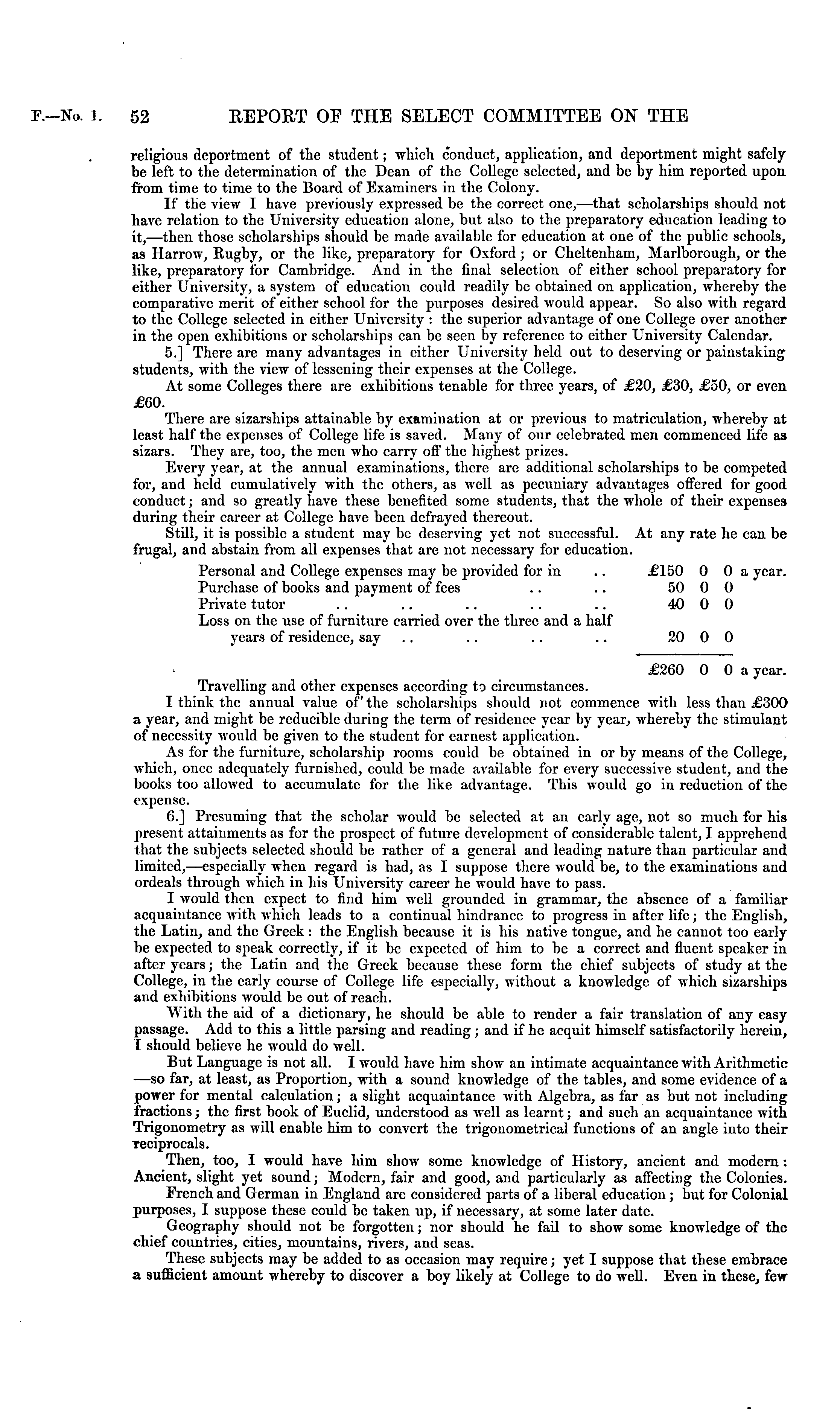 religious deportment of the student; which conduct, application, and deportment might safely be left to the determination of the Dean of the College selected, and be by him reported upon from time to time to the Board of Examiners in the Colony. If the view I have previously expressed be the correct one, —that scholarships should not have relation to the University education alone, but also to the preparatory education leading to it, —then those scholarships should be made available for education at one of the public schools, as Harrow, Rugby, or the like, preparatory for Oxford; or Cheltenham, Marlborough, or the like, preparatory for Cambridge. And in the final selection of either school preparatory for either University, a system of education could readily be obtained on application, whereby the comparative merit of either school for the purposes desired would appear. So also with regard to the College selected in either University : the superior advantage of one College over another in the open exhibitions or scholarships can be seen by reference to either University Calendar. 5.] There are many advantages in either University held out to deserving or painstaking students, with the view of lessening their expenses at the College. At some Colleges there are exhibitions tenable for three years, of £20, £30, £50, or even £60. There are sizarships attainable by examination at or previous to matriculation, whereby at least half the expenses of College life is saved. Many of our celebrated men commenced life as sizars. They are, too, the men who carry off the highest prizes. Every year, at the annual examinations, there are additional scholarships to be competed for, and held cumulatively with the others, as well as pecuniary advantages offered for good conduct; and so greatly have these benefited some students, that the whole of their expenses during their career at College have been defrayed thereout. Still, it is possible a student may be deserving yet not successful. At any rate he can be frugal, and abstain from all expenses that are not necessary for education. Personal and College expenses may be provided for in .. £150 0 0a year. Purchase of books and payment of fees .. .. 50 0 0 Private tutor . . .. .. .. .. 40 0 0 Loss on the use of furniture carried over the three and a half years of residence, say .. .. .. .. 20 0 0 ♦ £260 0 0a year. Travelling and other expenses according to circumstances. I think the annual value of the scholarships should not commence with less than £300 a year, and might be reducible during the term of residence year by year, whereby the stimulant of necessity would be given to the student for earnest application. As for the furniture, scholarship rooms could be obtained in or by means of the College, which, once adequately furnished, could be made available for every successive student, and the books too allowed to accumulate for the like advantage. This would go in reduction of the expense. 6.] Presuming that the scholar would be selected at an early age, not so much for his present attainments as for the prospect of future development of considerable talent, I apprehend that the subjects selected should be rather of a general and leading nature than particular and limited, —especially when regard is had, as I suppose there would be, to the examinations and ordeals through which in his University career he would have to pass. I would then expect to find him well grounded in grammar, the absence of a familiar acquaintance with which leads to a continual hindrance to progress in after life; the English, the Latin, and the Greek : the English because it is his native tongue, and he cannot too early be expected to speak correctly, if it be expected of him to be a correct and fluent speaker in after years; the Latin and the Greek because these form the chief subjects of study at the College, in the early course of College life especially, without a knowledge of which sizarships and exhibitions would be out of reach. With the aid of a dictionary, he should be able to render a fair translation of any easy passage. Add to this a little parsing and reading; and if he acquit himself satisfactorily herein, I should believe he would do well. But Language is not all. I would have him show an intimate acquaintance with Arithmetic —so far, at least, as Proportion, with a sound knowledge of the tables, and some evidence of a power for mental calculation; a slight acquaintance with Algebra, as far as but not including fractions; the first book of Euclid, understood as well as learnt; and such an acquaintance with Trigonometry as will enable him to convert the trigonometrical functions of an angle into their reciprocals. Then, too, I would have him show some knowledge of History, ancient and modern : Ancient, slight yet sound; Modern, fair and good, and particularly as affecting the Colonies. French and German in England are considered parts of a liberal education; but for Colonial purposes, I suppose these could be taken up, if necessary, at some later date. Geography should not be forgotten; nor should he fail to show some knowledge of the chief countries, cities, mountains, rivers, and seas. These subjects may be added to as occasion may require; yet I suppose that these embrace a sufficient amount whereby to discover a boy likely at College to do well. Even in these, few