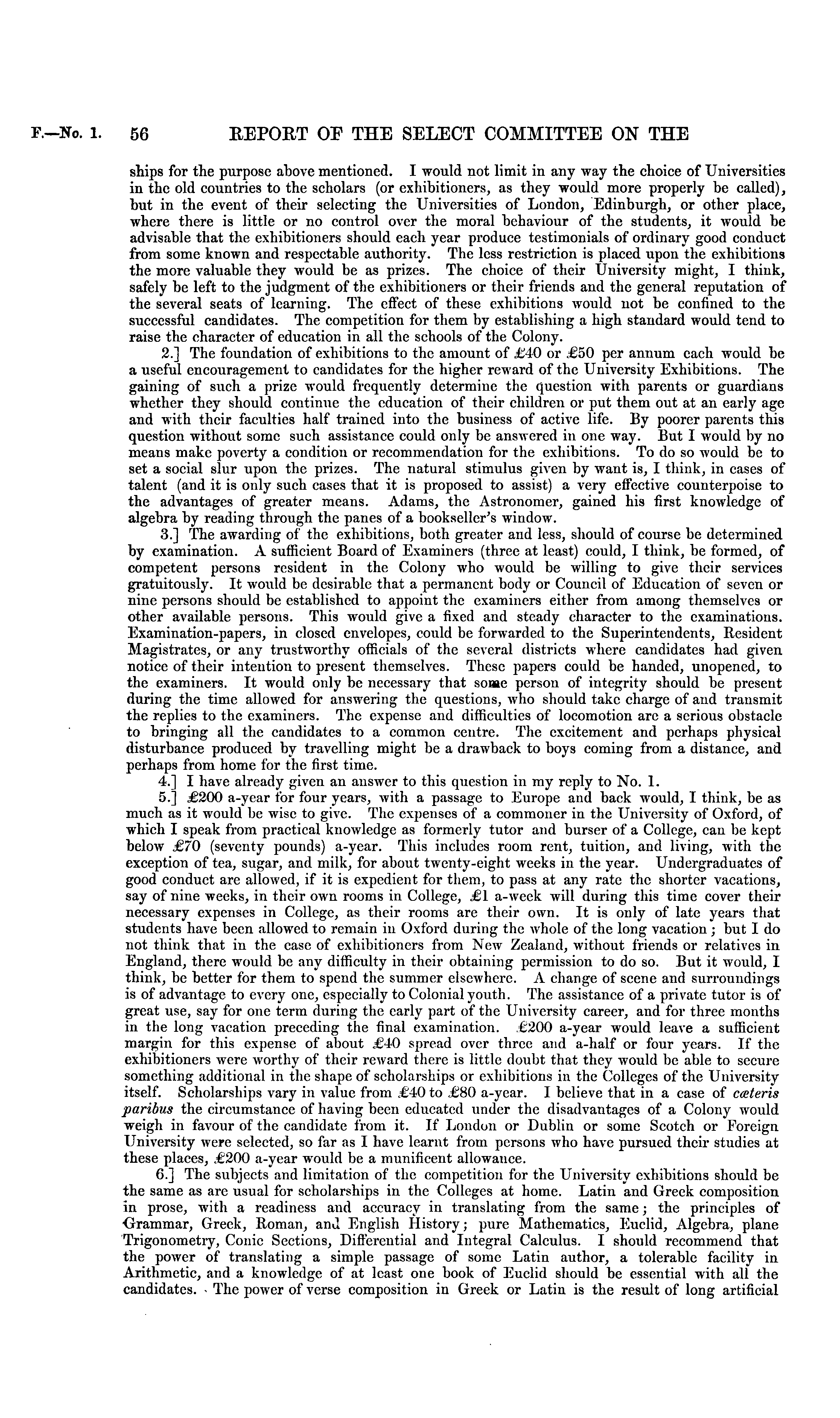 ships for the purpose above mentioned. I would not limit in any way the choice of Universities in the old countries to the scholars (or exhibitioners, as they would more properly be called), but in the event of their selecting the Universities of London, Edinburgh, or other place, where there is little or no control over the moral behaviour of the students, it would be advisable that the exhibitioners should each year produce testimonials of ordinary good conduct from some known and respectable authority. The less restriction is placed upon the exhibitions the more valuable they would be as prizes. The choice of their University might, I think, safely be left to the judgment of the exhibitioners or their friends and the general reputation of the several seats of learning. The effect of these exhibitions would not be confined to the successful candidates. The competition for them by establishing a high standard would tend to raise the character of education in all the schools of the Colony. 2.] The foundation of exhibitions to the amount of £40 or £50 per annum each would be a useful encouragement to candidates for the higher reward of the University Exhibitions. The gaining of such a prize would frequently determine the question with parents or guardians whether they should continue the education of their children or put them out at an early age and with their faculties half trained into the business of active life. By poorer parents this question without some such assistance could only be answered in one way. But I would by no means make poverty a condition or recommendation for the exhibitions. To do so would be to set a social slur upon the prizes. The natural stimulus given by want is, I think, in cases of talent (and it is only such cases that it is proposed to assist) a very effective counterpoise to the advantages of greater means. Adams, the Astronomer, gained his first knowledge of algebra by reading through the panes of a bookseller's window. 3.] The awarding of the exhibitions, both greater and less, should of course be determined by examination. A sufficient Board of Examiners (three at least) could, I think, be formed, of competent persons resident in the Colony who would be willing to give their services gratuitously. It would be desirable that a permanent body or Council of Education of seven or nine persons should be established to appoint the examiners either from among themselves or other available persons. This would give a fixed and steady character to the examinations. Examination-papers, in closed envelopes, could be forwarded to the Superintendents, Resident Magistrates, or any trustworthy officials of the several districts where candidates had given notice of their intention to present themselves. These papers could be handed, unopened, to the examiners. It would only be necessary that some person of integrity should be present during the time allowed for answering the questions, who should take charge of and transmit the replies to the examiners. The expense and difficulties of locomotion are a serious obstacle to bringing all the candidates to a common centre. The excitement and perhaps physical disturbance produced by travelling might be a drawback to boys coming from a distance, and perhaps from home for the first time. 4.] I have already given an answer to this question in my reply to No. 1. 5.] £200 a-ycar for four years, with a passage to Europe and back would, I think, be as much as it would be wise to give. The expenses of a commoner in the University of Oxford, of which I speak from practical knowledge as formerly tutor and burser of a College, can be kept below £70 (seventy pounds) a-year. This includes room rent, tuition, and living, with the exception of tea, sugar, and milk, for about twenty-eight weeks in the year. Undergraduates of good conduct arc allowed, if it is expedient for them, to pass at any rate the shorter vacations, say of nine weeks, in their own rooms in College, £1 a-week will during this time cover their necessary expenses in College, as their rooms are their own. It is only of late years that students have been allowed to remain in Oxford during the whole of the long vacation ; but I do not think that in the case of exhibitioners from New Zealand, without friends or relatives in England, there would be any difficulty in their obtaining permission to do so. But it would, I think, be better for them to spend the summer elsewhere. A change of scene and surroundings is of advantage to every one, especially to Colonial youth. The assistance of a private tutor is of great use, say for one term during the early part of the University career, and for three months in the long vacation preceding the final examination. £200 a-ycar would leave a sufficient margin for this expense of about £40 spread over three and a-half or four years. If the exhibitioners were worthy of their reward there is little doubt that they would be able to secure something additional in the shape of scholarships or exhibitions in the Colleges of the University itself. Scholarships vary in value from £40 to £80 a-year. I believe that in a case of ceeteris paribus the circumstance of having been educated under the disadvantages of a Colony would weigh in favour of the candidate from it. If London or Dublin or some Scotch or Foreign University were selected, so far as I have learnt from persons who have pursued their studies at these places, £200 a-year would be a munificent allowance. 6.] The subjects and limitation of the competition for the University exhibitions should be the same as arc usual for scholarships in the Colleges at home. Latin and Greek composition in prose, with a readiness and accuracy in translating from the same; the principles of Grammar, Greek, Roman, and English History; pure Mathematics, Euclid, Algebra, plane Trigonometry, Conic Sections, Differential and Integral Calculus. I should recommend that the power of translating a simple pas