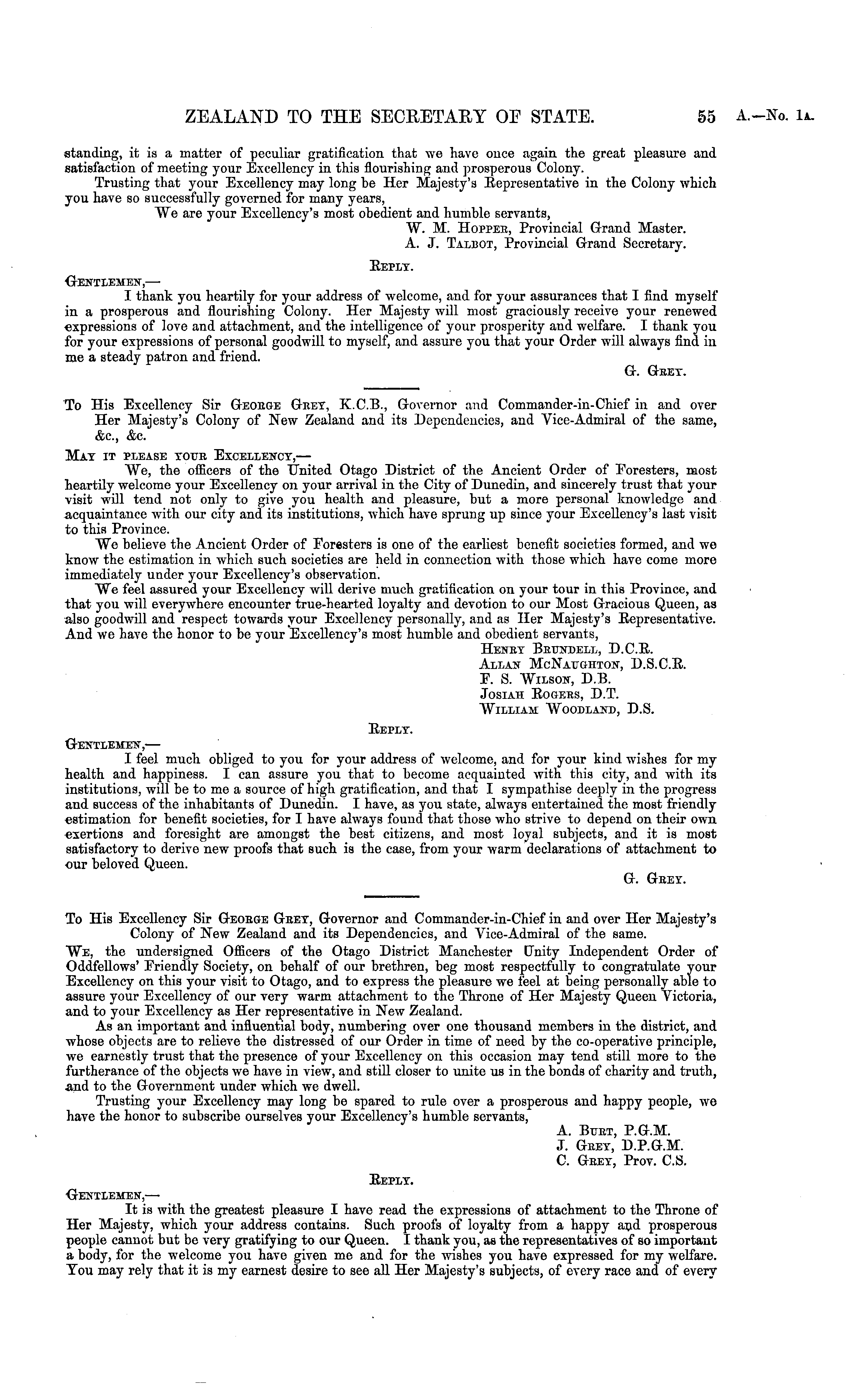 To His Excellency Sir George Gret, K.C.8., Governor and Commander-in-Chief in and over Her Majesty's Colony of New Zealand and its Dependencies, and Vice-Admiral of the same, &c, &c. Mat it please tour Excellenct, — We, the officers of the United Otago District of the Ancient Order of Foresters, most heartily welcome your Excellency on your arrival in the City of Dunedin, and sincerely trust that your visit will tend not only to give you health and pleasure, but a more personal knowledge and acquaintance with our city and its institutions, which have sprung up since your Excellency's last visit to this Province. We believe the Ancient Order of Foresters is one of the earliest benefit societies formed, and we know the estimation in which such societies are held in connection with those which have come more immediately under your Excellency's observation. We feel assured your Excellency will derive much gratification on your tour in this Province, and that you will everywhere encounter true-hearted loyalty and devotion to our Most Gracious Queen, as also goodwill and respect towards your Excellency personally, and as Her Majesty's Bepresentative. And we have the honor to be your Excellency's most humble and obedient servants, Henrt Brundell, D.C.B. Allan McNaughton, D.S.C.E. F. S. Wilson, D.B. JOSIAH EOGERS, D.T. William Woodland, D.S. Beplt. Gentlemen, — I feel much obliged to you for your address of welcome, and for your kind wishes for my health and happiness. I can assure you that to become acquainted with this city, and with its institutions, will be to me a source of high gratification, and that I sympathise deeply in the progress and success of the inhabitants of Dunedin. I have, as you state, always entertained the most friendly estimation for benefit societies, for I have always found that those who strive to depend on their own exertions and foresight are amongst the best citizens, and most loyal subjects, and it is most satisfactory to derive new proofs that such is the case, from your warm declarations of attachment to our beloved Queen. G. Gret.