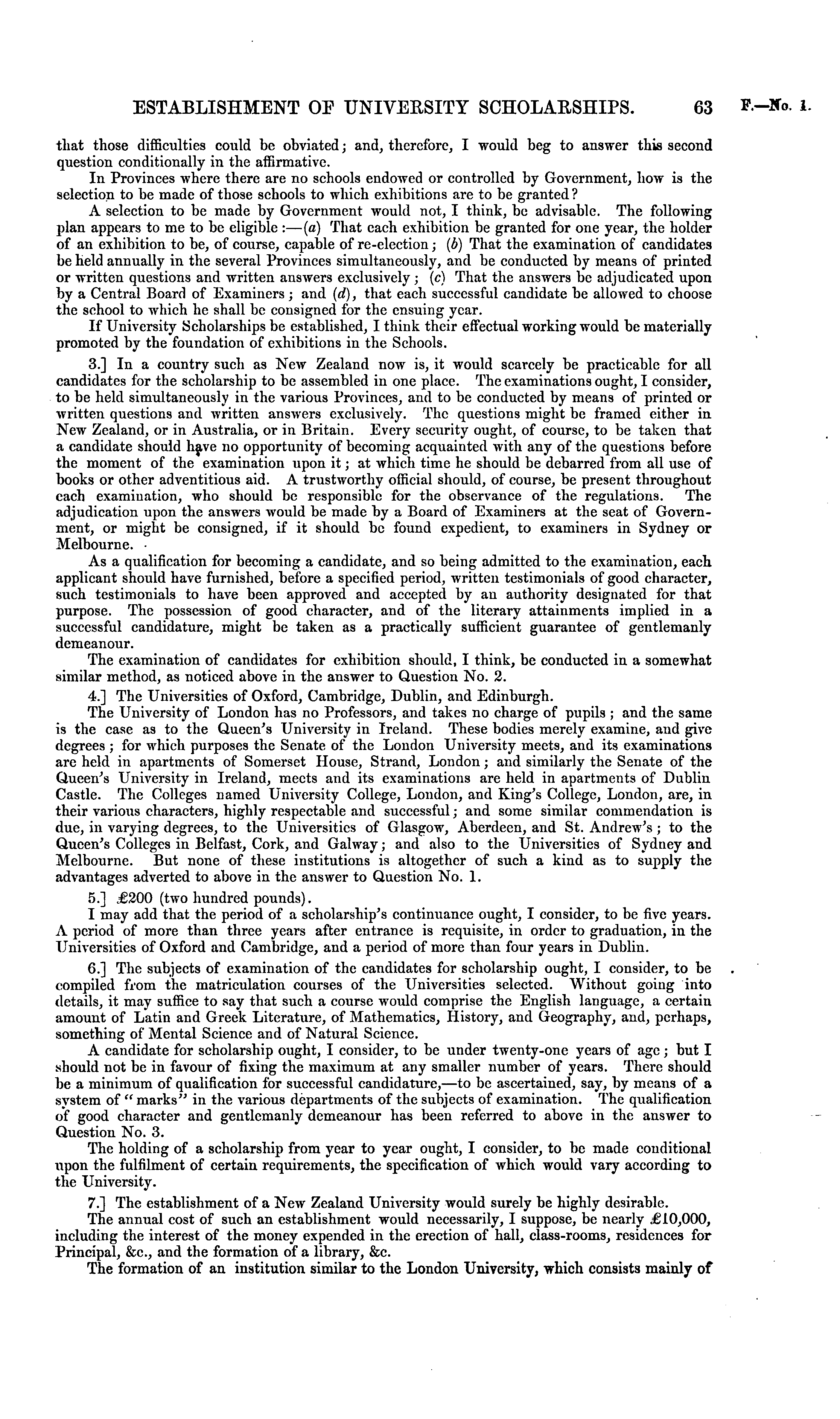 that those difficulties could be obviated; and, therefore, I would beg to answer this second question conditionally in the affirmative. In Provinces where there are no schools endowed or controlled by Government, how is the selection to be made of those schools to which exhibitions are to be granted ? A selection to be made by Government would not, I think, be advisable. The following plan appears to me to be eligible :— (a) That each exhibition be granted for one year, the holder of an exhibition to be, of course, capable of re-election; (6) That the examination of candidates be held annually in the several Provinces simultaneously, and be conducted by means of printed or written questions and written answers exclusively; (c) That the answers be adjudicated upon by a Central Board of Examiners; and (d), that each successful candidate be allowed to choose the school to which he shall be consigned for the ensuing year. If University Scholarships be established, I think their effectual working would be materially promoted by the foundation of exhibitions in the Schools. 3.] In a country such as New Zealand now is, it would scarcely be practicable for all candidates for the scholarship to be assembled in one place. The examinations ought, I consider, to be held simultaneously in the various Provinces, and to be conducted by means of printed or written questions and written answers exclusively. The questions might be framed either in. New Zealand, or in Australia, or in Britain. Every security ought, of course, to be taken that a candidate should have no opportunity of becoming acquainted with any of the questions before the moment of the examination upon it; at which time he should be debarred from all use of books or other adventitious aid. A trustworthy official should, of course, be present throughout each examination, who should be responsible for the observance of the regulations. The adjudication upon the answers would be made by a Board of Examiners at the seat of Government, or might be consigned, if it should be found expedient, to examiners in Sydney or Melbourne. • As a qualification for becoming a candidate, and so being admitted to the examination, each applicant should have furnished, before a specified period, written testimonials of good character, such testimonials to have been approved and accepted by an authority designated for that purpose. The possession of good character, and of the literary attainments implied in a successful candidature, might be taken as a practically sufficient guarantee of gentlemanly demeanour. The examination of candidates for exhibition should, I think, be conducted in a somewhat similar method, as noticed above in the answer to Question No. 2. 4.] The Universities of Oxford, Cambridge, Dublin, and Edinburgh. The University of London has no Professors, and takes no charge of pupils ; and the same is the case as to the Queen's University in Ireland. These bodies merely examine, and give degrees ; for which purposes the Senate of the London University meets, and its examinations are held in apartments of Somerset House, Strand, London; and similarly the Senate of the Queen's University in Ireland, meets and its examinations are held in apartments of Dublin Castle. The Colleges named University College, London, and King's College, London, are, in their various characters, highly respectable and successful; and some similar commendation is due, in varying degrees, to the LTniversities of Glasgow, Aberdeen, and St. Andrew's ; to the Queen's Colleges in Belfast, Cork, and Galway; and also to the Universities of Sydney and Melbourne. But none of these institutions is altogether of such a kind as to supply the advantages adverted to above in the answer to Question No. 1. 5.] .€2OO (two hundred pounds). I may add that the period of a scholarship's continuance ought, I consider, to be five years. A period of more than three years after entrance is requisite, in order to graduation, in the Universities of Oxford and Cambridge, and a period of more than four years in Dublin. 6.] The subjects of examination of the candidates for scholarship ought, I consider, to be compiled from the matriculation courses of the Universities selected. Without going into details, it may suffice to say that such a course would comprise the English language, a certain amount of Latin and Greek Literature, of Mathematics, History, and Geography, and, perhaps, something of Mental Science and of Natural Science. A candidate for scholarship ought, I consider, to be under twenty-one years of age ; but I should not be in favour of fixing the maximum at any smaller number of years. There should be a minimum of qualification for successful candidature, —to be ascertained, say, by means of a system of " marks" in the various departments of the subjects of examination. The qualification of good character and gentlemanly demeanour has been referred to above in the answer to Question No. 3. The holding of a scholarship from year to year ought, I consider, to be made conditional npon the fulfilment of certain requirements, the specification of which would vary according to the University. 7.] The establishment of a New Zealand University would surely be highly desirable. The annual cost of such an establishment would necessarily, I suppose, be nearly £10,000, including the interest of the money expended in the erection of hall, class-rooms, residences for Principal, &c., and the formation of a library, &c. The formation of an institution similar to the London University, which consists mainly of