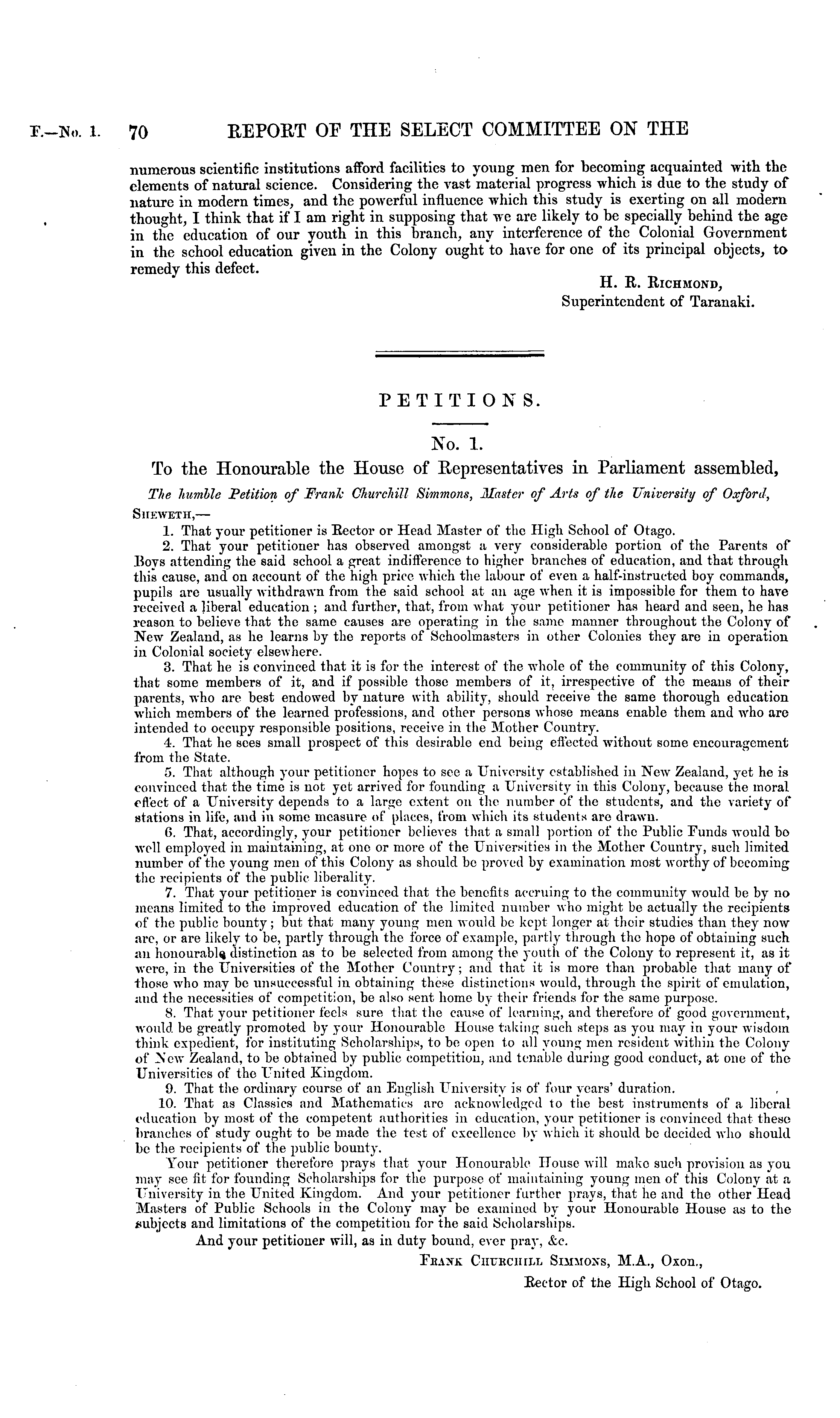 PETITIONS. No. 1. To the Honourable the House of Representatives in Parliament assembled, The humble Petition of Frank Churchill Simmons, Master of Arts of the University of Oxford, Skkweth, — 1. That your petitioner is Eector or Head Master of the High School of Otago. 2. That your petitioner has observed amongst a very considerable portion of the Parents of liovs attending the said school a great indifference to higher branches of education, and that through this cause, and on account of the high price which the labour of even a half-instructed boy commands, pupils are usually withdrawn from the said school at an age when it is impossible for them to have received a liberal education ; and further, that, from what your petitioner has heard and seeu, he has reason to believe that the same causes are operating in the same manner throughout the Colony of New Zealand, as lie learns by the reports of Schoolmasters in other Colonies they are in operation. in Colonial society elsewhere. 3. That he is convinced that it is for the interest of the whole of the community of this Colony, that some members of it, and if possible those members of it, irrespective of the means of their parents, who are best endowed by nature with ability, should receive the same thorough education which members of the learned professions, and other persons whose means enable them and who are intended to occupy responsible positions, receive in the Mother Country. 4. That he sees small prospect of this desirable end being effected without some encouragement from the State. 5. That although your petitioner hopes to see a University established in New Zealand, yet he is convinced that the time is not yet arrived for founding a University in this Colony, because the moral effect of a University depends to a large extent on the number of the students, and the variety of stations in life, and in some measure of places, from which its students are drawn. 6. That, accordingly, your petitioner believes that a small portion of the Public Funds would bo well employed in maintaining, at one or more of the Universities in the Mother Country, such limited number of the young men of this Colony as should be proved by examination most worthy of becoming the recipients of the public liberality. 7. That your petitioner is convinced that the benefits accruing to the community would be by no means limited to the improved education of the limited number who might be actually the recipients of the public bounty ; but that many young men would be kept longer at their studies than they now are, op are likely to be, partly through the force of example, partly through the hope of obtaining such an honourably distinction as to be selected from among the youth of the Colony to represent it, as it were, in the Universities of the Mother Country; and that it is more than probable that many of those who may be unsuccessful in obtaining these distinctions would, through the spirit of emulation, and the necessities of competition, be also sent home by their friends for the same purpose. 8. That your petitioner feels sure that the cause of learning, and therefore of good government, would be greatly promoted by your Honourable House taking such steps as you may in your wisdom think expedient, for instituting Scholarships, to be open to all young men resident within the Colony nf New Zealand, to be obtained by public competition, and tenable during good conduct, at one of the Universities of the United Kingdom. 9. That the ordinary course of an English University is of four years' duration. 10. That as Chissics and Mathematics are acknowledged to the best instruments of a liberal education by most of the competent authorities in education, your petitioner is convinced that these branches of study ought to be made the test of excellence by which it should bo decided who should be the recipients of the public bounty. Your petitioner therefore prays that your Honourable House will make such provision as you may see fit for founding Scholarships for the purpose of maintaining young men of this Colony at a University in the United Kingdom. And your petitioner further prays, that he and the other Head Masters of Public Schools in the Colony may be examined by your Honourable House as to the Mibjects and limitations of the competition for the said Scholarships. And your petitioner will, as in duty bound, ever pray. Ac. Fbaxk CiiUECiiiLT, Simmons, M.A., Oxon., Eector of the High School of Otago.