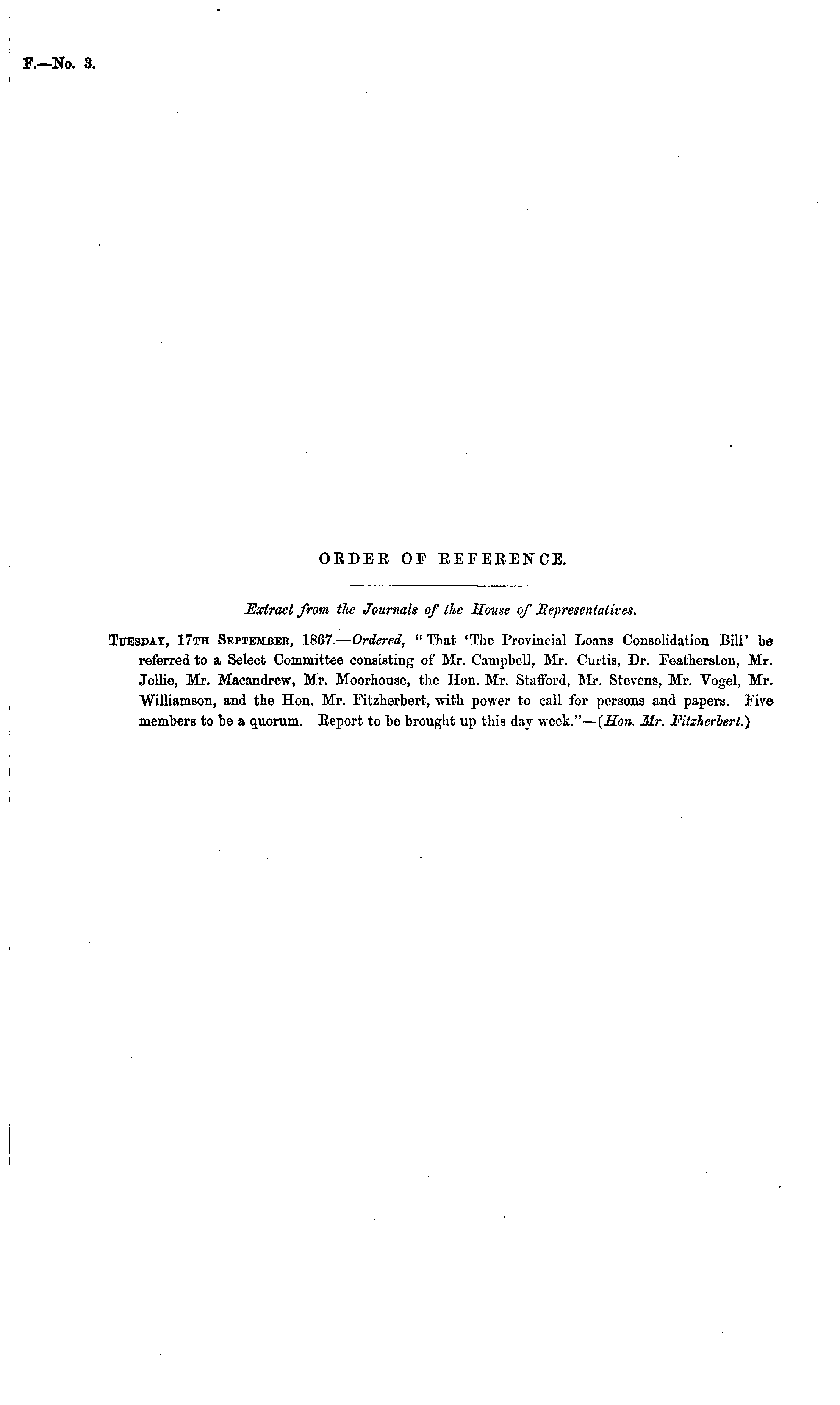 Extract from the Journals of the House of Bepresentatives. Tuesday, 17Tn Septembeb, 1867. — Ordered, "That 'The Provincial Loans Consolidation Bill' be referred to a Select Committee consisting of Mr. Campbell, Mr. Curtis, Dr. Featherston, Mr. Jollie, Mr. Macandrew, Mr. Moorhouse, the Hon. Mr. Stafford, Mr. Stevens, Mr. Vogcl, Mr. Williamson, and the Hon. Mr. Fitzherbert, with power to call for persons and papers. Five members to be a quorum. Eeport to be brought up this day week."— (Hon. Mr. Fiizherlert.)