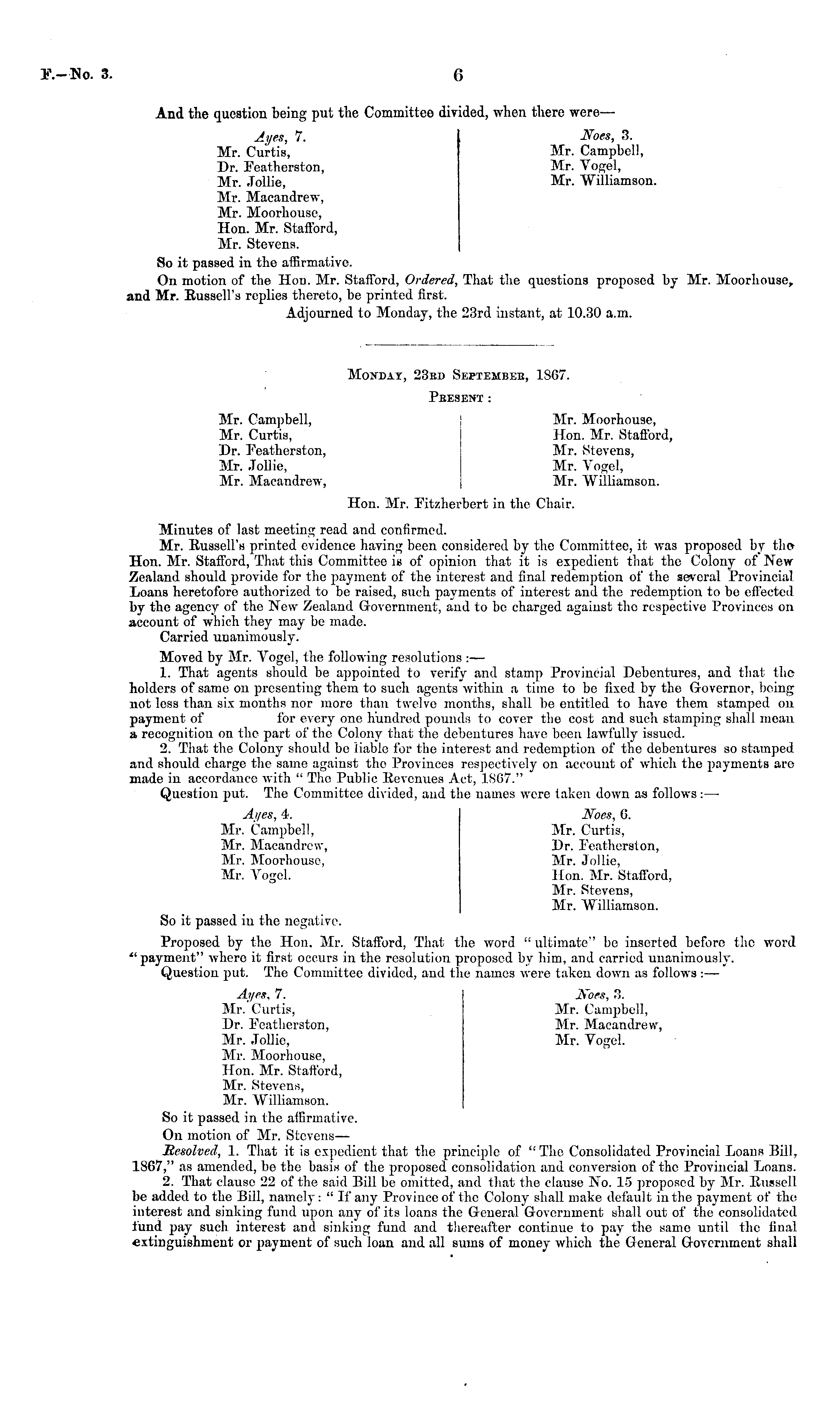 Monday, 23ed Septembeb, 1567. Peesent : Mr. Campbell, Mr. Moorhouse, Mr. Curtis, Hon. Mr. Stafford, Dr. Featherston, Mr. Stevens, Mr. .Tollie, Mr. \ Togel, Mr. Macandrew, Mr. AVilliamson. Hon. Mr. Fitzherbert in the Chair. Minutes of last meeting read and confirmed. Mr. Eussell's printed evidence having been considered by the Committee, it was proposed by the Hon. Mr. Stafford, That this Committee is of opinion that it is expedient that the Colony of New Zealand should provide for the payment of the interest and final redemption of the several Provincial Loans heretofore authorized to be raised, such payments of interest and the redemption to bo effected by the agency of the New Zealand Government, and to be charged against the respective Provinces on account of which they may be made. Carried unanimously. Moved by Mr. A^ogel, the following resolutions :— 1. That agents should he appointed to verify and stamp Provincial Debentures, and that the holders of same on presenting them to such agents within a time to be fixed by the Governor, being not less than six months nor more than twelve months, shall be entitled to have them stamped on payment of for every one hundred pound; to cover the cost and such stamping shall mean a recognition on the part of the Colony that the debentures have been lawfully' issued. 2. That the Colony should be liable for the interest and redemption of the debentures so stamped and should charge the same against the Provinces respectively on account of which the payments are made in accordance with " The Public Eevcnues Act, 1567." Question put. The Committee divided, and the names were taken down as follows:— Ayes, 4. Noes, 6. Mr. Campbell, Mr. Curtis, Mr. Macandrew, Dr. Featherston, Mr. Moorhouse, Mr. Jollie, Mr. VogeL Hon. Mr. Stafford, Mr. Stevens, Mr. AVilliamson. So it passed in the negative. Proposed by the Hon. Mr. Stafford, That the word "ultimate" be inserted before flic word "payment" where it first occurs in the resolution proposed by him, and carried unanimously. Question put. The Committee divided, and the names were taken down as follows: — Ayes, 7. Noes, 3. Mi-.'Curtis, Mr. Campbell, Dr. Featherston, Mr. Macandrew, Mr. Jollie, Mr. Vogel. Mr. Moorhouse, 11 on. Mr. Stafford, Mr. Stevens, Mr. Williamson. So it passed in the affirmative. On motion of Mr. Stevens— Resolved, 1. That it is expedient that the principle of "The Consolidated Provincial Loans Bill, 1867," as amended, be tho basis of the proposed consolidation and conversion of the Provincial Loans. 2. That clause 22 of the said Bill be omitted, and that the clause No. 15 proposed by Mr. Eussell be added to the Bill, namely: " If any Province of the Colony shall make default in the payment of the interest and sinking fund upon any of its loans the General Government shall out of the consolidated fund pay such interest and sinking fund and thereafter continue to pay the same until the final extinguishment or payment of such loan and all sums of money which the General Government shall