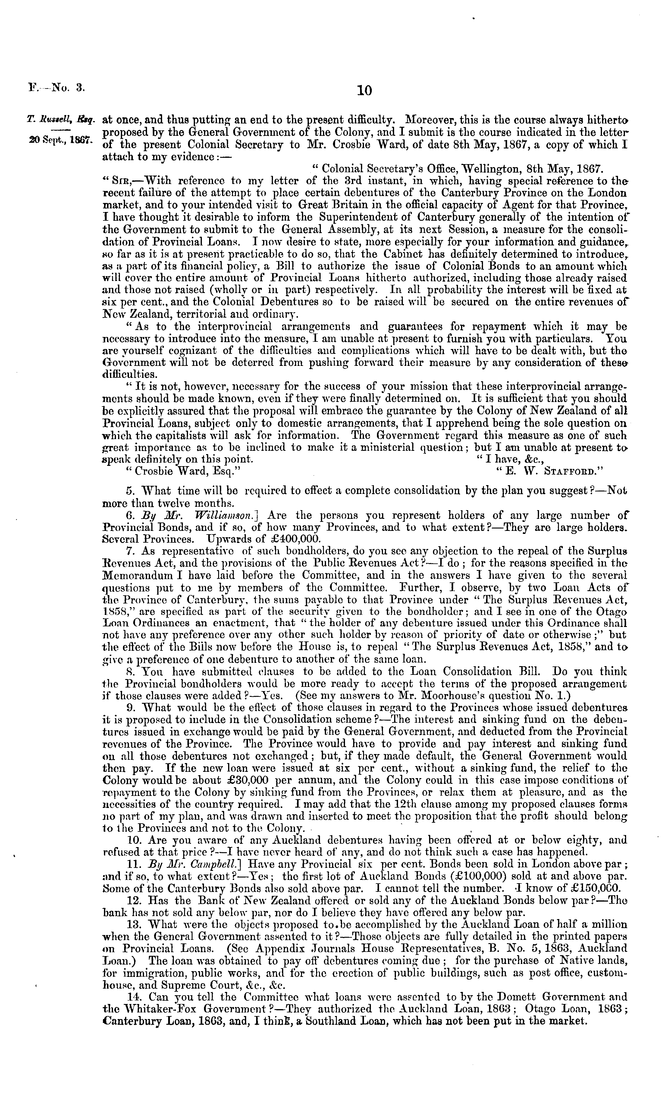 at once, and thus putting an end to the present difficulty. Moreover, this is the course always hitherto proposed by the General Government of the Colony, and I submit is the course indicated in the letter of the present Colonial Secretary to Mr. Crosbie AVard, of date Bth May, 1867, a copy of which 1 attach to my evidence : — " Colonial Secretary's Office, Wellington, Bth May, 1867. " 818, —AVith reference to my letter of the 3rd instant, in which, having special reference to the recent failure of the attempt to place certain debentures of the Canterbury Province on the London market, and to your intended visit to Great Britain in the official capacity of Agent for that Province, T have thought it desirable to inform the Superintendent of Canterbury generally of the intention of the Government to submit to the General Assembly, at its next Session, a measure for the consolidation of Provincial Loans. I now desire to state, more especially for your information and guidance, so far as it is at present practicable to do so, that the Cabinet has definitely determined to introduce, as a part of its financial policy, a Bill to authorize the issue of Colonial Bonds to an amount which will cover the entire amount of Provincial Loans hitherto authorized, including those already raised and those not raised (wholly or in part) respectively. In all probability the interest will be fixed at six per cent., and the Colonial Debentures'so to be raised will bo secured on the entire revenues of New Zealand, territorial and ordinary. "As to the interprovincial arrangements and guarantees for repayment which it may be necessary to introduce into the measure, lam unable at present to furnish you with particulars. You are yourself cognizant of the difficulties and complications which will have to be dealt with, but tho Government will not be deterred from pushing forward their measure by any consideration of these difficulties. " It is not, however, necessary for the success of your mission that these interprovincial arrangements should be made known, even if they were finally determined on. It is sufficient that you should be explicitly assured that the proposal will embrace the guarantee by the Colony of New Zealand of all Provincial Loans, subject only to domestic arrangements, that I apprehend being the sole question on which the capitalists will ask fur information. The Government regard this measure as one of such groat importance as to be inclined to make it a ministerial question; but I am unable at present tospeak definitely on this point. " I have, &c, " Crosbie Ward, Esq." " E. \V. Stapfoed." 5. AVhat time will bo required to effect a complete consolidation by the plan you suggest ?—Not more than twelve months. 6. By Mr. Williamson.] Are the persons you represent holders of any large number of Provincial Bonds, aud if so, of how many Provinces, and to what extent? —They are large holders. Several Provinces. Upwards of £100,000. 7. As representative of such bondholders, do you see any objection to the repeal of the Surplus Eevenues Act, and the provisions of the Public Eevenues Act?—l do ; for the reasons specified in the Memorandum I have laid before the Committee, and in the answers 1 have given to the several questions put to me by members of the Committee. Further, I observe, by two Loan Acts of the Province of Canterbury, the sums payable to that Province under "The Surplus Eevenues Act, 1858," are specified as part of the security given to the bondholder; and I see in one of the OtagO Loan Ordinances an enactment, that "the holder of any debenture issued under this Ordinance shall not have any preference over any other such holder by reason of priority of date or otherwise ;" but the effect of the Bills now before the House is, to repeal "The Surplus Eevenues Act, 1858," and to give a preference of one debenture to another of the same loan. S. You have submitted clauses to be added to the Loan Consolidation Bill. Do you think the Provincial bondholders would be more ready to accept the terms of the proposed arrangement if those clauses were added? —Yes. (See my answers to Mr. Moorhouse's question No. 1.) 9. AVhat would be the effect of those clauses in regard to the Provinces whose issued debentures it is proposed to include in the Consolidation scheme? —The interest and sinking fund on the debentures issued in exchange would be paid by the General Government, and deducted from the Provincial, revenues of the Province. The Province would have to provide aud pay interest and sinking fund on all those debentures not exchanged ; but, if they made default, the General Government would then pay. If the new loan were issued at six per cent., without a sinking fund, the relief to tho Colony would be about £30,000 per annum, and the Colony could in this case impose conditions of repayment to the Colony by sinking fund from tho Provinces, or relax them at pleasure, and as the necessities of the country required. I may add that the 12th clause among my proposed clauses forms no part of my plan, and was drawn and inserted to meet the proposition that the profit should belong to the Provinces and not to the Colony. 10. Are you i of any Auckland debentures having been offered at or below eighty, and refused at that price?—l have never heard of any, and do not think such a case has happened. 11. By Mr. Campbell.] Have any Provincial six per cent. Bonds been sold in London above par ; and if so, to what extent? —Yes; the first lot of Auckland Bonds (£100,000) sold at and above par. Some of the Canterbury Bonds also sold above par. I cannot tell the number. -I know of £150,000. 12. Has tho Bank of New Zealand offered or sold any of tho Auckland Bonds below par?— The bank has not sold any below par; nor do I believe they have offered any below par. 13. AVhat were the objects proposed to.be accomplished by the Auckland Loan of half a million when the General Governmeni assented to it?