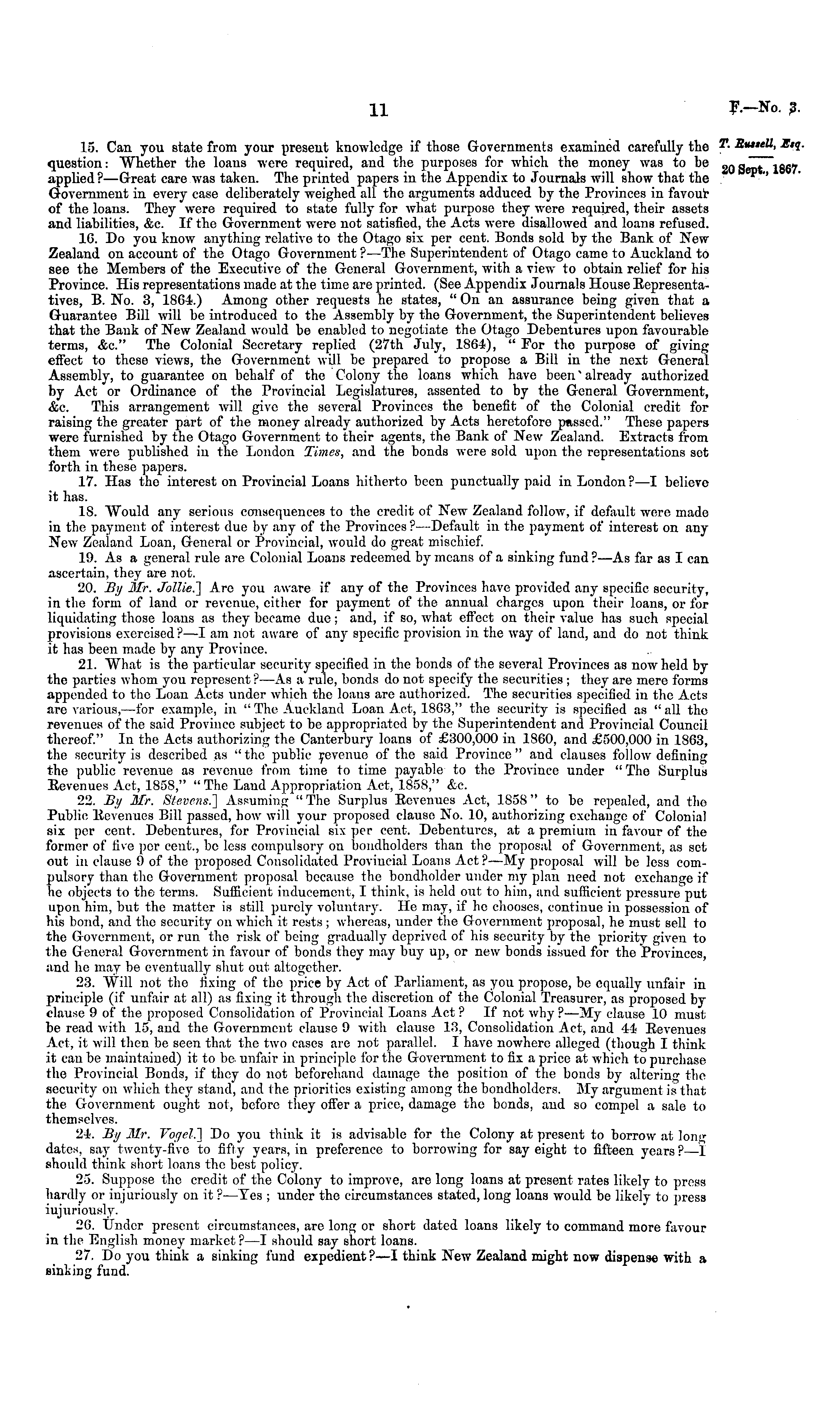 15. Can you state from your present knowledge if those Governments examined carefully the question: Whether the loans were required, and the purposes for which the money was to be applied?— Great care was taken. The printed papers in the Appendix to Journals will show that the Government in every case deliberately weighed all the arguments adduced by the Provinces in favour of the loans. They were required to state fully for what purpose they were required, their assets and liabilities, &c. If the Government were not satisfied, the Acts were disallowed and loans refused. 16. Do you know anything relative to the Otago six per cent. Bonds sold by the Bank of New Zealand on account of the Otago Government ? —The Superintendent of Otago came to Auckland to see the Members of the Executive of the General Government, with a view to obtain relief for his Province. His representations made at the time are printed. (See Appendix Journals House Bepresentatives, B. No. 3, 1864.) Among other requests he states, "On an assurance being given that a Guarantee Bill will be introduced to the Assembly by the Government, tho Superintendent believes that tho Bank of New Zealand would be enabled to negotiate the Otago Debentures upon favourable terms, Ac." The Colonial Secretary replied (27th July, 1864), " For the purpose of giving effect to these views, the Government wdl be prepared to propose a Bill in the next General Assembly, to guarantee on behalf of the Colony the loans which have been'already authorized by Act or Ordinance of the Provincial Legislatures, assented to by the General Government, &c. This arrangement will give the several Provinces the benefit of the Colonial credit for raising the greater part of the money already authorized by Acts heretofore passed." These papers were furnished by the Otago Government to their agents, the Bank of New Zealand. Extracts from them were published iv the London Times, and the bonds were sold upon the representations set forth in these papers. 17. Has the interest on Provincial Loans hitherto been punctually paid in London?—l believe it has. 18. AVould any serious consequences to the credit of New Zealand follow, if default were made in the payment of interest due by any of the Provinces ?—Default in the payment of interest on any New Zealand Loan, General or Provincial, would do great mischief. 19. As a general rule are Colonial Loans redeemed by r means of a sinking fund?—As far as I can ascertain, they are not. 20. By Mr. Jollie.] Are you aware if any of the Provinces have provided any specific security, in the form of land or revenue, cither for payment of the annual charges upon their loans, or for liquidating those loans as they became due; and, if so, what effect on their value has such special provisions exercised ?—I am not aware of any specific provision in the way of land, and do not think it has been made by any Province. 21. AVhat is the particular security specified in the bonds of the several Provinces as now held by the parties whom you represent? —As a rule, bonds do not specify the securities ; they are mere forms appended to the Loan Acts under which the loans are authorized. The securities specified in the Acts are various,—for example, in "The Auckland Loan Act, 1863," the security is specified as "all the revenues of the said Province subject to be appropriated by the Superintendent and Provincial Council thereof." In the Acts authorizing the Canterbury loans of £300,000 in 1860, and £500,000 in 1863, the security is described as "the public yevenue of the said Province" and clauses follow defining the public revenue as revenue from time to time payable to the Province under "The Surplus Eevenues .Act, 1858," "The Laud Appropriation Act, 1858," &c. 22. By Mr. Stevens.] Assuming "The Surplus Eevenues Act, 1858" to bo repealed, and the Public Eevenues Bill passed, how will your proposed clause No. 10, authorizing exchange of Colonial six per cent. Debentures, for Provincial six per cent. Debentures, at a premium in favour of the former of five per cent., bo less compulsory on bondholders than the proposal of Government, as set out in clause 9 of the proposed Consolidated Provincial Loans Act ? —My proposal will be less compulsory than the Government proposal because the bondholder under my plan need not exchange if lie objects to the terms. Sufficient inducement, I think, is held out to him, and sufficient pressure put upon him, but the matter is still purely voluntary. He may, if he chooses, continue in possession of his bond, and the security on which It rests ; whereas, under the Government proposal, he must sell to tho Government, or run tho risk of being gradually deprived of his security by the priority given to the General Government in favour of bonds they may buy up, or new bonds issued for the Provinces, and he may bo eventually shut out altogether. 23. Will not tho fixing of tho price by Act of Parliament, as you propose, be equally unfair in principle (if unfair at all) as fixing it through the discretion of the Colonial Treasurer, as proposed by clause 9of the proposed Consolidation of Provincial Loans Act? If not why?—My clause 10 must; be read with 15, and the Government clause 9 with clause 13, Consolidation Act, and 44 Eevenues Act, it will then be seen that the two cases are not parallel. I have nowhere alleged (though I think it can be maintained) it to be unfair in principle for the Government to fix a price at which to purchase the Provincial Bonds, if they do not beforehand damage the position of the bonds by altering the security on which they stand, and the priorities existing among the bondholders. My argument is that the Government ought not, before they offer a price, damage tho bonds, and so compel a sale to themselves. 24. By Mr. Vogel.] Do you think it is advisable for the Colony at present to borrow at Ion"--dales, say twenty-five to fifty years, in preference to borrowing for say ei