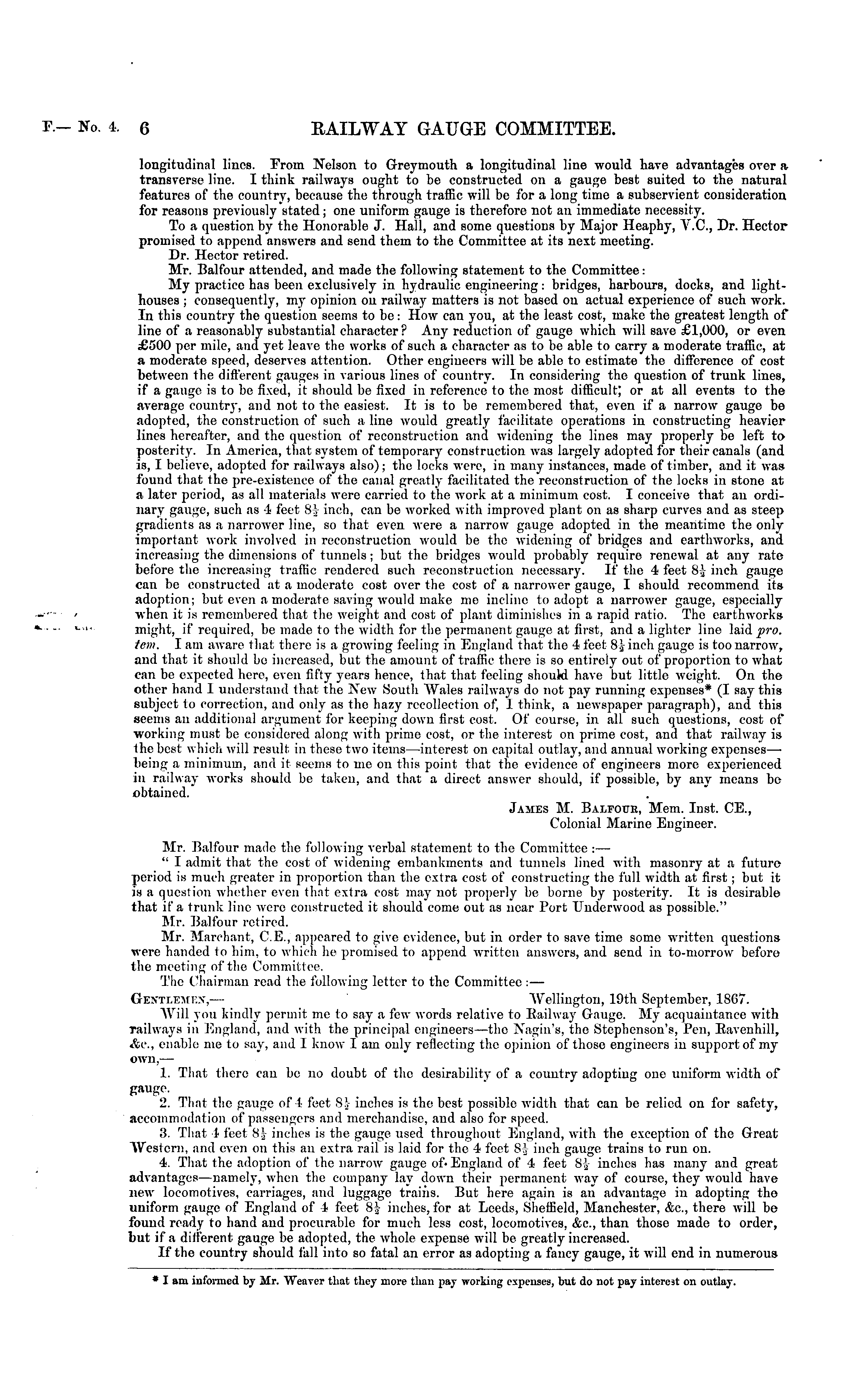 longitudinal lines. From Nelson to Greymouth a longitudinal line would have advantages over a transverse line. I think railways ought to be constructed on a gauge best suited to the natural features of the country, because the through traffic will be for a long time a subservient consideration for reasons previously stated; one uniform gauge is therefore not an immediate necessity. To a question by the Honorable J. Hall, and some questions by Major Heaphy, V.C, Dr. Hector promised to append answers and send them to the Committee at its next meeting. Dr. Hector retired. Mr. Balfour attended, and made the following statement to tho Committee: My practice has been exclusively in hydraulic engineering: bridges, harbours, docks, and lighthouses ; consequently, my opinion on railway matters is not based on actual experience of such work. In this country the question seems to be: How can you, at the least cost, make the greatest length of line of a reasonably substantial character? Any reduction of gauge which will save £1,000, or even £500 per mile, and yet leave the works of such a character as to be able to carry a moderate traffic, at a moderate speed, deserves attention. Other engineers will be able to estimate the difference of cost between the different gauges in various lines of country. In considering the question of trunk lines, if a gauge is to be fixed, it should be fixed in reference to the most difficult; or at all events to the average country, and not to the easiest. It is to be remembered that, even if a narrow gauge be adopted, the construction of such a line would greatly facilitate operations in constructing heavier lines hereafter, and the question of reconstruction and widening the lines may properly be left to posterity. In America, that system of temporary construction was largely adopted for their canals (and is, I believe, adopted for railways also); the locks were, in many instances, made of timber, and it was found that the pre-existence of the canal greatly facilitated the reconstruction of the locks in stone at a later period, as all materials were carried to the work at a minimum cost. I conceive that an ordinary gauge, such as 4 feet 81 inch, can be worked with improved plant on as sharp curves and as steep gradients as a narrower line, so that even were a narrow gauge adopted in the meantime the only important work involved in reconstruction would be the widening of bridges and earthworks, and increasing the dimensions of tunnels; but the bridges would probably require renewal at any rate before the increasing traffic rendered such reconstruction necessary. If the 4 feet Si inch gauge can be constructed at a moderate cost over the cost of a narrower gauge, I should recommend its adoption; but even a moderate saving would make me incline to adopt a narrower gauge, especially when it is remembered that the weight and cost of plant diminishes in a rapid ratio. The earthworks might, if required, be made to the width for the permanent gauge at first, and a lighter line laid pro. tern. lam aware that there is a growing feeling in England that tho 4 feet Scinch gauge is too narrow, and that it should be increased, but the amount of traffic there is so entirely out of proportion to what can be expected here, even fifty years hence, that that feeling should have but little weight. On tho other hand I understand that the New South Wales railways do not pay running expenses* (I say this subject to correction, and only as the hazy recollection of, 1 think, a newspaper paragraph), and this seems an additional argument for keeping down first cost. Of course, in all such questions, cost of working must be considered along with prime cost, or the interest on prime cost, and that railway is the best which will result in these two items —interest on capital outlay, and annual working expenses — being a minimum, and it seems to me on this point that the evidence of engineers more experienced in railway works should be taken, and that a direct answer should, if possible, by any means be obtained. James M. Balfoub, Mem. Inst. CE., Colonial Marine Engineer. Mr. Balfour made the following verbal statement to the Committee : — " I admit that the cost of widening embankments and tunnels lined with masonry at a future period is much greater in proportion than the extra cost of constructing the full width at first; but it is a question whether even that extra cost may not properly be borne by posterity. It is desirable that if a trunk line were constructed it should come out as near Port Underwood as possible." Mr. Balfour retired. Mr. Marchant, C.E., appeared to give evidence, but in order to save time some written questions were handed to him, to which he promised to append w-ritten answers, and send in to-morrow before the meeting ofthe Committee. The Chairman read the following letter to the Committee : — &KSTLSMXB, — Wellington, 19th September, 1867. Will you kindly permit me to say a few words relative to Railway Gauge. My acquaintance with railways in England, and with the principal engineers—tho Nagin's, the Stephenson's, Pen, Bavcnhill, Ac, enable me to say, and I know I am only reflecting the opinion of those engineers in support of my own, — 1. That there can be no doubt of the desirability of a country adopting one uniform width of gauge. 2. That the gauge of 1 feet 8J inches is the best possible width that can be relied on for safety, accommodation of passengers and merchandise, and also for speed. 3. That 4 feet 8?, inches is the gauge used throughout England, with the exception of tho Great Western, and even on this an extra rail is laid for the 4 feet 8$ inch gauge trains to run on. 4. That the adoption of the narrow gauge of- England of 4 feet S{- inches has many and great advantages —namely, when the company lay down their permanent way of course, they would have new locomotives, carriages, and luggage trains. But hero again is an advantage in adopting 