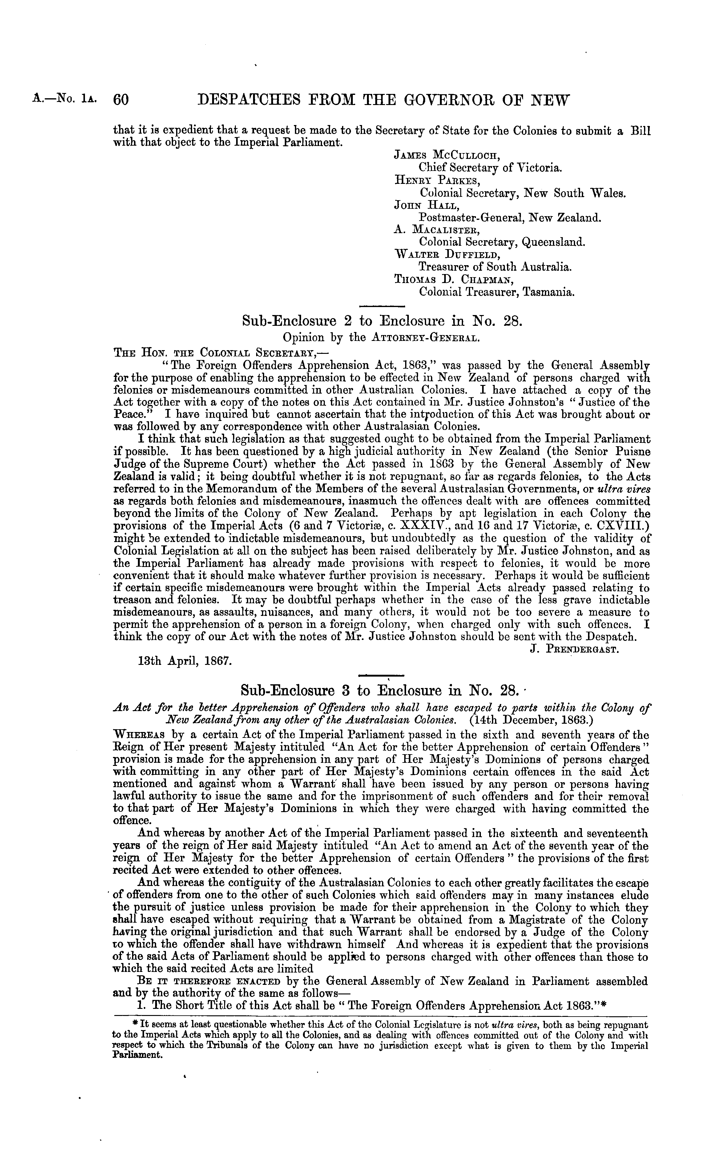Sub-Enclosure 2 to Enclosure in No. 28. Opinion by the Attornet-Generae. The Hon. the Colonial Secretart, — "The Foreign Offenders Apprehension Act, 1863," was passed by the General Assembly for the purpose of enabling the apprehension to be effected in New Zealand of persons charged with felonies or misdemeanours committed in other Australian Colonies. I have attached a copy of the Act together with a copy of tho notes on this Act contained in Mr. Justice Johnston's " Justice of the Peace." I have inquired but cannot ascertain that the introduction of this Act was brought about or was followed by any correspondence with other Australasian Colonies. I think that such legislation as that suggested ought to be obtained from the Imperial Parliament if possible. It has been questioned by a high judicial authority in New Zealand (the Senior Puisne Judge of the Supreme Court) whether the Act passed in 1863 by the General Assembly of New Zealand is valid; it being doubtful whether it is not repugnant, so far as regards felonies, to the Acts referred to in the Memorandum of tho Members of the several Australasian Governments, or ultra vires as regards both felonies and misdemeanours, inasmuch the offences dealt with are offences committed beyond the limits of tho Colony of New Zealand. Perhaps by apt legislation in each Colony the provisions of the Imperial Acts (6 and 7 Victoria?, c. XXXIV., and 16 and 17 Victoria^, c. CXVIIL) might be extended to indictable misdemeanours, but undoubtedly as the question of the validity of Colonial Legislation at all on the subject has been raised deliberately by Mr. Justice Johnston, and as the Imperial Parliament has already made provisions with respect to felonies, it would be more convenient that it should make whatever further provision is necessary. Perhaps it would be sufficient if certain specific misdemeanours were brought within the Imperial Acts already passed relating to treason and felonies. It may be doubtful perhaps whether in the case of the less grave indictable misdemeanours, as assaults, nuisances, and many others, it would not be too severe a measure to permit tho apprehension of a person in a foreign Colony, when charged only with such offences. I think the copy of our Act with the notes of Mr. Justice Johnston should be sent with the Despatch. J. Prendergast. 13th April, 1867.