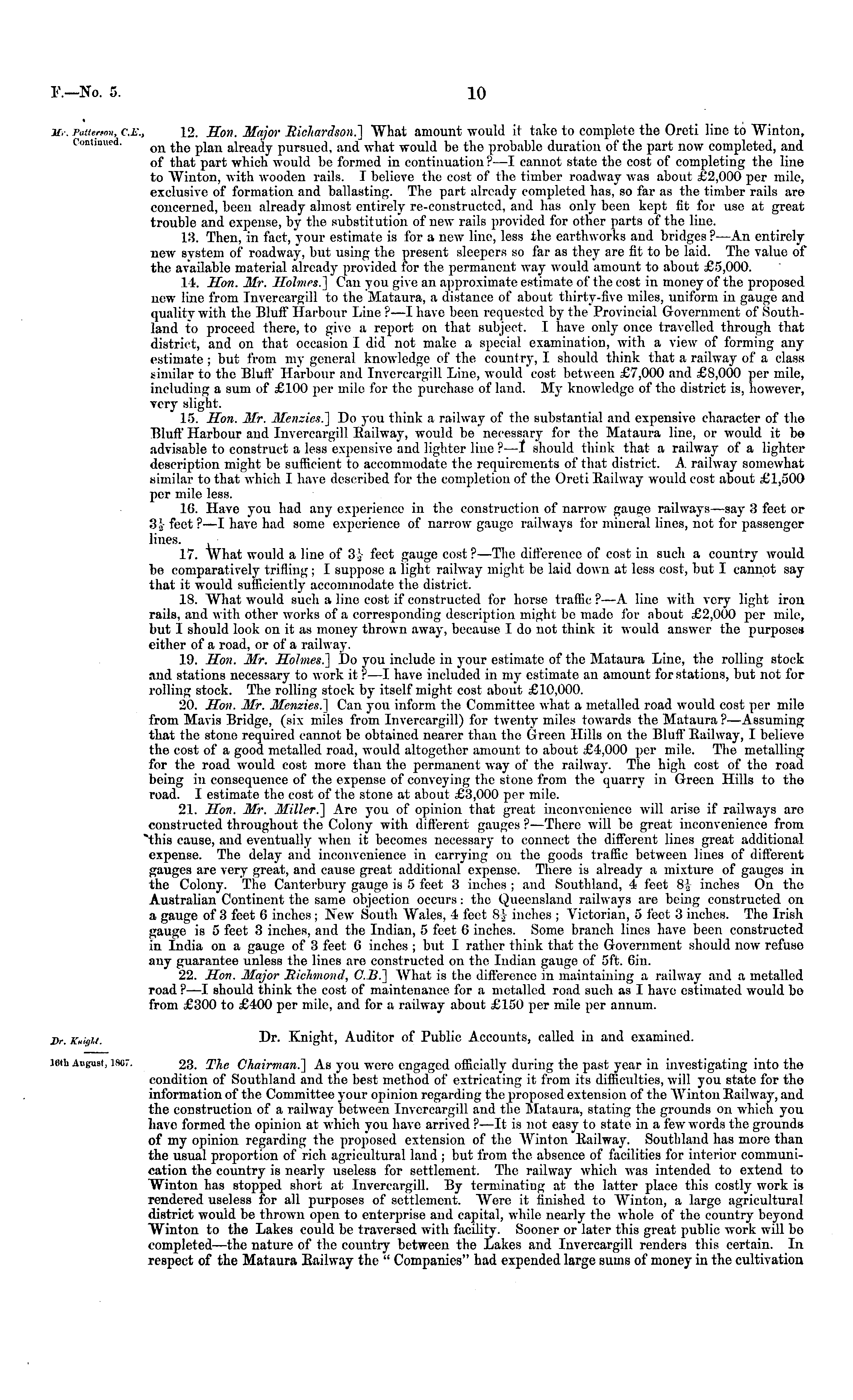 12. Hon. Major Richardson.] What amount would it take to complete the Oreti line to Winton, on the plan already pursued, and what would be the probable duration of the part now completed, and of that part which would be formed in continuation P —l cannot state the cost of completing the line to Winton, with wooden rails. I believe the cost of the timber roadway was about £2,000 per mile, exclusive of formation and ballasting. The part already completed has, so far as the timber rails are concerned, been already almost entirely re-constructed, and has only been kept fit for use at great trouble and expense, by the substitution of new rails provided for other parts of the line. 13. Then, in fact, your estimate is for a new line, less the earthworks and bridges ?—An entirely new system of roadway, but using the present sleepers so far as they are fit to be laid. The value of the available material already provided for the permanent way would amount to about £5,000. 11. Hon. Mr. Holmes.] Can you give an approximate estimate of the cost in money of the proposed new line from Invercargill to the Mataura, a distance of about thirty-five miles, uniform in gauge and quality with the Bluff Harbour Line ?—I have been requested by the Provincial Government of Southland to proceed there, to give a report on that subject. I have only once travelled through that district, and on that occasion I did not make a special examination, with a view of forming any estimate; but from my general knowledge of the country, I should think that a railway of a class similar to the Bluff Harbour and Invercargill Line, would cost between £7,000 and £S,OOO per mile, including a sum of £100 per mile for the purchase of land. My knowledge of the district is, however, very slight. 15. Hon. Mr. Menzies.] Do you think a railway of the substantial and expensive character of the Bluff Harbour and Invercargill Eailway, would be necessary for the Mataura line, or would it be advisable to construct a less expensive and lighter line ? — 1 should think that a railway of a lighter description might be sufficient to accommodate the requirements of that district. A railway somewhat similar to that which I have described for the completion of the Oreti Eailway would cost about £1,500 per mile less. 16. Have you had any experience in the construction of narrow gauge railways—say 3 feet or 3i-feet? —I have had some experience of narrow gauge railways for mineral lines, not for passenger lines. 17. What would a line of 3$ feet gauge cost ?—The difference of cost in such a country would he comparatively trifling ; I suppose a light railway might be laid down at less cost, but I cannot say that it would sufficiently accommodate the district. 18. What would such a line cost if constructed for horse traffic ?—A line with very light iron rails, and with other works of a corresponding description might be made for about £2,000 per mile, but I should look on it as money thrown away, because I do not think it would answer the purposes either of a road, or of a railway. 19. Hon. Mr. Holmes.] Do you include in your estimate of the Mataura Line, the rolling stock and stations necessary to work it ?—I have included in my estimate an amount for stations, but not for rolling stock. The rolling stock by itself might cost about £10,000. 20. Hon. Mr. Menzies.] Can you inform the Committee what a metalled road would cost per mile from Mavis Bridge, (six miles from Invercargill) for twenty miles towards the Mataura ?—Assuming that the stone required cannot be obtained nearer than the Green Hills on the Bluff Eailway, I believe tho cost of a good metalled road, would altogether amount to about £4,000 per mile. The metalling for the road would cost more than the permanent way of the railway. The high cost of the road being in consequence of the expense of conveying the stone from the quarry in Green Hills to tho road. I estimate the cost of the stone at about £3,000 per mile. 21. Hon. Mr. Miller.] Are you of opinion that great inconvenience will arise if railways are constructed throughout the Colony with different gauges?— There will be great inconvenience from "this cause, and eventually when it becomes necessary to connect the different lines great additional expense. The delay and inconvenience in carrying on tho goods traffic between lines of different gauges are very great, and cause great additional expense. There is already a mixture of gauges in the Colony. The Canterbury gauge is 5 feet 3 inches ; and Southland, 4 feet 8J inches On the Australian Continent the same objection occurs: the Queensland railways are being constructed on a gauge of 3 feet 6 inches ; New South Wales, 4 feet &£ inches ; Victorian, 5 feet 3 inches. The Irish gauge is 5 feet 3 inches, and the Indian, 5 feet 6 inches. Some branch lines have been constructed in India on a gauge of 3 feet 6 inches ; but I rather think that the Government should now refuse any guarantee unless the lines are constructed on the Indian gauge of sft. 6iu. 22. Hon. Major Richmond, C.B.] What is the difference in maintaining a railway and a metalled road ? —I should think the cost of maintenance for a metalled road such as I have estimated would be from £300 to £400 per mile, and for a radway about £150 per mile per annum. Dr. Knight, Auditor of Public Accounts, called in and examined. 23. The Chairman.] As you were engaged officially during the past year in investigating into the condition of Southland and the best method of extricating it from its difficulties, will you state for the information of the Committee your opinion regarding the proposed extension of the Winton Eailway, and the construction of a railway between Invercargill and the Mataura, stating the grounds on which you have formed the opinion at which you have arrived ? —lt is not easy to state in a few words the grounds of my opinion regarding the proposed extension of the Winton Eailway. Southlan