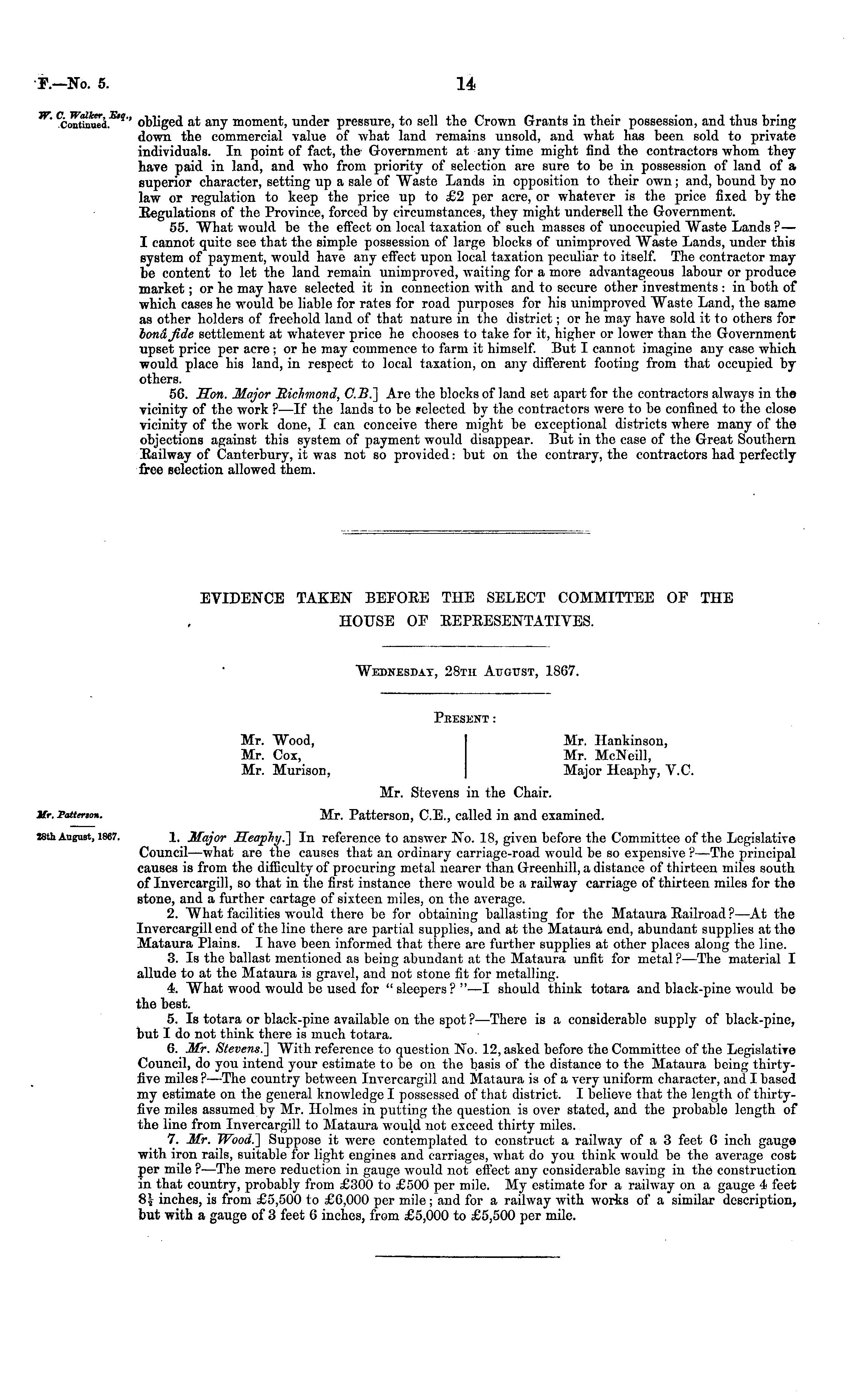 EVIDENCE TAKEN BEFOEE THE SELECT COMMITTEE OF THE HOUSE OF EEPEESENTATIVES. Wednesday, 28th August, 1867. Peesent: Mr. Wood, Mr. Hankinson, Mr. Cox, Mr. McNeill, Mr. Murison, Major Heaphy, V.C. Mr. Stevens in the Chair. Mr. Patterson, C.E., called in and examined. 1. Major Heaphy?] In reference to answer No. 18, given before the Committee of the Legislative Council —what are the causes that an ordinary carriage-road would be so expensive ?—The principal causes is from the difficulty of procuring metal nearer than Greenhill, a distance of thirteen miles south of Invercargill, so that in the first instance there would be a railway carriage of thirteen miles for the stone, and a further cartage of sixteen miles, on the average. 2. What facilities would there be for obtaining ballasting for the Mataura Eailroad ?—At the Invercargill end of the line there are partial supplies, and at the Mataura end, abundant supplies at the Mataura Plains. I have been informed that there are further supplies at other places along the line. 3. Is the ballast mentioned as being abundant at the Mataura unfit for metal ? —The material I allude to at the Mataura is gravel, and not stone fit for metalling. 4. What wood would be used for "sleepers?" —I should think totara and black-pine would be the best. 5. Is totara or black-pine available on the spot ? —There is a considerable supply of black-pine, but I do not think there is much totara. 6. Mr. Stevens.] With reference to question No. 12, asked before the Committee of the Legislative Council, do you intend your estimate to be on the basis of the distance to the Mataura being thirtyfive miles ?—The country between Invercargill and Mataura is of a very uniform character, and I based my estimate on the general knowledge I possessed of that district. I believe that the length of thirtyfive miles assumed by Mr. Holmes in putting the question is over stated, and the probable length of the line from Invercargill to Mataura would not exceed thirty miles. 7. Mr. Wood.] Suppose it were contemplated to construct a railway of a 3 feet 6 inch gauge with iron rails, suitable for light engines and carriages, what do you think would be the average cost per mile ?—The mere reduction in gauge would not effect any considerable saving in the construction in that country, probably from £300 to £500 per mile. My estimate for a railway on a gauge 4 feet S\ inches, is from £5,500 to £6,000 per mile ; and for a railway with works of a similar description, but with a gauge of 3 feet 6 inches, from £5,000 to £5,500 per mile.