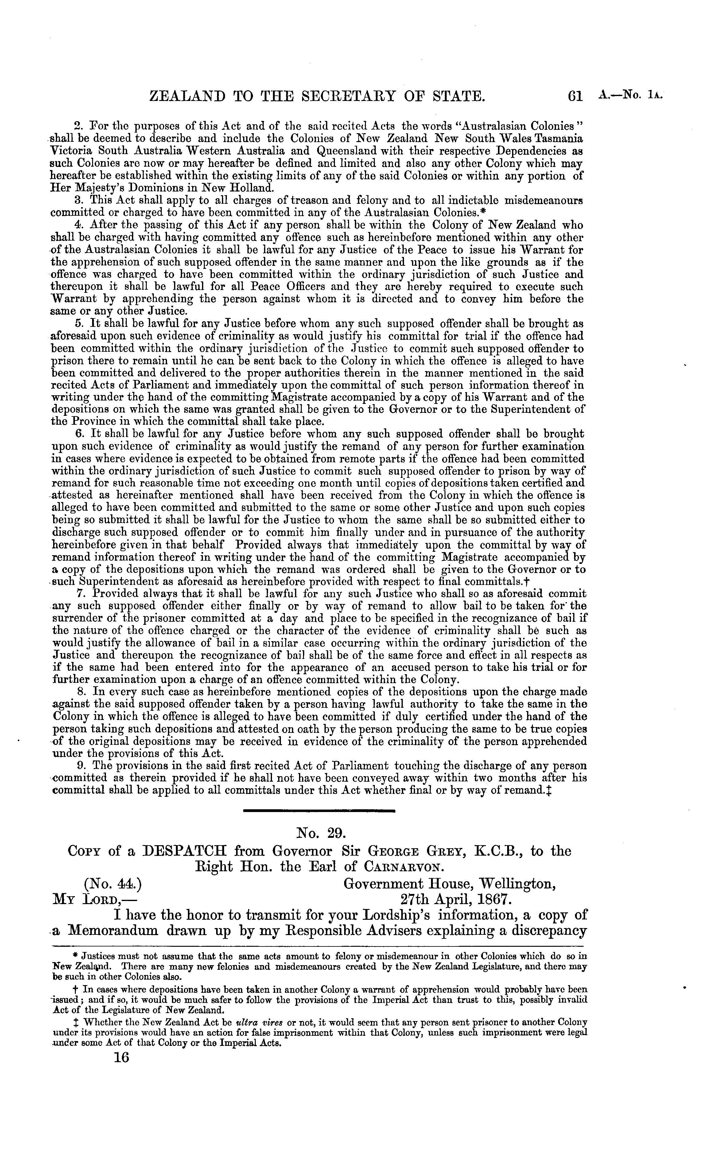No. 29. Copy of a DESPATCH from Governor Sir George Grey, K.C.8., to the Right Hon. the Earl of Carnarvon. (No. 44.) Government House, Wellington, My Lord,— 27th April, 1867. I have the honor to transmit for your Lordship's information, a copy of a Memorandum drawn up by my Responsible Advisers explaining a discrepancy * Justices must not assume that the same acts amount to felony or misdemeanour in other Colonies which do so in New ZeaUmd. There are many new felonies and misdemeanours created by the New Zealand Legislature, and there may be such in other Colonies also. f In cases where depositions have been taken in another Colony a warrant of apprehension would probably hare been issued; aud if so, it would be much safer to follow the provisions of the Imperial Act than trust to this, possibly invalid Act of the Legislature of New Zealand. J Whether the New Zealand Act be ultra vires or not, it would seem that any person sent prisoner to another Colony under its provisions would have an action for false imprisonment within that Colony, unless such imprisonment were legal under some Act of that Colony or tho Imperial Acts. 16