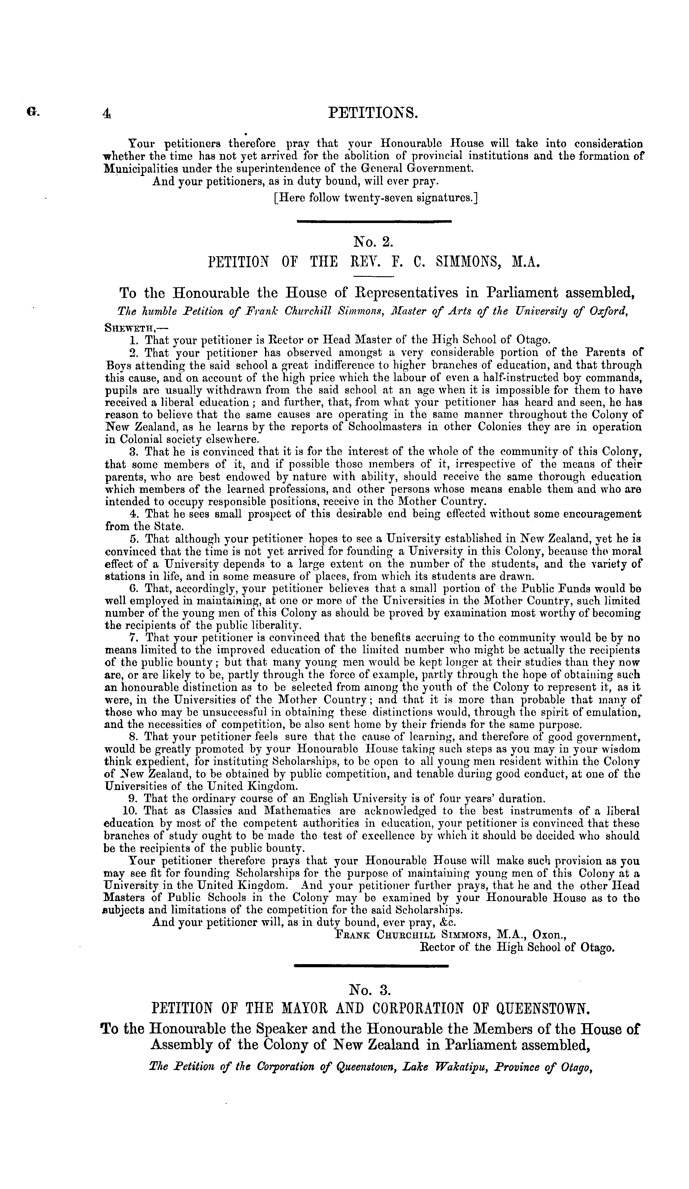 No. 2. PETITION OE THE REY. F. C. SIMMONS, M.A. To the Honourable the House of Representatives in Parliament assembled, The humble Petition of Frank Churchill Simmons, Master of Arts of the University of Oxford, Sheweth,— 1. That your petitioner is Rector or Head Master of the High School of Otago. 2. That your petitioner has observed amongst a very considerable portion of the Parents of Boys attending the said school a great indifference to higher branches of education, and that through this cause, and on account of the high price which the labour of even a half-instructed boy commands, pupils are usually withdrawn from the said school at an age when it is impossible for them to have received a liberal education ; and further, that, from what your petitioner has heard and seen, he has reason to believe that tho same causes are operating in the same manner throughout tho Colony of New Zealand, as he learns by the reports of Schoolmasters in other Colonies they are in operation in Colonial society elsewhere. 3. That he is convinced that it is for the interest of the whole of the community of this Colony, that some members of it, and if possible those members of it, irrespective of the means of their parents, who are best endowed by nature with ability, should receive the same thorough education which members of the learned professions, and other persons whose means enable them and who are intended to occupy responsible positions, receive in the Mother Country. 4. That he sees small prospect of this desirable end being effected without some encouragement from the State. 5. That although your petitioner hopes to see a University established in New Zealand, yet he is convinced that the time is not yet arrived for founding a University in this Colony, because the moral effect of a University depends to a large extent on the number of the students, and the variety of stations in life, and in some measure of places, from which its students are drawn. 0. That, accordingly, your petitioner believes that a small portion of the Public Funds would bo well employed in maintaining, at one or more of the Universities in the Mother Country, such limited number of the young men of this Colony as should be proved by examination most worthy of becoming the recipients of the public liberality. 7. That your petitioner is convinced that tho benefits accruing to the community would be by no means limited to the improved education of the limited number who might be actually the recipients of the public bouuty; but that many young men would be kept longer at their studies than they now are, or are likely to be, partly through the force of example, partly through the hope of obtaining such an honourable distinction as to be selected from among the youth of the Colony to represent it, as it ■were, in the Universities of the Mother Country; and that it is more than probable that many of those who may be unsuccessful in obtaining these distinctions would, through the spirit of emulation, and the necessities of competition, be also sent home by their friends for the same purpose. 8. That your petitioner feels sure that the cause of learning, and therefore of good government, would be greatly promoted by your Honourable House taking such steps as you may in your wisdom think expedient, for instituting Scholarships, to be open to all young men resident within the Colony of New Zealand, to be obtained by public competition, and tenable during good conduct, at one of the Universities of the United Kingdom. 9. That the ordinary course of an English University is of four years' duration. 10. That as Classics and Mathematics are acknowledged to the best instruments of a liberal education by most of the competent authorities in education, your petitioner is convinced that these branches of study ought to be made the test of excellence by which it should be decided who should be the recipients of the public bounty. Tour petitioner therefore prays that your Honourable House will make such provision as you may see fit for founding Scholarships for the purpose of maintaining young men of this Colony at a University in the United Kingdom. And your petitioner further prays, that he and the other Head Masters of Public Schools in the Colony may be examined by your Honourable House as to tho subjects and limitations of the competition for the said Scholarships. And your petitioner will, as in duty bound, ever pray, &c. Feank Ciiukciiill Simmons, M.A., Oxon., Rector of the High School of Otago.