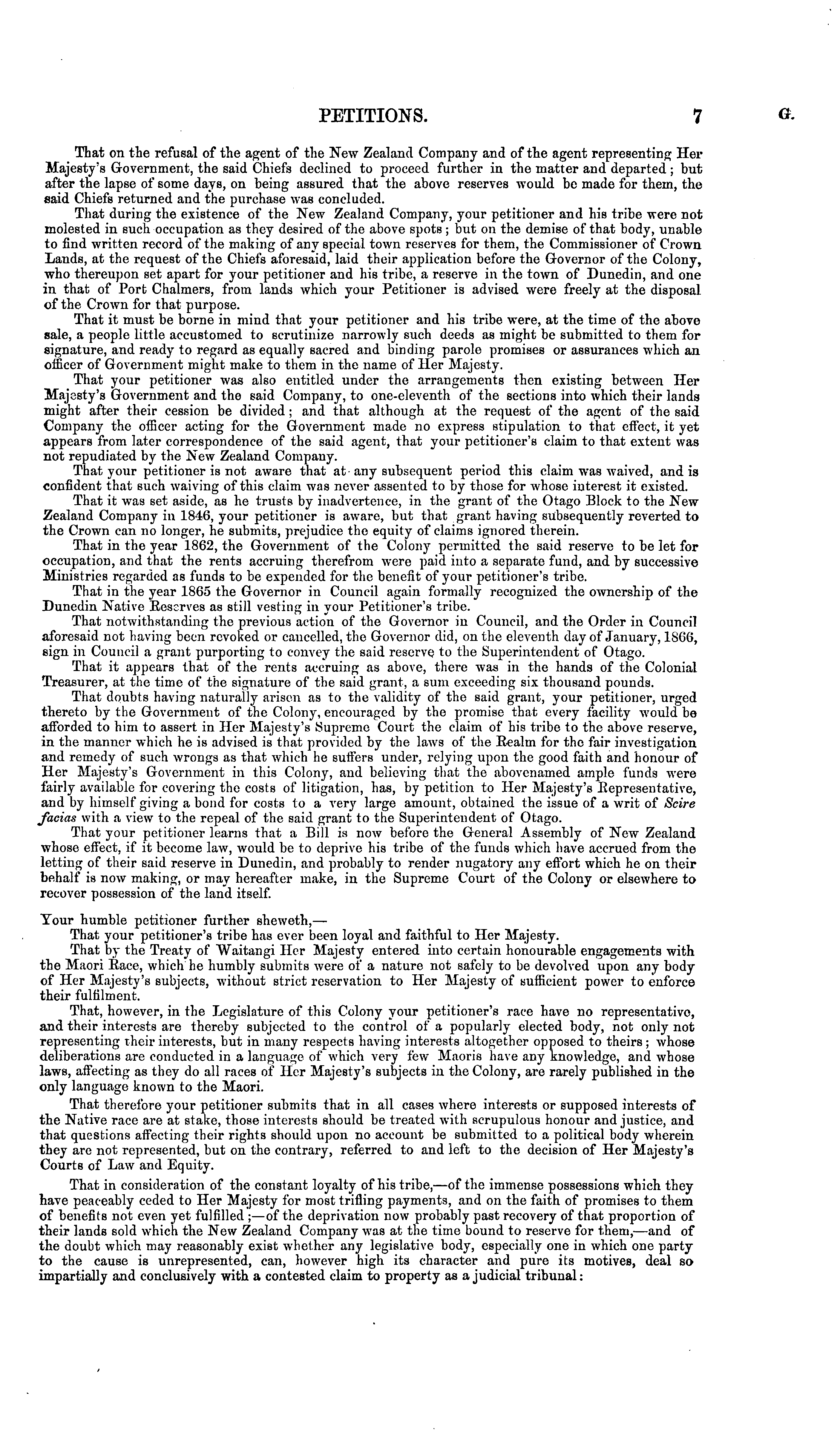 That on the refusal of the agent of the New Zealand Company and of the agent representing Her Majesty's Government, the said Chiefs declined to proceed further in the matter and departed ; but after the lapse of some days, on being assured that the above reserves would be made for them, the said Chiefs returned and tho purchase was concluded. That during the existence of the New Zealand Company, your petitioner and his tribe were not molested in such occupation as they desired of the above spots; but on the demise of that body, unable to find written record of the making of anv special town reserves for them, the Commissioner of Crown Lands, at the request of the Chiefs aforesaid, laid their application before the Governor of the Colony, who thereupon set apart for your petitioner and his tribe, a reserve in the town of Dunedin, and one in that of Port Chalmers, from lands which your Petitioner is advised were freely at the disposal of the Crown for that purpose. That it must be borne in mind that your petitioner and his tribe were, at tho time of the above sale, a people little accustomed to scrutinize narrowly such deeds as might be submitted to them for signature, and ready to regard as equally sacred and binding parole promises or assurances which an officer of Government might make to them in the name of Her Majesty. That your petitioner was also entitled under the arrangements then existing between Her Majesty's Government and the said Company, to one-eleventh of the sections into which their lands might after their cession be divided ; and that although at the request of the agent of the said Company the officer acting for the Government made no express stipulation to that effect, it yet appears from later correspondence of the said agent, that your petitioner's claim to that extent was not repudiated by the New Zealand Company. That your petitioner is not aware that at any subsequent period this claim was waived, and is confident that such waiving of this claim was never assented to by those for whose interest it existed. That it was set aside, as he trusts by inadvertence, in the grant of the Otago Block to the New Zealand Company in 1846, your petitioner is aware, but that grant having subsequently reverted to the Crown can no longer, he submits, prejudice the equity of claims ignored therein. That in the year 1862, tho Government of the Colony permitted the said reserve to be let for occupation, and that the rents accruing therefrom were paid into a separate fund, and by successive Ministries regarded as funds to be expended for the benefit of your petitioner's tribe. That in the year 1865 the Governor in Council again formally recognized the ownership of the Dunedin Native Reserves as still vesting in your Petitioner's tribe. That notwithstanding the previous action of the Governor in Council, and the Order in Council aforesaid not having been revoked or cancelled, the Governor did, on the eleventh day of January, 1866, sign in Council a grant purporting to convey the said reserve to the Superintendent of Otago. That it appears that of the rents accruing as above, there was in the hands of the Colonial Treasurer, at the time of the signature of the said grant, a sum exceeding six thousand pounds. That doubts having naturally arisen as to the validity of the said grant, your petitioner, urged thereto by the Government of the Colony, encouraged by the promise that every facility would be afforded to him to assert in Her Majesty's Supremo Court the claim of his tribe to the above reserve, in tho manner which he is advised is that provided by the laws of the Realm for the fair investigation and remedy of such wrongs as that which he suffers under, relying upon the good faith and honour of Her Majesty's Government in this Colony, and believing that the abovenamed ample funds were fairly available for covering the costs of litigation, has, by petition to Her Majesty's Representative, and by himself giving a bond for costs to a very large amount, obtained the issue of a writ of Scire facias with a view to the repeal of the said grant to the Superintendent of Otago. That your petitioner learns that a Bill is now before the General Assembly of New Zealand whoso effect, if it become law, would be to deprive his tribe of the funds which have accrued from the letting of their said reserve in Dunedin, and probably to render nugatory any effort which he on their behalf is now making, or may hereafter make, in the Supreme Court of the Colony or elsewhere to recover possession of the land itself. Your humble petitioner further sheweth, — That your petitioner's tribe has ever been loyal and faithful to Her Majesty. That by the Treaty of Waitangi Her Majesty entered into certain honourable engagements with the Maori Race, which he humbly submits were of a nature not safely to be devolved upon any body of Her Majesty's subjects, without strict reservation to Her Majesty of sufficient power to enforce their fulfilment. That, however, in the Legislature of this Colony your petitioner's race have no representative, and their interests are thereby subjected to the control of a popularly elected body, not only not representing their interests, but in many respects having interests altogether opposed to theirs; whose deliberations are conducted in a language of which very few Maoris have any knowledge, and whose laws, affecting as they do all races of Her Majesty's subjects in the Colony, are rarely published in the only language known to the Maori. That therefore your petitioner submits that in all cases where interests or supposed interests of the Native race are at stake, those interests should be treated with scrupulous honour and justice, and that questions affecting their rights should upon no account be submitted to a political body wherein they are not represented, but on the contrary, referred to and left to the decision of Her Majesty's Courts of Law and Equity. That in consideration of t