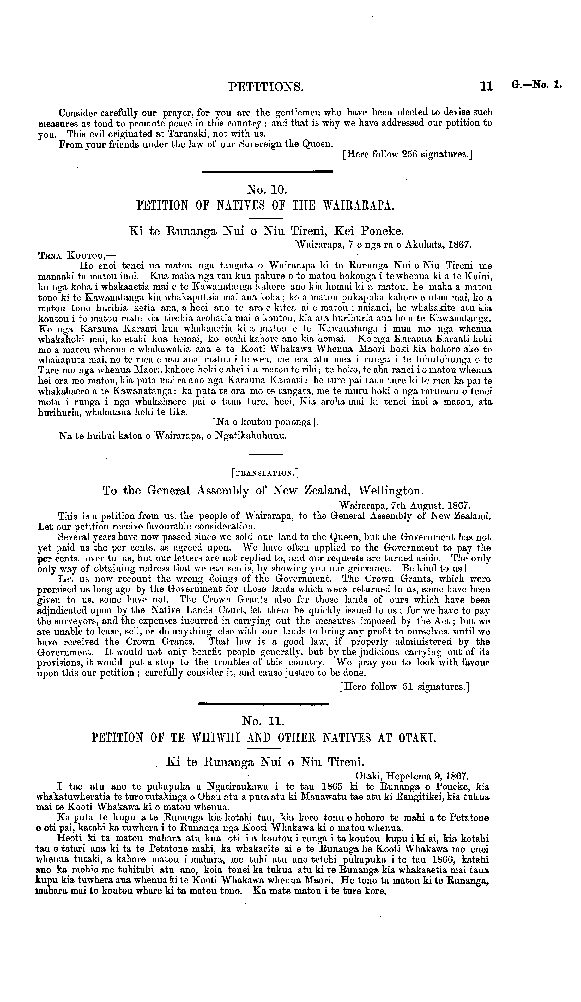 [translation.] To the General Assembly of New Zealand, "Wellington. Wairarapa, 7th August, 1867. This is a petition from us. the people of Wairarapa, to the General Assembly of New Zealand. Let our petition receive favourable consideration. Several years have now passed since we sold our land to the Queen, but the Government has not yet paid us the per cents, as agreed upon. We have often applied to the Government to pay the per cents, over to us, but our letters arc not replied to, and our requests are turned aside. The only only way of obtaining redress that we can see is, by showing you our grievance. Be kind to us! Let us now recount the wrong doings of the Government. Tho Crown Grants, which were promised us long ago by the Government for those lands which were returned to us, some have been given to us, some have not. The Crown Grants also for those lands of ours which have been adjndicated upon by the Native Lands Court, let them be quickly issued to us ; for we have to pay the surveyors, and the expenses incurred iu carrying out the measures imposed by the Act; but we are unable to lease, sell, or do anything else with our lands to bring any profit to ourselves, until we have received the Crown Grants. That law is a good law, if properly administered by the Government. It would not only benefit people generally, but by the judicious carrying out of its provisions, it would put a stop to the troubles of this country. We pray you to look with favour upon this our petition ; carefully consider it, and cause justice to be done. [Here follow 51 signatures.]
