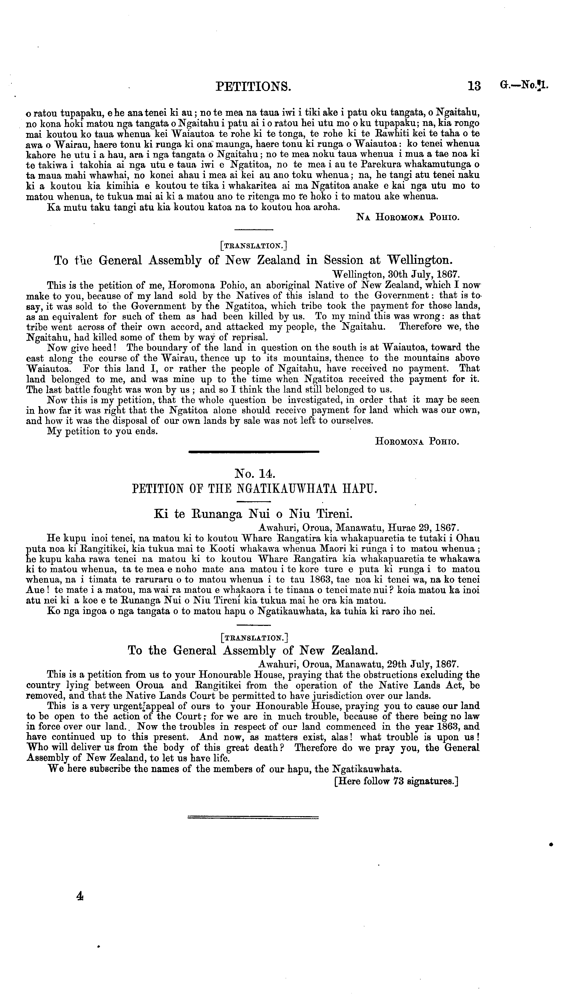 o ratou tupapaku, ehe ana tenei ki au; no te mea na taua iwi i tiki ake i patu oku tangata, o Ngaitahu, no kona hoki matou nga tangata o Ngaitahu i patu ai i o ratou hei utu mo o ku tupapaku; na, kia rongo mai koutou ko taua whenua kei Waiautoa te rohe ki te tonga, te rohe ki te Rawhiti kei te taha o te awa o Wairau, haere tonu ki runga ki ona maunga, haere tonu ki runga o Waiautoa: ko tenei whenua kahore he utu i a hau, ara i nga tangata o Ngaitahu; no te mea noku taua whenua i mua a tae noa ki te takiwa i takohia ai nga utu e taua iwi e Ngatitoa, no te mea i au te Parokura whakamutunga o ta maua mahi whawhai, no konei ahau i mea ai kei au ano toku whenua; na, he tangi atu tenei naku ki a koutou kia kimihia e koutou te tika i whakaritea ai ma Ngatitoa anake e kai nga utu mo to matou whenua, te tukua mai ai ki a matou ano te ritenga mo te hoko i to matou ake whenua. Ka mutu taku tangi atu kia koutou katoa na to koutou hoa aroha. Na Hohomona Pohio. [translation.] To the General Assembly of New Zealand in Session at WeHington. Wellington, 30th July, 1867. This is the petition of me, Horomona Pohio, an aboriginal Native of New Zealand, which I now make to you, because of my land sold by the Natives of this island to the Government: that is to say, it was sold to the Government by the Ngatitoa, which tribe took tho payment for those lands, as an equivalent for such of them as had been killed by us. To my mind this was wrong: as that tribe went across of their own accord, and attacked my people, the Ngaitahu. Therefore we, the Ngaitahu, had killed some of them by way of reprisal. Now give heed ! The boundary of the land in question on the south is at Waiautoa, toward the east along the course of the Wairau, thence up to its mountains, thence to the mountains above Waiautoa. For this land I, or rather the people of Ngaitahu, have received no payment. That land belonged to me, and was mine up to the time when Ngatitoa received the payment for it. The last battle fought was won by us ; and so I think the land still belonged to us. Now this is my petition, that the whole question be investigated, in order that it may be seen in how far it was right that the Ngatitoa alone should receive payment for land which was our own, and how it was the disposal of our own lands by sale was not left to ourselves. My petition to you ends. Horomona Pohio.