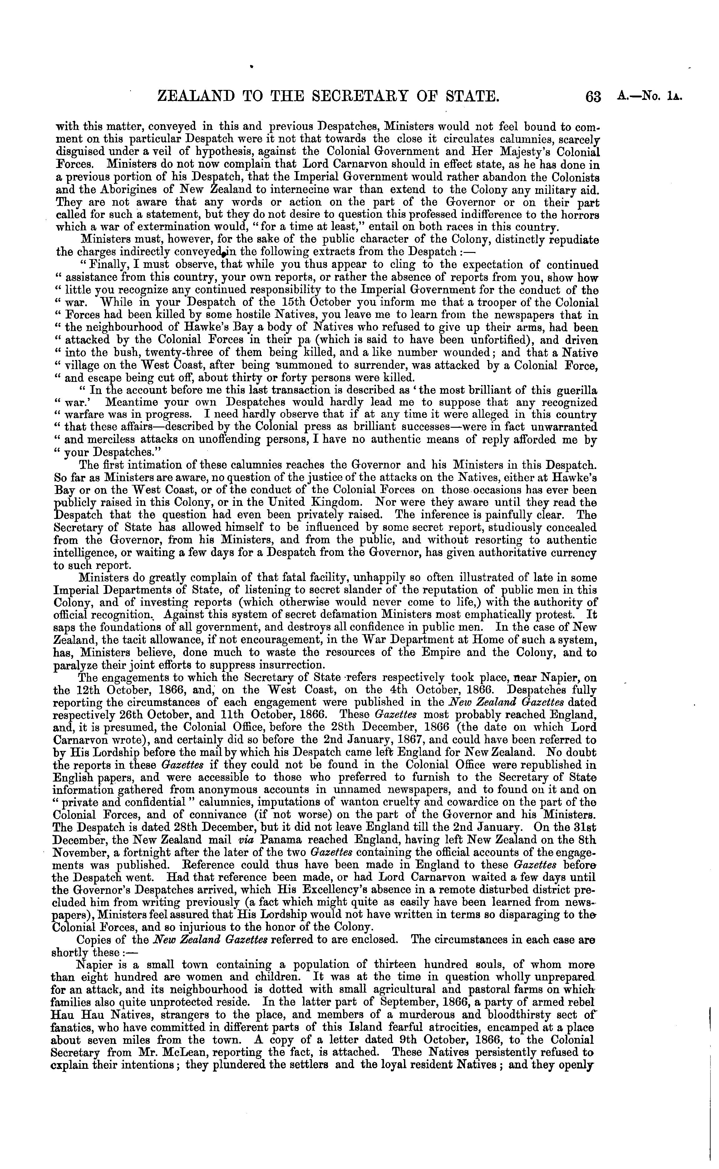 with this matter, conveyed in this and previous Despatches, Ministers would not feel bound to comment on this particular Despatch were it not that towards the close it circulates calumnies, scarcely disguised under a veil of hypothesis, against the Colonial Government and Her Majesty's Colonial Forces. Ministers do not now complain that Lord Carnarvon should in effect state, as he has done in a previous portion of his Despatch, that the Imperial Government would rather abandon the Colonists and the Aborigines of New Zealand to internecine war than extend to the Colony any military aid. They are not aware that any words or action on the part of the Governor or on their part called for such a statement, but they do not desire to question this professed indifference to the horrors which a war of extermination would, "for a time at least," entail on both races in this country. Ministers must, however, for the sake of the public character of the Colony, distinctly repudiate the charges indirectly conveyed^in the following extracts from the Despatch : — " Finally, I must observe, that while you thus appear to cling to the expectation of continued " assistance from this country, your own reports, or rather the absence of reports from you, show how " little you recognize any continued responsibility to the Imperial Government for the conduct of the " war. While in your Despatch of the 15th October you inform me that a trooper of the Colonial " Forces had been killed by some hostile Natives, you leave me to learn from the newspapers that in " the neighbourhood of Hawke's Bay a body of Natives who refused to give up their arms, had been " attacked by the Colonial Forces in their pa (which is said to have been unfortified), and driven " into the bush, twenty-three of them being killed, and a like number wounded; and that a Native " village on the West Coast, after being 'summoned to surrender, was attacked by a Colonial Force, " and escape being cut off, about thirty or forty persons were killed. " In the account before me this last transaction is described as ' the most brilliant of this guerilla " war.' Meantime your own Despatches would hardly lead me to suppose that any recognized " warfare was in progress. I need hardly observe that if at any time it were alleged in this country " that these affairs —described by the Colonial press as brilliant successes—were in fact unwarranted " and merciless attacks on unoffending persons, I have no authentic means of reply afforded me by " your Despatches." The first intimation of these calumnies reaches the Governor and his Ministers in this Despatch. So far as Ministers are aware, no question of the justice of the attacks on the Natives, either at Hawke's Bay or on the West Coast, or of the conduct of the Colonial Forces on those occasions has ever been publicly raised in this Colony, or in the United Kingdom. Nor were they aware until they read the Despatch that the question had even been privately raised. The inference is painfully clear. The Secretary of State has allowed himself to be influenced by some secret report, studiously concealed from the Governor, from his Ministers, and from the public, and without resorting to authentic intelligence, or waiting a few days for a Despatch from, the Governor, has given authoritative currency to such report. Ministers do greatly complain of that fatal facility, unhappily so often illustrated of late in some Imperial Departments of State, of listening to secret slander of the reputation of public men in this Colony, and of investing reports (which otherwise would never come to life,) with the authority of official recognition. Against this system of secret defamation Ministers most emphatically protest. It saps the foundations of all government, and destroys all confidence in public men. In the case of New Zealand, the tacit allowance, if not encouragement, in the War Department at Home of such a system, has, Ministers believe, done much to waste the resources of the Empire and the Colony, and to paralyze their joint efforts to suppress insurrection. The engagements to which the Secretary of State refers respectively took place, near Napier, on the 12th October, 1866, and, on the West Coast, on the 4th October, 1866. Despatches fully reporting the circumstances of each engagement were published in the New Zealand Gazettes dated respectively 26th October, and 11th October, 1866. These Gazettes most probably reached England, and, it is presumed, the Colonial Office, before the 28th December, 1566 (the date on which Lord Carnarvon wrote), and certainly did so before the 2nd January, 1867, and could have been referred to by His Lordship before the mail by which his Despatch came left England for New Zealand. No doubt the reports in these Gazettes if they could not be found in the Colonial Office were republished in English papers, and were accessible to those who preferred to furnish to the Secretary of State information gathered from anonymous accounts in unnamed newspapers, and to found on it and on " private and confidential " calumnies, imputations of wanton cruelty and cowardice on the part of the Colonial Forces, and of connivance (if not worse) on the part of the Governor and his Ministers. The Despatch is dated 28th December, but it did not leave England till the 2nd January. On the 31st December, the New Zealand mail via Panama reached England, having left New Zealand on the Bth November, a fortnight after the later of the two Gazettes containing the official accounts of the engagements was published. Reference could thus have been made in England to these Gazettes before the Despatch went. Had that reference been made, or had Lord Carnarvon waited a few days until the Governor's Despatches arrived, which His Excellency's absence in a remote disturbed district precluded him from writing previously (a fact which might quite as easily have been learned from newspapers), Ministers feel assured that His