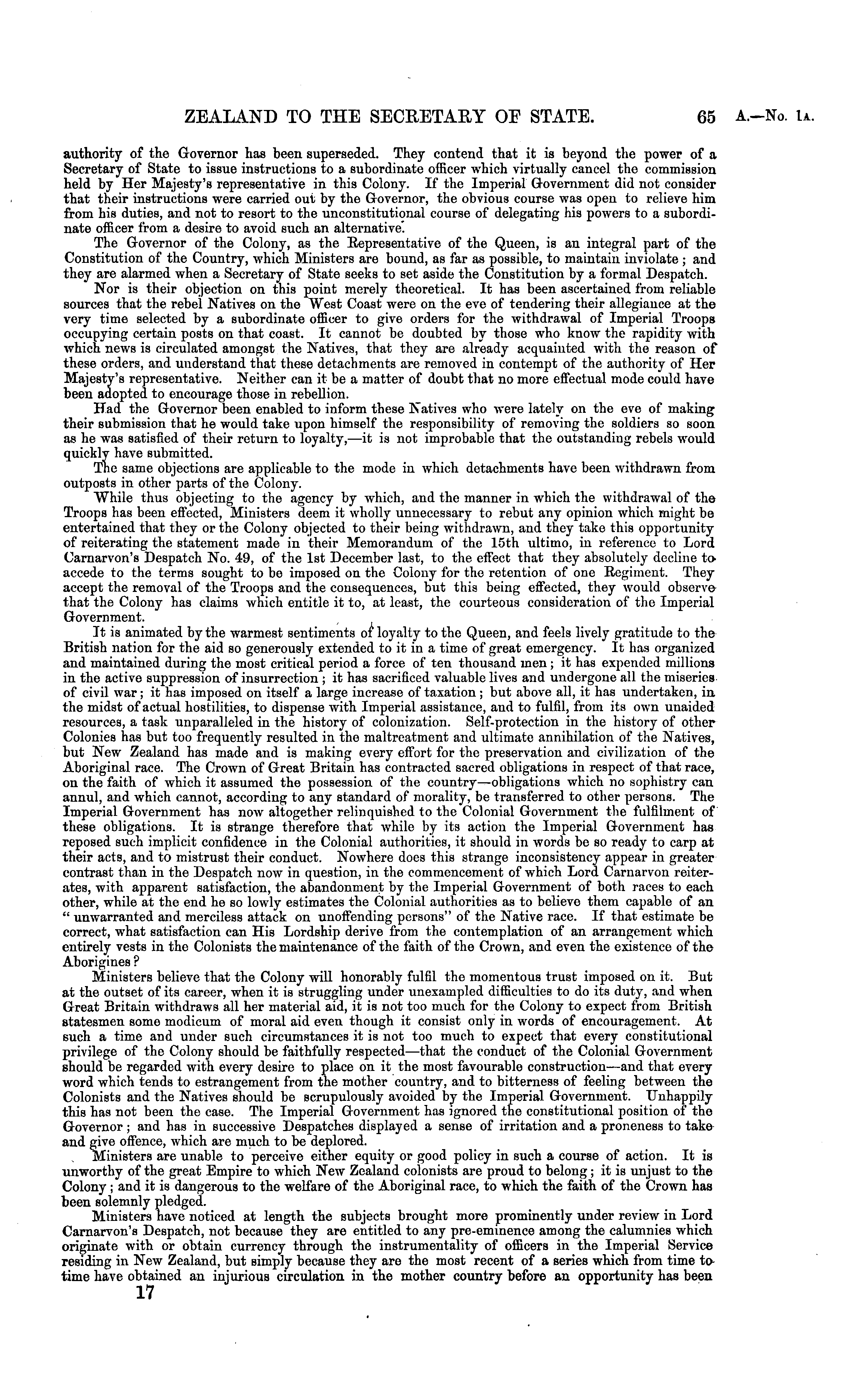 authority of the Governor has been superseded. They contend that it is beyond the power of a Secretary of State to issue instructions to a subordinate officer wliich virtually cancel the commission held by Her Majesty's representative in this Colony. If the Imperial Government did not consider that their instructions were carried out by the Governor, the obvious course was open to relieve him from his duties, and not to resort to the unconstitutional course of delegating his powers to a subordinate officer from a desire to avoid such an alternative. The Governor of the Colony, as the Bepresentative of the Queen, is an integral part of the Constitution of the Country, which Ministers are bound, as far as possible, to maintain inviolate; and they are alarmed when a Secretary of State seeks to set aside the Constitution by a formal Despatch. Nor is their objection on this point merely theoretical. It has been ascertained from reliable sources that the rebel Natives on the West Coast were on the eve of tendering their allegiance at the very time selected by a subordinate officer to give orders for the withdrawal of Imperial Troops occupying certain posts on that coast. It cannot be doubted by those who know the rapidity with which news is circulated amongst the Natives, that they are already acquainted with the reason of these orders, and understand that these detachments are removed in contempt of the authority of Her Majesty's representative. Neither can it be a matter of doubt that no more effectual mode could have been adopted to encourage those in rebellion. Had the Governor been enabled to inform these Natives who were lately on the eve of making their submission that he would take upon himself the responsibility of removing the soldiers so soon as he was satisfied of their return to loyalty, —it is not improbable that the outstanding rebels would quickly have submitted. The same objections are applicable to tho mode in which detachments have been withdrawn from outposts in other parts of the Colony. While thus objecting to the agency by which, and the manner in wliich the withdrawal of the Troops has been effected, Ministers deem it wholly unnecessary to rebut any opinion which might be entertained that they or the Colony objected to their being withdrawn, and they take this opportunity of reiterating the statement made in their Memorandum of the 15th ultimo, in reference to Lord Carnarvon's Despatch No. 49, of the Ist December last, to the effect that they absolutely decline toaccede to the terms sought to be imposed on the Colony for the retention of one Begiment. They accept the removal of the Troops and the consequences, but this being effected, they would observe that the Colony has claims which entitle it to, at least, the courteous consideration of the Imperial Government. It is animated by the warmest sentiments of loyalty to the Queen, and feels lively gratitude to the British nation for the aid so generously extended to it in a time of great emergency. It has organized and maintained during the most critical period a force of ten thousand men ; it has expended millions in the active suppression of insurrection ; it has sacrificed valuable lives and undergone all the miseries of civil war; it has imposed on itself a large increase of taxation ; but above all, it has undertaken, in the midst of actual hostilities, to dispense with Imperial assistance, aud to fulfil, from its own unaided resources, a task unparalleled in the history of colonization. Self-protection in the history of other Colonies has but too frequently resulted in tho maltreatment and ultimate annihilation of the Natives, but New Zealand has made and is making every effort for the preservation and civilization of the Aboriginal race. The Crown of Great Britain has contracted sacred obligations in respect of that race, on the faith of which it assumed the possession of the country —obligations which no sophistry can annul, and which cannot, according to any standard of morality, be transferred to other persons. The Imperial Government has now altogether relinquished to the Colonial Government the fulfilment of these obligations. It is strange therefore that while by its action the Imperial Government has reposed such implicit confidence in the Colonial authorities, it should in words be so ready to carp at their acts, and to mistrust their conduct. Nowhere docs this strange inconsistency appear in greater contrast than in the Despatch now in question, in the commencement of which Lord Carnarvon reiterates, with apparent satisfaction, the abandonment by the Imperial Government of both races to each other, while at the end he so lowly estimates the Colonial authorities as to believe them capable of an " unwarranted and merciless attack on unoffending persons" of the Native race. If that estimate be correct, what satisfaction can His Lordship derive from the contemplation of an arrangement which entirely vests in the Colonists the maintenance of the faith of the Crown, and even the existence of the Aborigines ? Ministers believe that the Colony will honorably fulfil the momentous trust imposed on it. But at tho outset of its career, when it is struggling under unexampled difficulties to do its duty, and when Great Britain withdraws all her material aid, it is not too much for the Colony to expect from British statesmen some modicum of moral aid even though it consist only in words of encouragement. At such a time and under such circumstances it is not too much to expect that every constitutional privilege of the Colony should be faithfully respected —that the conduct of the Colonial Government should be regarded with every desire to place on it the most favourable construction —and that every word which tends to estrangement from the mother country, and to bitterness of feeling between the Colonists and the Natives should be scrupulously avoided by the Imperial Government. Hnhappily this has not been the c