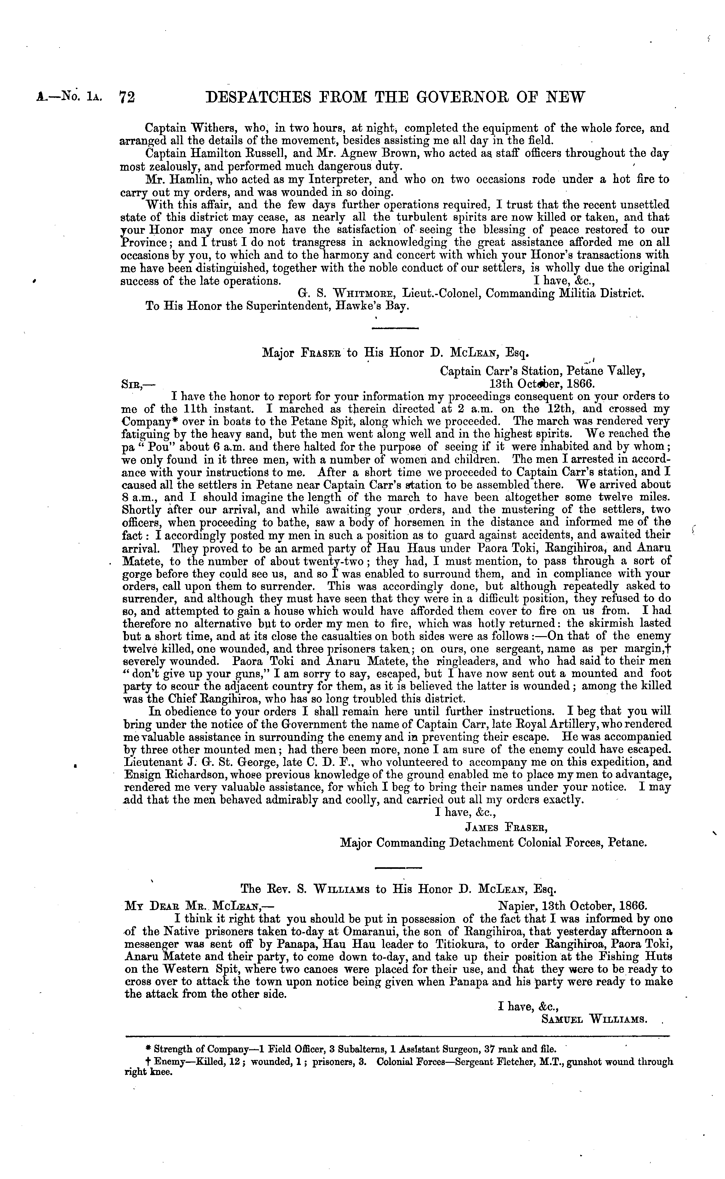 Major Fraser to His Honor D. McLean, Esq. Captain Carr's Station, Petane Valley, Sir,— 13th October, 1866. I have the honor to report for your information my proceedings consequent on your orders to me of the 11th instant. I marched as therein directed at 2 a.m. on the 12th, aud crossed my Company* over in boats to the Petane Spit, along which we proceeded. The march was rendered very fatiguing by the heavy sand, but the men went along well and in the highest spirits. We reached the pa " Pou" about 6 a.m. aud there halted for the purpose of seeing if it were inhabited and by whom ; we only found in it three men, with a number of women and children. The men I arrested in accordance with your instructions to me. After a short time we proceeded to Captain Carr's station, and I caused all the settlers in Petane near Captain Carr's station to be assembled there. We arrived about 8 a.m., and I should imagine the length of the march to have been altogether some twelve miles. Shortly after our arrival, and while awaiting your orders, and the mustering of the settlers, two officers, when proceeding to bathe, saw a body of horsemen in the distance and informed me of the fact: I accordingly posted my men in such a position as to guard against accidents, and awaited their arrival. They proved to be an armed party of Hau Haus under Paora Toki, Bangihiroa, and Anaru Matete, to the number of about twenty-two ; they had, I must mention, to pass through a sort of gorge before they could see us, and so I was enabled to surround them, and in compliance with your orders, call upon them to surrender. This was accordingly done, but although repeatedly asked to surrender, and although they must have seen that they were in a difficult position, they refused to do bo, and attempted to gain a house which would have afforded them cover to fire on us from. I had therefore no alternative but to order my men to fire, which was hotly returned: the skirmish lasted but a short time, and at its close the casualties on both sides were as follows : —On that of the enemy twelve killed, one wounded, and three prisoners taken; on ours, one sergeant, name as per margin,t severely wounded. Paora Toki and Anaru Matete, the ringleaders, and who had said to their men " don't give up your guns," I am sorry to say, escaped, but I have now sent out a mounted and foot party to scour the adjacent country for them, as it is believed the latter is wounded; among the killed "was the Chief Bangihiroa, who has so long troubled this district. In obedience to your orders I shall remain here until further instructions. I beg that you will bring under the notice of the Government the name of Captain Carr, late Boyal Artillery, who rendered me valuable assistance in surrounding the enemy and in preventing their escape. He was accompanied by three other mounted men; had there been more, none lam sure of the enemy could have escaped. Lieutenant J. G. St. George, late C. D. F., who volunteered to accompany me on this expedition, and Ensign Bichardson, whose previous knowledge of the ground enabled me to place my men to advantage, rendered me very valuable assistance, for which I beg to bring their names under your notice. I may add that the men behaved admirably and coolly, and carried out all my orders exactly. I have, &e, James Eraser, Major Commanding Detachment Colonial Forces, Petane. The Bev. S. Williams to His Honor D. McLean, Esq. My Dear Mr. McLean, — Napier, 13th October, 1866. I think it right that you should be put in possession of the fact that I was informed by ono of the Native prisoners taken to-day at Omaranui, the son of Bangihiroa, that yesterday afternoon a messenger was sent off by Panapa, Hau Hau leader to Titiokura, to order Bangihiroa, Paora Toki, Anaru Matete and their party, to come down to-day, and take up their position at the Fishing Huts on the Western Spit, where two canoes were placed for their use, and that they were to be ready to cross over to attack the town upon notice being given when Panapa and his party were ready to make the attack from the other side. I have, &c, Samuel Williams. * Strength of Company —1 Field Officer, 3 Subalterns, 1 Assistant Surgeon, 37 rank and file. t Enemy—Killed, 12 ; wounded, 1; prisoners, 3. Colonial Forces —Sergeant Fletcher, M.T., gunshot wound through right knee.
