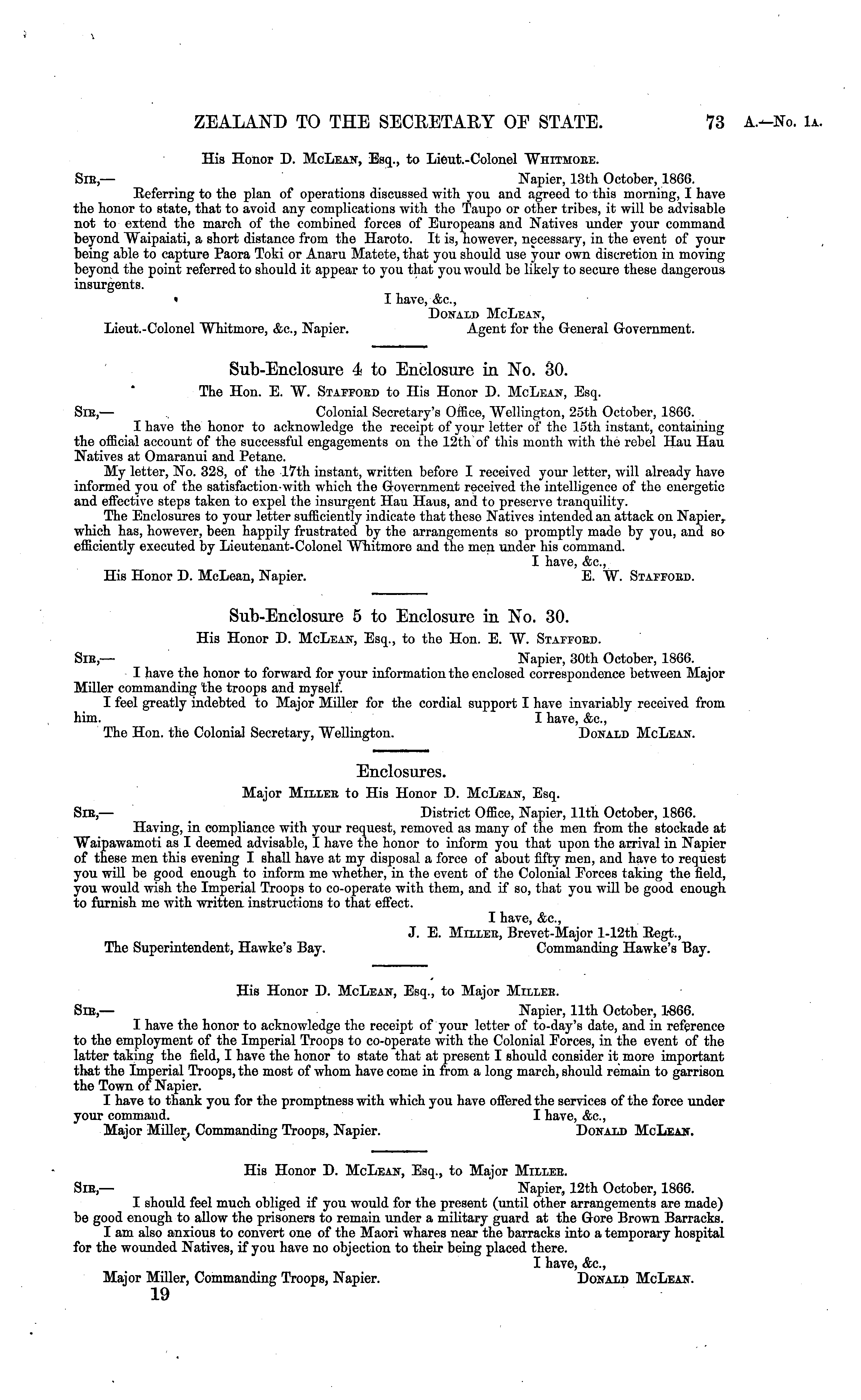 Enclosures. Major Miller to His Honor D. McLean, Esq. Sir,— District Office, Napier, 11th October, 1866. Having, in compliance with your request, removed as many of the men from tho stockade at Waipawamoti as I deemed advisable, I have the honor to inform you that upon the arrival in Napier of these men this evening I shall have at my disposal a force of about fifty men, and have to request you will be good enough to inform mo whether, in tho event of the Colonial Forces taking the field, you would wish the Imperial Troops to co-operate with them, and if so, that you will be good enough to furnish me with written instructions to that effect. I have, &c., J. E. Miller, Brevet-Major l-12th Eegt., The Superintendent, Hawke's Bay. Commanding Hawke's Bay.