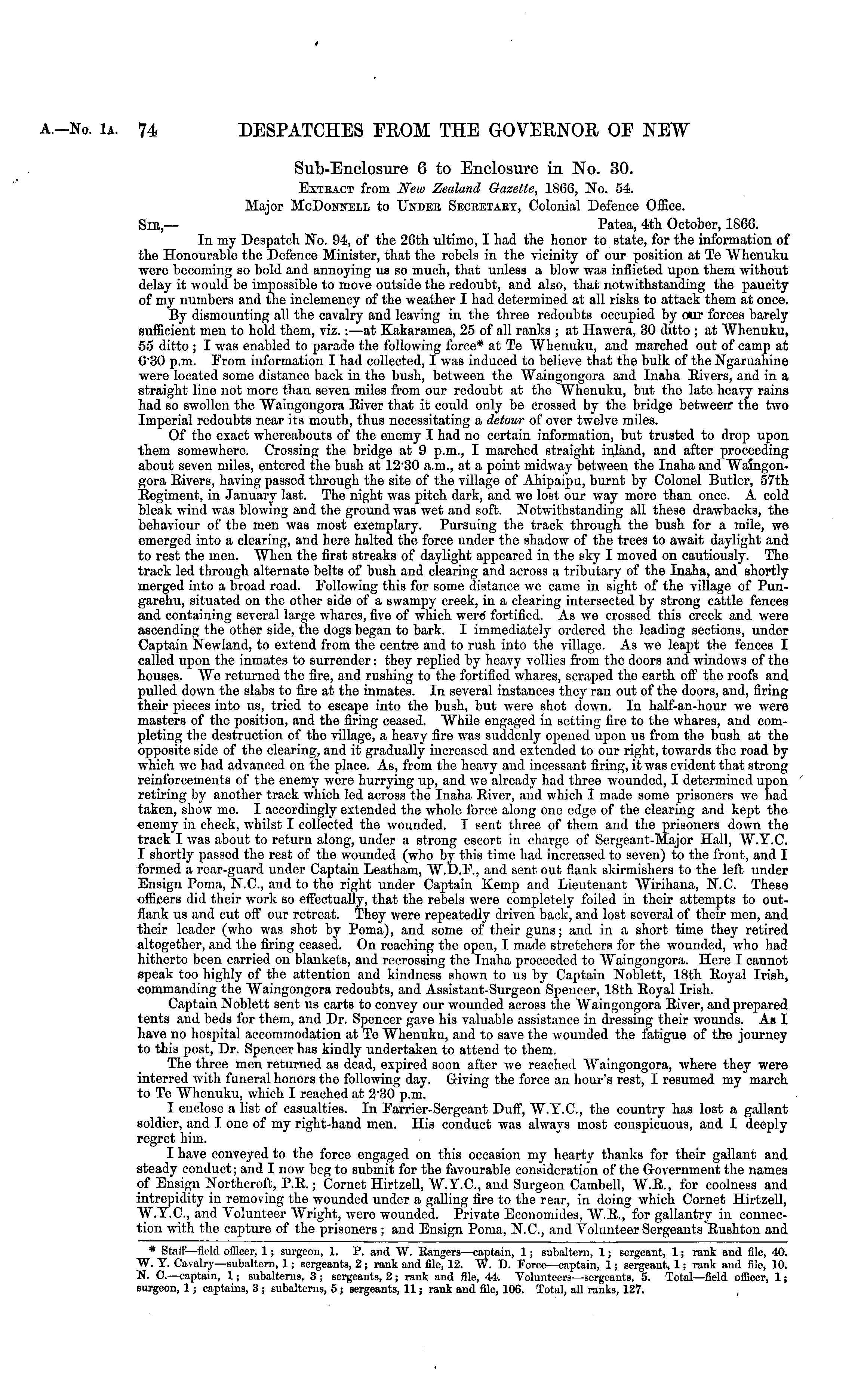 Sub-Enclosure 6 to Enclosure in No. 30. Extract from New Zealand Gazette, 1866, No. 54. Major McDonnell to Under Secretary, Colonial Defence Office. Sir ,— Patea, 4th October, 1866. In my Despatch No. 94, of the 26th ultimo, I had tho honor to state, for the information of the Honourable the Defence Minister, that the rebels in the vicinity of our position at Te Whenuku were becoming so bold and annoying us so much, that unless a blow was inflicted upon them without delay it would be impossible to move outside the redoubt, and also, that notwithstanding the paucity of my numbers and the inclemency of the weather I had determined at all risks to attack them at once. By dismounting all the cavalry and leaving in the three redoubts occupied by our forces barely sufficient men to hold them, viz.:—at Kakaramea, 25 of all ranks ; at Hawera, 30 ditto ; at Whenuku, 55 ditto ; I was enabled to parade the following force* at Te Whenuku, and marched out of camp at 6'30 p.m. From information I had collected, I was induced to believe that the bulk of the Ngaruahine were located some distance back in the bush, between the Waingongora and Inaha Eivers, and in a straight line not more than seven miles from our redoubt at tho Whenuku, but tho late heavy rains had so swollen the Waingongora Biver that it could only be crossed by the bridge between' the two Imperial redoubts near its mouth, thus necessitating a detour of over twelve miles. Of the exact whereabouts of the enemy I had no certain information, but trusted to drop upon them somewhere. Crossing the bridge at 9 p.m., I marched straight inland, and after proceeding about seven miles, entered the bush at 12'30 a.m., at a point midway between the Inaha and Waingongora Bivers, having passed through the site of the village of Ahipaipu, burnt by Colonel Butler, 57th Begiment, in Januarv last. The night was pitch dark, and wo lost our way more than once. A cold bleak wind was blowing and the ground was wet and soft. Notwithstanding all these drawbacks, the behaviour of the men was most exemplary. Bursuing the track through the bush for a mile, we emerged into a clearing, and here halted the force under the shadow of the trees to await daylight and to rest the men. When the first streaks of daylight appeared in the sky I moved on cautiously. The track led through alternate belts of bush and clearing and across a tributary of the Inaha, and shortly merged into a broad road. Following this for some distance we came in sight of the village of Pungarehu, situated on the other side of a swampy creek, in a clearing intersected by strong cattle fences and containing several large whares, five of which were fortified. As we crossed this creek and were ascending the other side, the dogs began to bark. I immediately ordered the leading sections, under Captain Newland, to extend from the centre and to rush into the village. As we leapt tho fences I called upon the inmates to surrender: they replied by heavy vollies from the doors and windows of the houses. We returned the fire, and rushing to the fortified whares, scraped the earth off the roofs and pulled down the slabs to fire at the inmates. In several instances they ran out of the doors, and, firing their pieces into us, tried to escape into the bush, but were shot down. In half-an-hour we were masters of the position, and the firing ceased. While engaged in setting fire to the whares, and completing the destruction of the village, a heavy fire was suddenly opened upon us from the bush at the opposite side of the clearing, and it gradually increased and extended to our right, towards the road by which we had advanced on the place. As, from the heavy and incessant firing, it was evident that strong reinforcements of the enemy were hurrying up, and we already had three wounded, I determined upon retiring by another track which led across the Inaha Biver, and which I made some prisoners we had taken, show me. I accordingly extended the whole force along one edge of the clearing and kept the enemy in check, whilst I collected the wounded. I sent three of them and the prisoners down the track I was about to return along, under a strong escort in charge of Sergeant-Major Hall, W.Y.C. I shortly passed the rest of the wounded (who by this time had increased to seven) to the front, and I formed a roar-guard under Captain Leatham, W.D.F., and sent out flank skirmishers to the left under Ensign Poma, N.C, and to tho right under Captain Kemp and Lieutenant Wirihana, N.C. These officers did their work so effectually, that the rebels were completely foiled in their attempts to outflank us and cut off our retreat. They were repeatedly driven back, and lost several of their men, and their leader (who was shot by Poma), and some of their guns; and in a short time they retired altogether, and the firing ceased. On reaching the open, I made stretchers for the wounded, who had hitherto been carried on blankets, and recrossing the Inaha proceeded to AV^aingongora. Here I cannot speak too highly of the attention and kindness shown to us by Captain Noblett, 18th Boyal Irish, commanding the Waingongora redoubts, and Assistant-Surgeon Spencer, 18th Boyal Irish. Captain Noblett sent us carts to convey our wounded across the Waingongora Eiver, and prepared tents and beds for them, and Dr. Spencer gave his valuable assistance in dressing their wounds. As 1 have no hospital accommodation at Te Whenuku, and to save the wounded the fatigue of tire journey to this post, Dr. Spencer has kindly undertaken to attend to them. The three men returned as dead, expired soon after we reached Waingongora, where they were interred with funeral honors the following day. Giving the force an hour's rest, I resumed my march to Te Whenuku, which I reached at 230 p.m. I enclose a list of casualties. In Farrier-Sergeant Duff, W.Y.C, the country has lost a gallant soldier, and I one of my right-hand men. His conduct was always most conspicuous, and I deeply