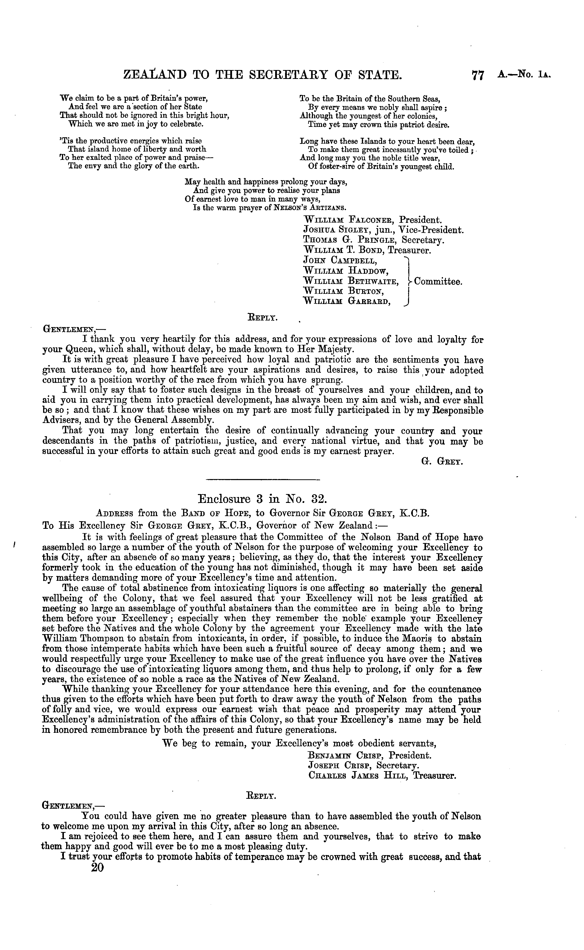 Enclosure 3 in No. 32. Address from the Band of Hope, to Governor Sir George Gret, K.C.B. To His Excellency Sir George Gret, K.C.8., Governor of Now Zealand: — It is with feelings of great pleasure that tho Committee of the Nolson Band of Hope have assembled so large a number of the youth of Nelson for the purpose of welcoming your Excellency to this City, after an absenc'e of so many years ; believing, as they do, that the interest your Excellency formerly took in the education of the young has not diminished, though it may have been set aside by matters demanding more of your Excellency's time and attention. The cause of total abstinence from intoxicating liquors is one affecting so materially the general wellbeing of the Colony, that we feel assured that your Excellency will not be less gratified at meeting so large an assemblage of youthful abstainers than the committee are in being able to bring them before your Excellency ; especially when they remember the noble' example your Excellency set before the Natives and the whole Colony by the agreement your Excellency made with the late William Thompson to abstain from intoxicants, in order, if possible, to induce the Maoris to abstain from those intemperate habits which have been such a fruitful source of decay among them; and we would respectfully urge your Excellency to make use of the great influence you have over the Natives to discourage the use of intoxicating liquors among them, and thus help to prolong, if only for a few years, the existence of so noble a race as the Natives of New Zealand. While thanking your Excellency for your attendance here this evening, and for the countenance thus given to the efforts which have been put forth to draw away the youth of Nelson from the paths of folly and vice, we would express our earnest wish that peace and prosperity may attend your Excellency's administration of the affairs of this Colony, so that your Excellency's name may be held in honored remembrance by both the present and future generations. We beg to remain, your Excellency's most obedient servants, Benjamin Ceisp, President. Josepu Ceisp, Secretary. Charles James Hill, Treasurer. Beplt. Gentlemen, — You could have given me no greater pleasure than to have assembled the youth of Nelson to welcome me upon my arrival in this City, after so long an absence. I am rejoiced to see them here, and I can assure them and yourselves, that to strive to make them happy and good will ever be to me a most pleasing duty. I trust your efforts to promote habits of temperance may be crowned with great success, and that 20