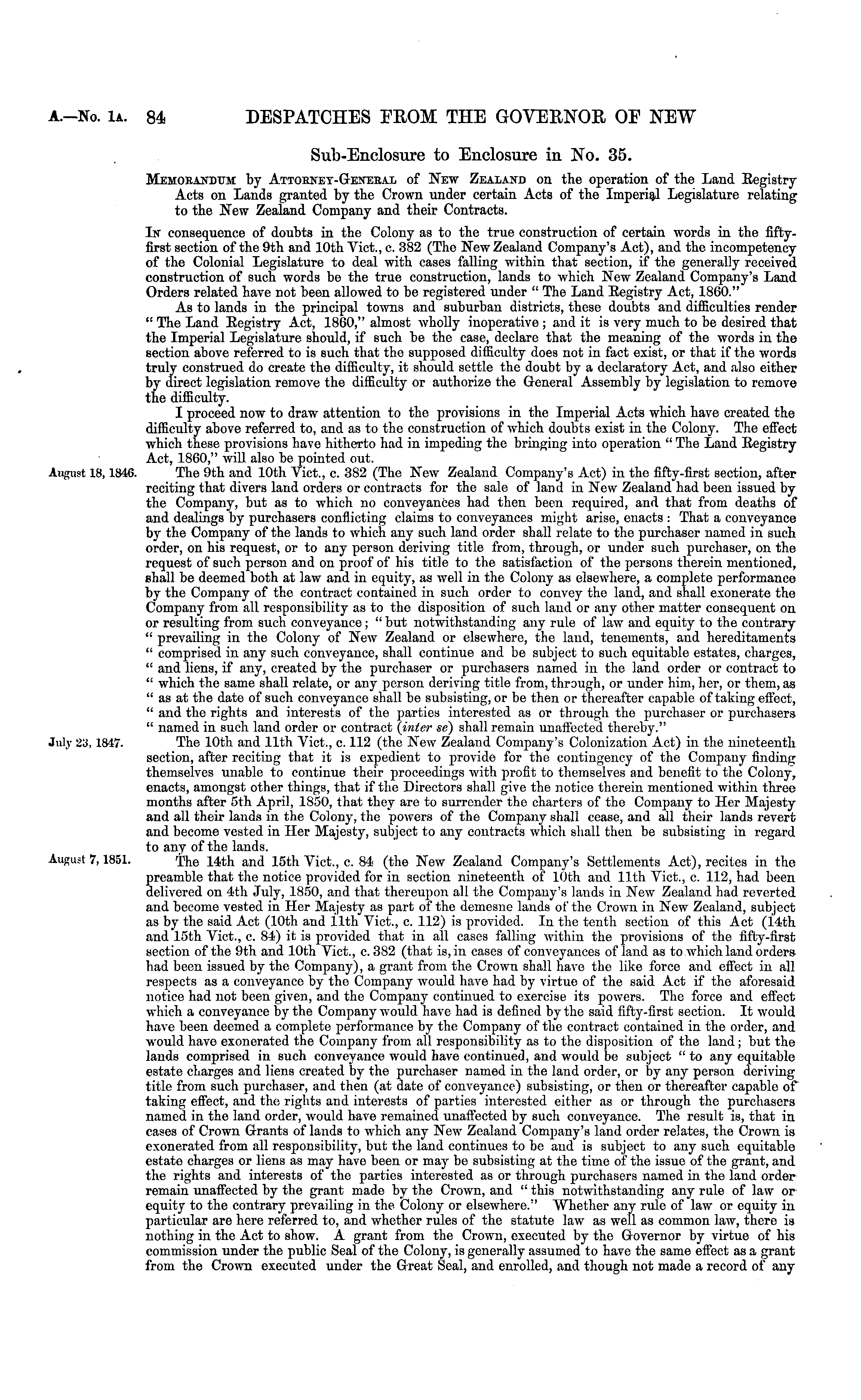 Sub-Enclosure to Enclosure in No. 35. Memorandum by Attornet-General of New Zealand on the operation of the Land Begistry Acts on Lands granted by the Crown under certain Acts of the Imperial Legislature relating to the New Zealand Company and their Contracts. In consequence of doubts in the Colony as to the true construction of certain words in the fiftyfirst section of the 9th and 10th Vict., c. 382 (The New Zealand Company's Act), and the incompetency of the Colonial Legislature to deal with cases falling within that section, if the generally received construction of such words be the true construction, lands to which New Zealand Company's Land Orders related have not been allowed to be registered under " Tho Land Begistry Act, 1860." As to lands in the principal towns and suburban districts, these doubts and difficulties render " The Land Begistry Act, 1860," almost wholly inoperative ; and it is very much to be desired that the Imperial Legislature should, if such be the case, declare that the meaning of the words in the section above referred to is such that the supposed difficulty does not in fact exist, or that if tho words truly construed do create the difficulty, it should settle the doubt by a declaratory Act, and also either by direct legislation remove the difficulty or authorize the General Assembly by legislation to remove the difficulty. I proceed now to draw attention to the provisions in the Imperial Acts which have created the difficulty above referred to, and as to the construction of which doubts exist in the Colony. The effect which these provisions have hitherto had in impeding the bringing into operation " The Land Begistry Act, 1860," will also be pointed out. The 9th and 10th Vict., c. 382 (The New Zealand Company's Act) in the fifty-first section, after reciting that divers land orders or contracts for the sale of land in New Zealand had been issued by the Company, but as to which no conveyances had then been required, and that from deaths of and dealings by purchasers conflicting claims to conveyances might arise, enacts : That a conveyance by the Company of the lands to which any such land order shall relate to the purchaser named in such order, on his request, or to any person deriving title from, through, or under such purchaser, on the request of such person and on proof of his title to the satisfaction of the persons therein mentioned, shall be deemed both at law and in equity, as well in the Colony as elsewhere, a complete performance by the Company of the contract contained in such order to convey the land, and shall exonerate the Company from all responsibility as to the disposition of such land or any other matter consequent on or resulting from such conveyance ; " but notwithstanding any rule of law and equity to the contrary " prevailing in the Colony of New Zealand or elsewhere, the laud, tenements, and hereditaments " comprised in any such conveyance, shall continue and be subject to such equitable estates, charges, " and liens, if any, created by the purchaser or purchasers named in the land order or contract to " which the same shall relate, or any person deriving title from, through, or under him, her, or them, as " as at the date of such conveyance shall be subsisting, or be then or thereafter capable of taking effect, " and the rights and interests of the parties interested as or through the purchaser or purchasers " named in such land order or contract (inter se) shall remain unaffected thereby." The 10th and 11th Vict., c. 112 (the New Zealand Company's Colonization Act) in tho nineteenth section, after reciting that it is expedient to provide for the contingency of the Company finding themselves unable to continue their proceedings with profit to themselves and benefit to the Colony, enacts, amongst other things, that if the Directors shall give the notice therein mentioned within three months after sth April, 1850, that they are to surrender the charters of the Company to Her Majesty and all their lands in the Colony, the powers of the Company shall cease, and all their lands revert and become vested in Her Majesty, subject to any contracts which shall then be subsisting in regard to any of the lands. The 14th and 15th Vict., c. 84 (the New Zealand Company's Settlements Act), recites in the preamble that the notice provided for in section nineteenth of 10th and 11th Vict., c. 112, had been delivered on 4th July, 1850, and that thereupon all the Company's lands in New Zealand had reverted and become vested in Her Majesty as part of the demesne lands of tho Crown in New Zealand, subject as by the said Act (10th and 11th Vict., c. 112) is provided. In the tenth section of this Act (14th and 15th Vict., c. 84) it is provided that in all cases falling within the provisions of the fifty-first section of the 9th and 10th Vict., c. 382 (that is, in cases of conveyances of land as to which land orders had been issued by the Company), a grant from tho Crown shall have the like force and effect in all respects as a conveyance by the Company would have had by virtue of the said Act if the aforesaid notice had not been given, and the Company continued to exercise its powers. The force and effect which a conveyance by the Company would have had is defined by the said fifty-first section. It would have been deemed a complete performance by the Company of the contract contained in the order, and would have exonerated the Company from all responsibility as to the disposition of the land; but the lands comprised in such conveyance would have continued, and would be subject " to any equitable estate charges and liens created by the purchaser named in the land order, or by any person deriving title from such purchaser, and then (at date of conveyance) subsisting, or then or thereafter capable of taking effect, and the rights and interests of parties interested either as or through the purchasers named in the land order, would have remained unaffected by such