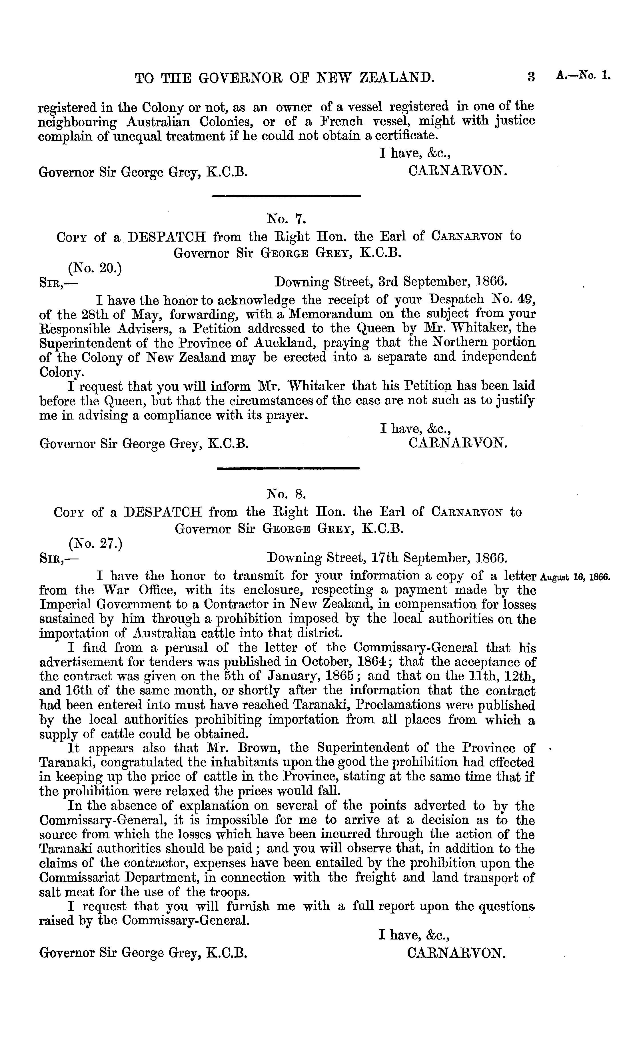 No. 7. Copy of a DESPATCH from the Right Hon. the Earl of Carnarvon to Governor Sir George Grey, K.C.B. (No. 20.) Sir, — Downing Street, 3rd September, 1866. I have the honor to acknowledge the receipt of your Despatch No. 49, of the 28th of May, forwarding, with a Memorandum on the subject from your Responsible Advisers, a Petition addressed to the Queen by Mr. Whitaker, the Superintendent of the Province of Auckland, praying that the Northern portion of the Colony of New Zealand may be erected into a separate and independent Colony. I request that you will inform Mr. Whitaker that Ids Petition has been laid before the Queen, but that the circumstances of the case are not such as to justify me in advising a compliance with its prayer. I have, &c., Governor Sir George Grey, K.C.B. CARNARVON.
