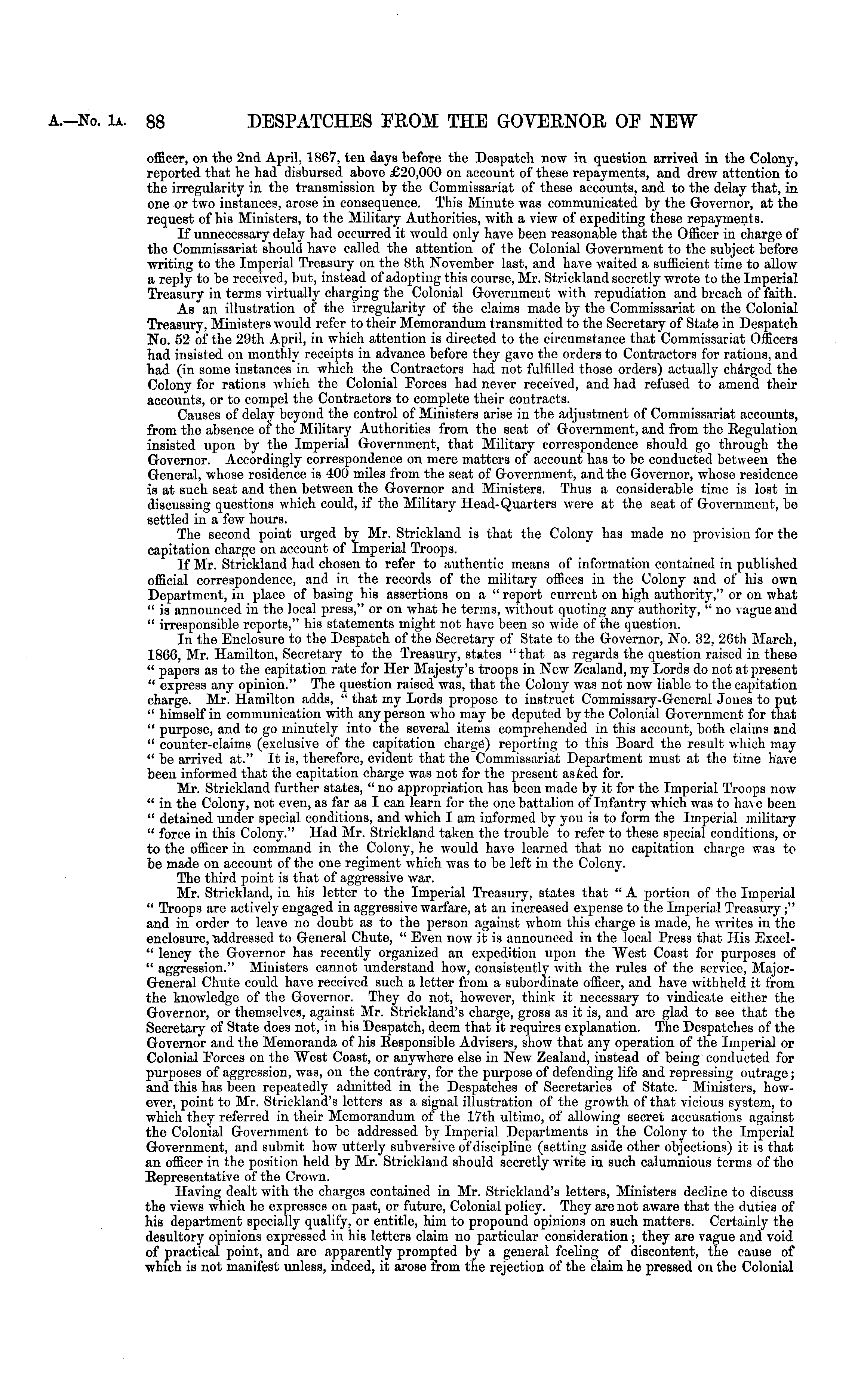officer, on the 2nd April, 1867, ten days before the Despatch now in question arrived in the Colony, reported that ho had disbursed above £20,000 on account of these repayments, and drew attention to the irregularity in the transmission by the Commissariat of these accounts, and to the delay that, in one or twx> instances, arose in consequence. This Minute was communicated by the Governor, at the request of his Ministers, to the Military Authorities, with a view of expediting these repayments. If unnecessary delay had occurred it would only have been reasonable that the Officer in charge of the Commissariat should have called the attention of the Colonial Government to the subject before writing to the Imperial Treasury on the Bth November last, and have waited a sufficient time to allow a reply to be received, but, instead of adopting this course, Mr. Strickland secretly wrote to the Imperial Treasury in terms virtually charging the Colonial Government with repudiation and breach of faith. As an illustration of the irregularity of the claims made by the Commissariat on the Colonial Treasurv, Ministers would refer to their Memorandum transmitted to the Secretary of State in Despatch No. 52 of the 29th April, in which attention is directed to the circumstance that Commissariat Officers had insisted on monthly receipts in advance before they gave the orders to Contractors for rations, and had (in some instances in which the Contractors had not fulfilled those orders) actually charged the Colony for rations which the Colonial Forces had never received, and had refused to amend their accounts, or to compel the Contractors to complete their contracts. Causes of delay beyond the control of Ministers arise in the adjustment of Commissariat accounts, from the absence of the Military Authorities from the seat of Government, and from the Eegulation insisted upon by the Imperial Government, that Military correspondence should go through the Governor. Accordingly correspondence on mere matters of account has to be conducted between the General, whose residence is 400 miles from the seat of Government, and the Governor, whose, residence is at such seat and then between the Governor and Ministers. Thus a considerable time is lost in discussing questions which could, if the Military Head-Quarters were at tho seat of Government, be settled in a few hours. The second point urged by Mr. Strickland is that the Colony has made no provision for the capitation charge on account of Imperial Troops. If Mr. Strickland had chosen to refer to authentic means of information contained in published official correspondence, and in the records of the military offices in the Colony and of his own Department, in place of basing his assertions on a "report current on high authority," or on what " is announced in the local press," or on what he terms, without quoting any authority, " no vague and " irresponsible reports," his statements might not have been so wide of the question. In the Enclosure to the Despatch of the Secretary of State to the Governor, No. 32, 26th March, 1866, Mr. Hamilton, Secretary to the Treasury, states " that as regards the question raised in these " papers as to the capitation rate for Her Majesty's troops in New Zealand, my Lords do not at present " express any opinion." The question raised was, that the Colony was not now liable to the capitation charge. Mr. Hamilton adds, " that my Lords propose to instruct Commissary-General Jones to put " himself in communication with any person who may be deputed by the Colonial Government for that " purpose, and to go minutely into the several items comprehended in this account, both claims and " counter-claims (exclusive of the capitation charge) reporting to this Board the result which may "be arrived at." It is, therefore, evident that the Commissariat Department must at the time have been informed that the capitation charge was not for the present asAed for. Mr. Strickland further states, " no appropriation has been made by it for the Imperial Troops now " in the Colony, not even, as far as I can learn for the one battalion of Infantry which was to have been " detained under special conditions, and which I am informed by you is to form the Imperial military " force in this Colony." Had Mr. Strickland taken the trouble to refer to these special conditions, or to tho officer in command in the Colony, he would have learned that no capitation charge was to be made on account of the ono regiment which was to be left in the Colony. The third point is that of aggressive war. Mr. Strickland, in his letter to the Imperial Treasury, states that " A portion of the Imperial " Troops are actively engaged in aggressive warfare, at au increased expense to the Imperial Treasury ;" and in order to leave no doubt as to the person against whom this charge is made, he writes in the enclosure, uddressed to General Chute, " Even now it is announced in the local Press that His Excel- " lency the Governor has recently organized an expedition upon the West Coast for purposes of " aggression." Ministers cannot understand how, consistently with the rules of the service, MajorGeneral Chute could have received such a letter from a subordinate officer, and have withheld it from the knowledge of the Governor. They do not, however, think it necessary to vindicate either the Governor, or themselves, against Mr. Strickland's charge, gross as it is, and are glad to see that the Secretary of State does not, in his Despatch, deem that it requires explanation. The Despatches of the Governor and the Memoranda of his Besponsible Advisers, show that any operation of the Imperial or Colonial Forces on tho West Coast, or anywhere else in New Zealand, instead of being conducted for purposes of aggression, was, on the contrary, for the purpose of defending life and repressing outrage; and this has been repeatedly admitted in the Despatches of Secretaries of State. Ministers, however, point to Mr