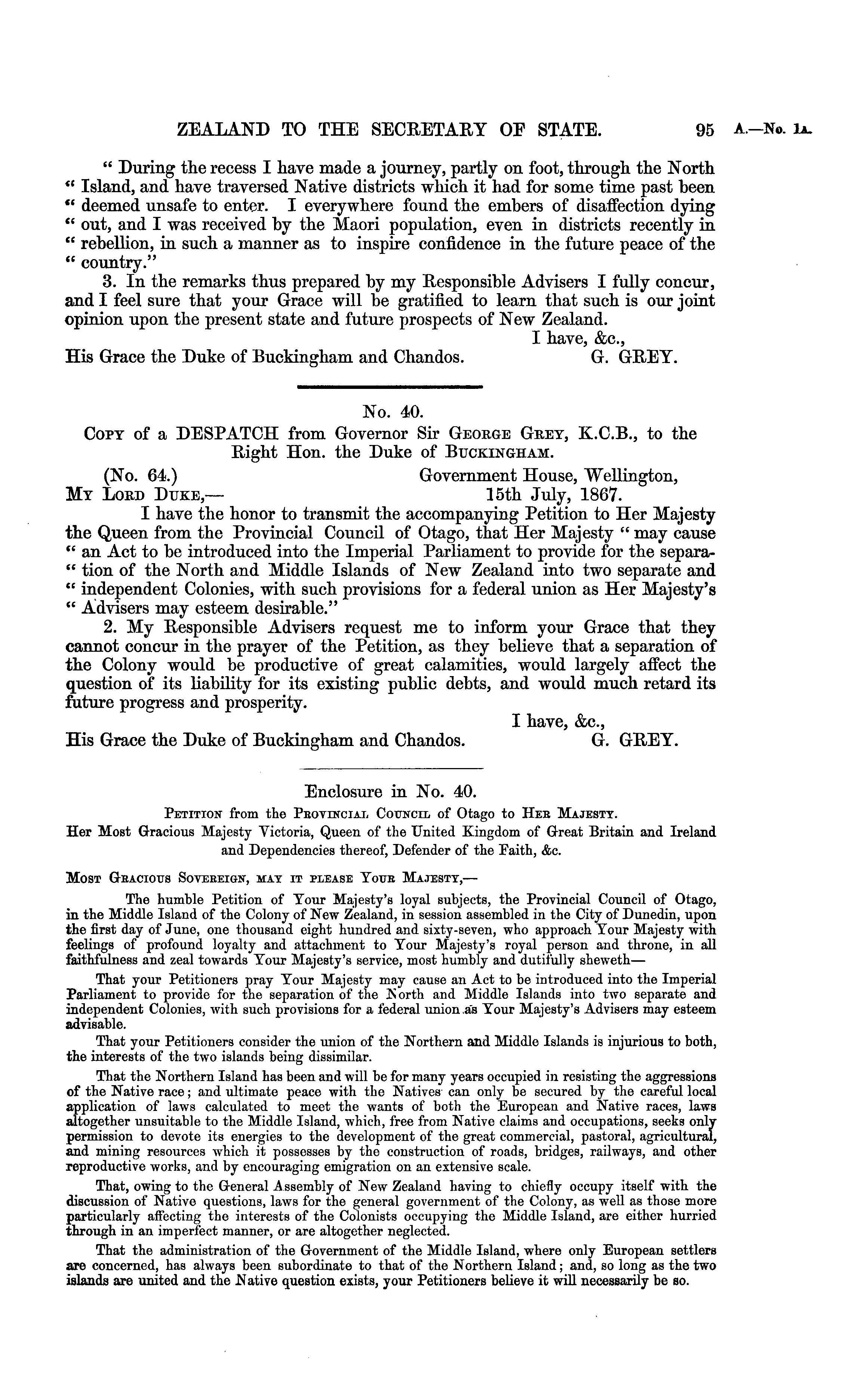 Enclosure in No. 10. Petition from the Peovincial Council of Otago to Hee Majestt. Her Most Gracious Majesty Victoria, Queen of the United Kingdom of Great Britain and Ireland and Dependencies thereof, Defender of the Faith, &c. Most Geacious Sovebeign, mat it please Youe Majestt,— The humble Petition of Your Majesty's loyal subjects, the Provincial Council of Otago, in the Middle Island of the Colony of New Zealand, in session assembled in the City of Dunedin, upon the first day of June, one thousand eight hundred and sixty-seven, who approach Your Majesty with feelings of profound loyalty and attachment to Your Majesty's royal person and throne, in all faithfulness and zeal towards Your Majesty's service, most humbly and dutifully sheweth— That your Petitioners pray Your Majesty may cause an Act to be introduced into the Imperial Parliament to provide for the separation of the Korth and Middle Islands into two separate and independent Colonies, with such provisions for a federal union as Your Majesty's Advisers may esteem advisable. That your Petitioners consider the union of the Northern and Middle Islands is injurious to both, the interests of the two islands being dissimilar. That the Northern Island has been and will be for many years occupied in resisting the aggressions of the Native race; and ultimate peace with the Natives can only be secured by the careful local application of laws calculated to meet the wants of both the European and Native races, laws altogether unsuitable to the Middle Island, which, free from Native claims and occupations, seeks only permission to devote its energies to the development of the great commercial, pastoral, agricultural, and mining resources which it possesses by the construction of roads, bridges, railways, and other reproductive works, and by encouraging emigration on an extensive scale. That, owing to the General Assembly of New Zealand having to chiefly occupy itself with the discussion of Native questions, laws for the general government of the Colony, as well as those more particularly affecting the interests of the Colonists occupying the Middle Island, are either hurried through in an imperfect manner, or are altogether neglected. That the administration of the Government of the Middle Island, where only European settlers are concerned, has always been subordinate to that of the Northern Island; and, so long as the two islands are united and the Native question exists, your Petitioners believe it will necessarily be so.