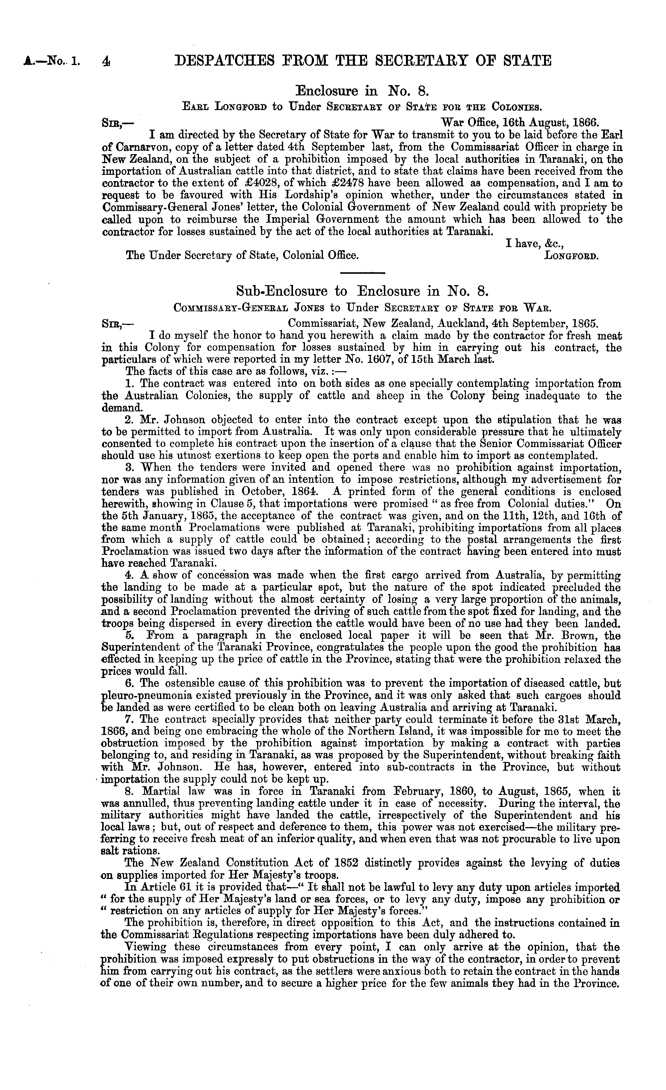 Enclosure in No. 8. Eael Longfoed to Under Seceetaet of State foe the Colonies. Sib,— War Office, 16th August, 1866. I am directed by the Secretary of State for War to transmit to you to be laid before the Earl of Carnarvon, copy of a letter dated 4th September last, from the Commissariat Officer in charge in New Zealand, on the subject of a prohibition imposed by the local authorities in Taranaki, on the importation of Australian cattle into that district, and to state that claims have been received from the contractor to the extent of £4028, of which £2478 have been allowed as compensation, and I am to request to be favoured with His Lordship's opinion whether, under the circumstances stated in Commissary-General Jones' letter, the Colonial Government of New Zealand could with propriety be called upon to reimburse the Imperial Government the amount which has been allowed to the contractor for losses sustained by the act of the local authorities at Taranaki. I have, &c, The Under Secretary of State, Colonial Office. Longfoed.
