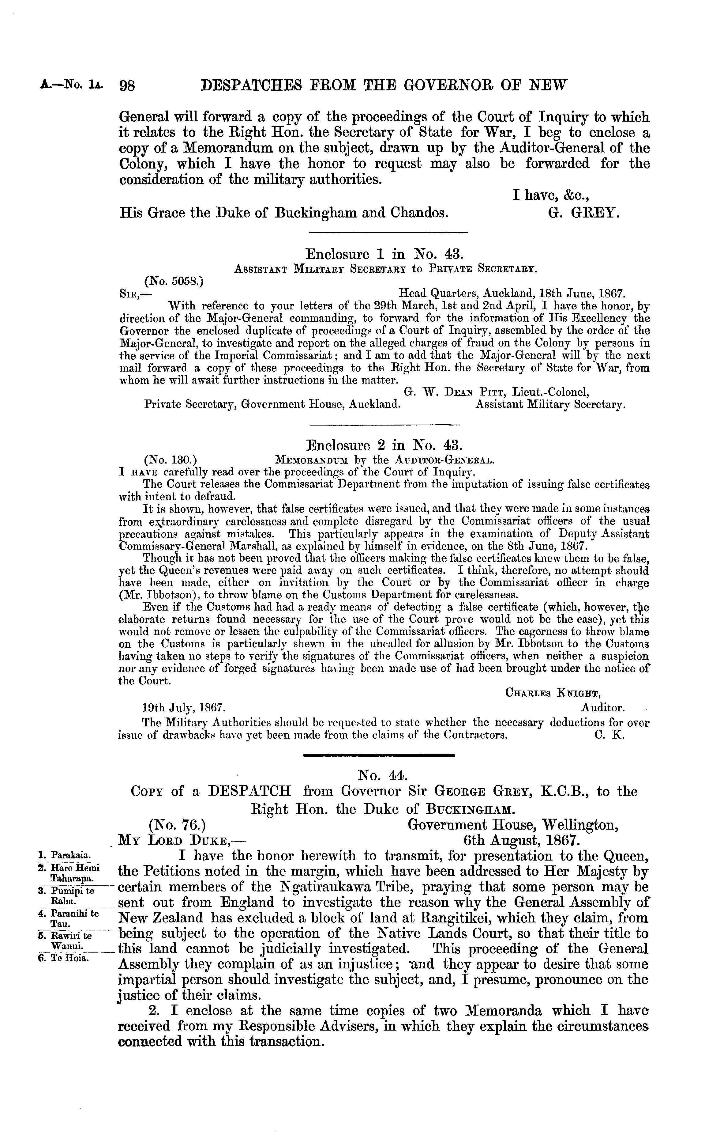 No. 44. Copy of a DESPATCH from Governor Sir George Grey, K.C.8., to the Right Hon. the Duke of Buckingham. (No. 76.) Government House, Wellington, . My Lord Duke, — 6th August, 1867. I have the honor herewith to transmit, for presentation to the Queen, the Petitions noted in the margin, which have been addressed to Her Majesty by - certain members of the Ngatiraukawa Tribe, praying that some person may be sent out from England to investigate the reason why the General Assembly of New Zealand has excluded a block of land at Rangitikei, which they claim, from being subject to the operation of the Native Lands Court, so that their title to _ this land cannot be judicially investigated. This proceeding of the General Assembly they complain of as an injustice; 'and they appear to desire that some impartial person should investigate the subject, and, I presume, pronounce on the justice of their claims. 2. I enclose at the same time copies of two Memoranda which I have received from my Responsible Advisers, in which they explain the circumstances connected with this transaction.