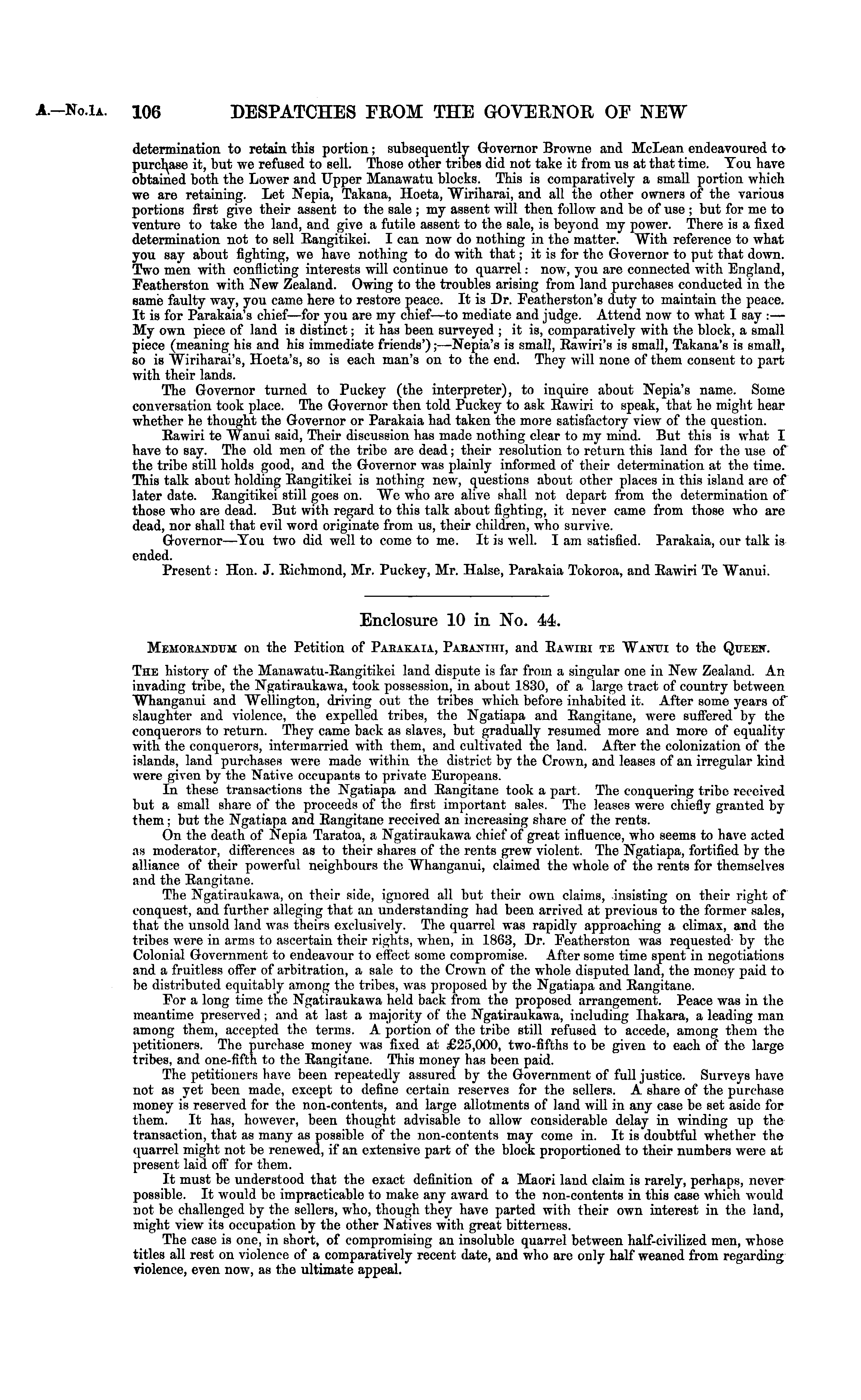 Enclosure 10 in No. 44. * Memoeandum on the Petition of Paeakaia, Paeanihi, and Bawiei te Wanui to the Queen. The history of the Manawatu-Bangitikei land dispute is far from a singular one in New Zealand. An invading tribe, the Ngatiraukawa, took possession, in about 1830, of a large tract of country between Whanganui and Wellington, driving out the tribes which before inhabited it. After some years of slaughter and violence, the expelled tribes, the Ngatiapa and Bangitane, were suffered by the conquerors to return. They came back as slaves, but gradually resumed more and more of equality with the conquerors, intermarried with them, and cultivated the land. After the colonization of the islands, land purchases were made within the district by the Crown, and leases of an irregular kind were given by the Native occupants to private Europeans. In these transactions the Ngatiapa and Bangitane took a part. The conquering tribe received but a small share of the proceeds of the first important sales. The leases were chiefly granted by them; but the Ngatiapa and Bangitane received an increasing share of the rents. On the death of Nepia Taratoa, a Ngatiraukawa chief of great influence, who seems to have acted as moderator, differences as to their shares of the rents grew violent. The Ngatiapa, fortified by the alliance of their powerful neighbours the Whanganui, claimed the whole of the rents for themselves and the Bangitane. The Ngatiraukawa, on their side, ignored all but their own claims, insisting on their right of conquest, and further alleging that an understanding had been arrived at previous to the former sales, that the unsold land was theirs exclusively. The quarrel was rapidly approaching a climax, and tho tribes were in arms to ascertain their rights, when, in 1863, Dr. Featherston was requested by the Colonial Government to endeavour to effect some compromise. After some time spent in negotiations and a fruitless offer of arbitration, a sale to the Crown of the whole disputed land, the money paid to be distributed equitably among the tribes, was proposed by the Ngatiapa and Bangitane. For a long time the Ngatiraukawa held back from the proposed arrangement. Peace was in the meantime preserved; and at last a majority of the Ngatiraukawa, including Ihakara, a leading man among them, accepted the terms. A portion of the tribe still refused to accede, among them tho petitioners. The purchase money was fixed at £25,000, two-fifths to be given to each of the large tribes, and one-fifth to the Bangitane. This money has been paid. The petitioners have been repeatedly assured by the Government of full justice. Surveys have not as yet been made, except to define certain reserves for the sellers. A share of the purchase money is reserved for the non-contents, and large allotments of land will in any case be set aside for them. It has, however, been thought advisable to allow considerable delay in winding up the transaction, that as many as possible of the non-contents may come in. It is doubtful whether the quarrel might not be renewed, if an extensive part of the block proportioned to their numbers were at present laid off for them. It must be understood that the exact definition of a Maori land claim is rarely, perhaps, never possible. It would be impracticable to make any award to the non-contents in this case which would not be challenged by the sellers, who, though they have parted with their own interest in the land, might view its occupation by the other Natives with great bitterness. The case is one, in short, of compromising an insoluble quarrel between half-civilized men, whose titles all rest on violence of a comparatively recent date, and who are only half weaned from regarding violence, even now, as the ultimate appeal.