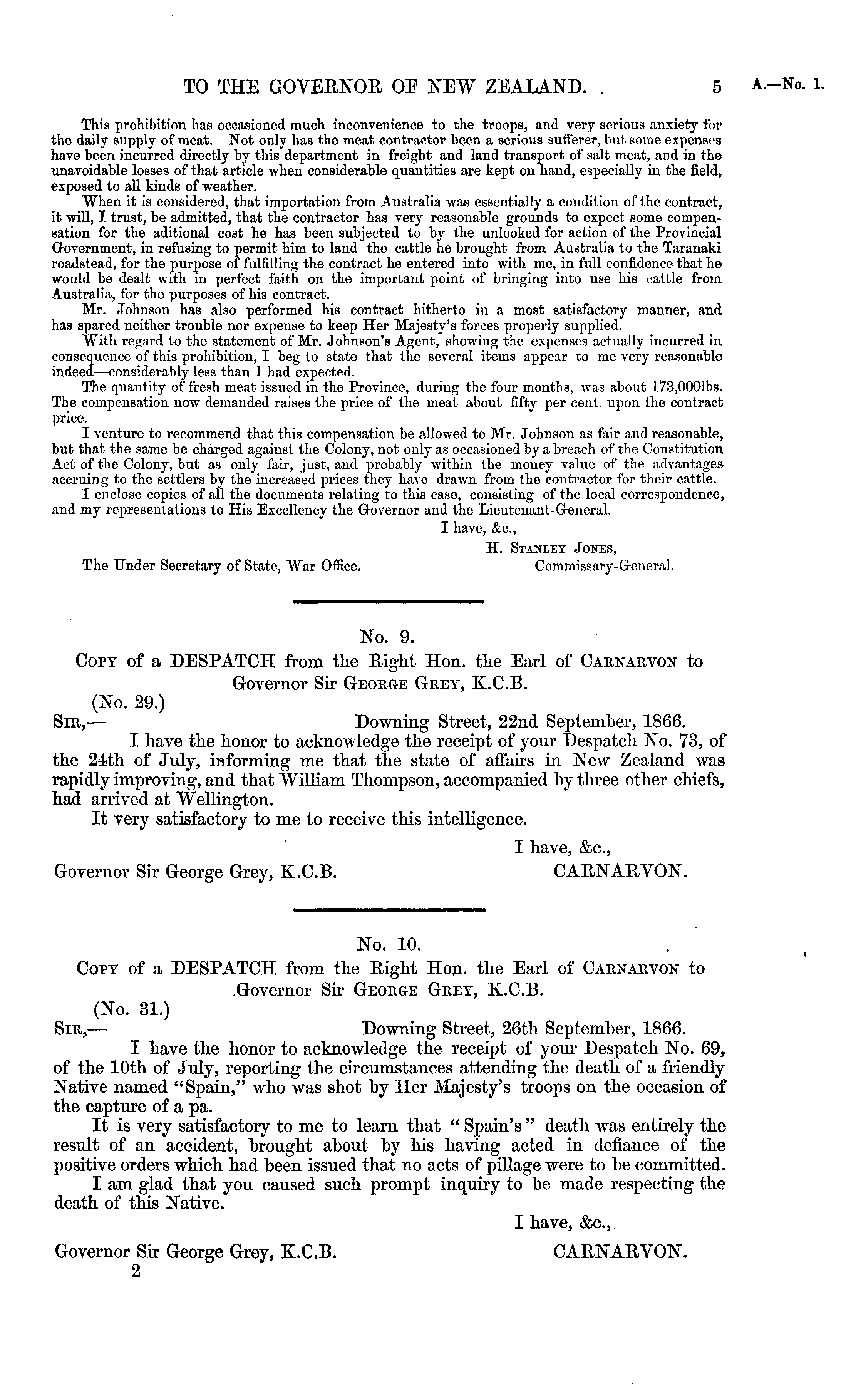 No. 10. Copy of a DESPATCH from the Right Hon. the Earl of Carnarvon to Governor Sir George Grey, K.C.B. (No. 31.) Sir, — Downing Street, 26th September, 1866. I have the honor to acknowledge the receipt of your Despatch No. 69, of the 10th of July, reporting the circumstances attending the death of a friendly Native named "Spain," who was shot by Her Majesty's troops on the occasion of the capture of a pa. It is very satisfactory to me to learn that " Spain's " death was entirely the result of an accident, brought about by his having acted in defiance of the positive orders which had been issued that no acts of pfilage were to be committed. I am glad that you caused such prompt inquiry to be made respecting the death of this Native. I have, &c, Governor Sir George Grey, K.C.B. CARNARVON. 2
