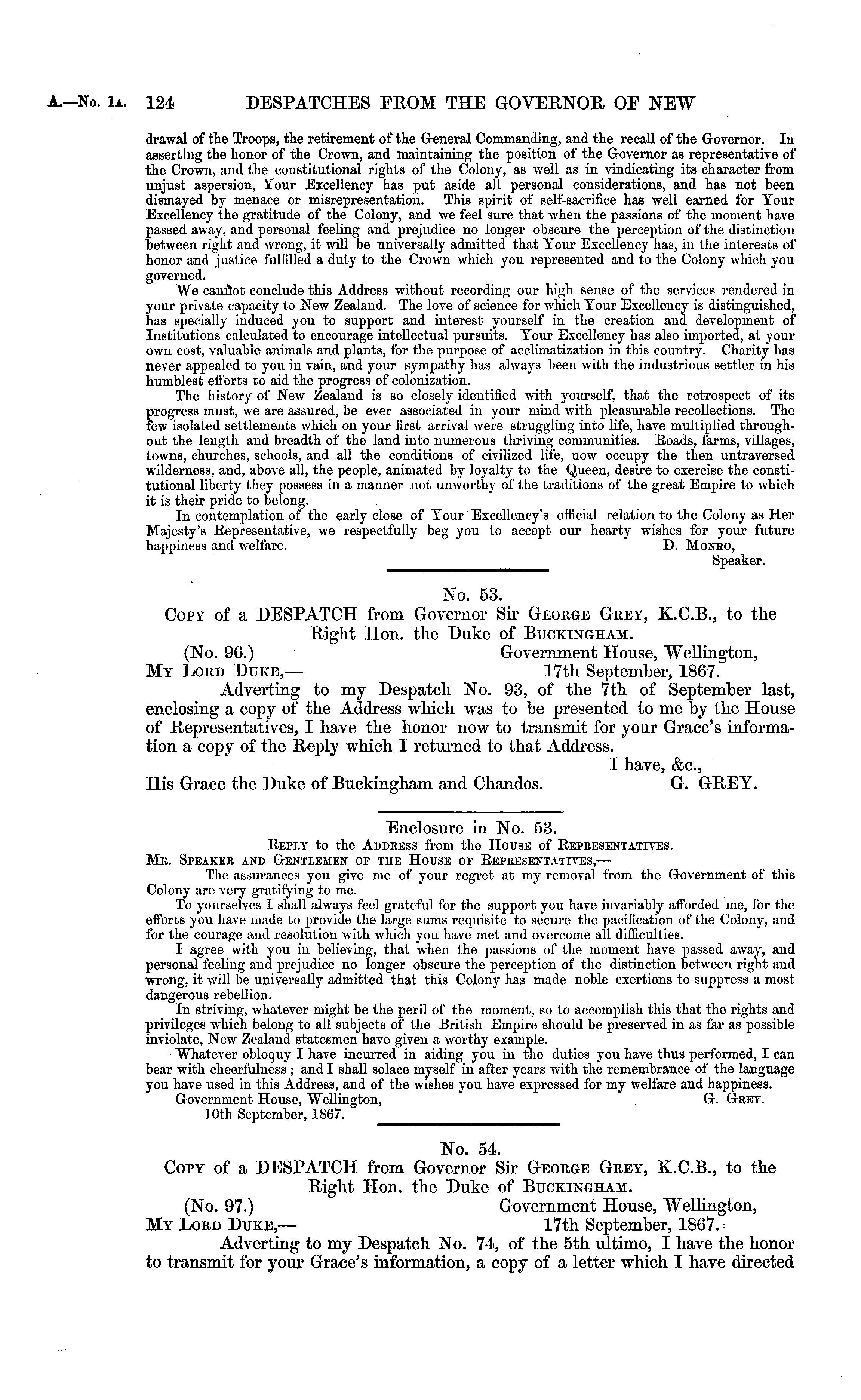 No. 53. Copy of a DESEATCH from Governor Sir George Grey, K.C.8., to the Right Hon. the Duke of Buckingham. (No. 96.) Government House, Wellington, My Lord Duke, — 17th September, 1867. Adverting to my Despatch No. 93, of the 7th of September last, enclosing a copy of the Address which was to be presented to me by the House of Representatives, I have the honor now to transmit for your Grace's information a copy of the Reply which I returned to that Address. I have, &c, His Grace the Duke of Buckingham and Chandos. G. GREY.