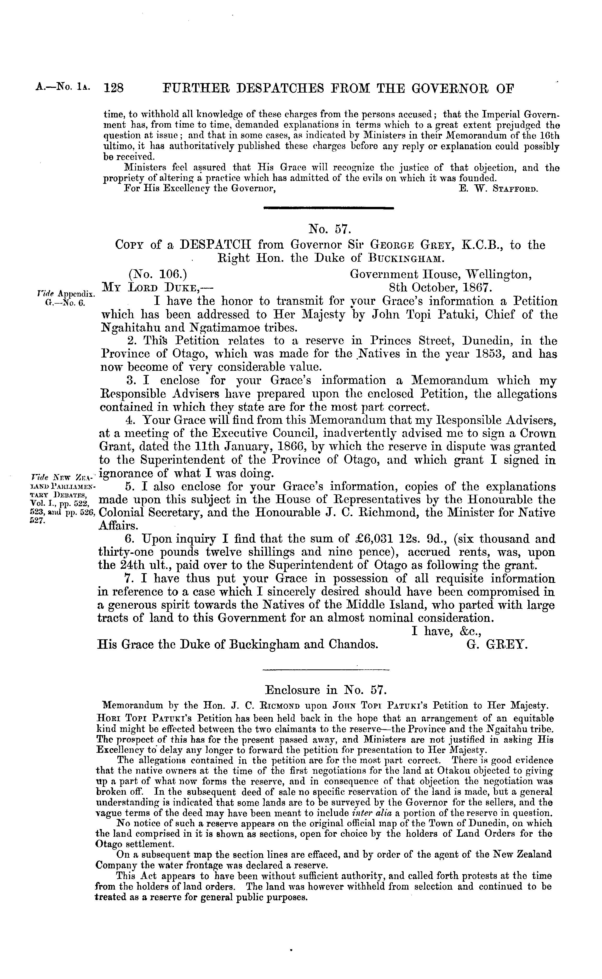 No. 57. Copy of a DESEATCH from Governor Sir George Grey, K.C.8., to the Right Hon. the Duke of Buckingham. (No. 106.) Government House, Wellington, My Lord Duke, — Bth October, 1867. I have the honor to transmit for vour Grace's information a Eetition « which has been addressed to Her Majesty by John Topi Eatuki, Chief of the Ngahitahu and Ngatimamoe tribes. 2. This Eetition relates to a reserve in Erinces Street, Dunedin, in the Brovince of Otago, which was made for the Natives in the year 1853, and has now become of very considerable value. 3. I enclose for your Grace's information a Memorandum which my Responsible Advisers have prepared upon the enclosed Eetition, the allegations contained in which they state are for the most part correct. 1. Your Grace will find from this Memorandum that my Responsible Advisers, at a meeting of the Executive Council, inadvertently advised me to sign a Crown Grant, dated the 11th January, 1866, by which the reserve in dispute was granted to the Superintendent of the Erovince of Otago, and which grant I signed in ignorance of what I was doing. 5. I also enclose for your Grace's information, copies of the explanations made upon this subject in the House of Representatives by the Honourable the Colonial Secretary, and the Honourable J. C. Richmond, the Minister for Native Affairs. 6. Upon inquiry I find that the sum of £6,031 12s. 9d., (six thousand and thirty-one pounds twelve shillings and nine pence), accrued rents, was, upon the 21th ult., paid over to the Superintendent of Otago as following the grant. 7. I have thus put your Grace in possession of all requisite information in reference to a case which I sincerely desired should have been compromised in a generous spirit towards the Natives of the Middle Island, who parted with large tracts of land to this Government for an almost nominal consideration. I have, &c, His Grace the Duke of Buckingham and Chandos. G. GREY.