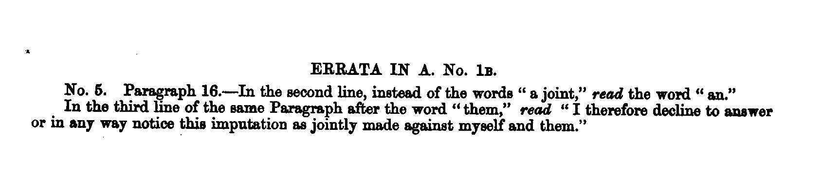 No. 5. Paragraph 16. —In the second line, instead of the words " a joint," read the word " an." In the third line of the same Paragraph after the word " them," read " I therefore decline to answer or in any way notice this imputation as jointly made against myself and them."