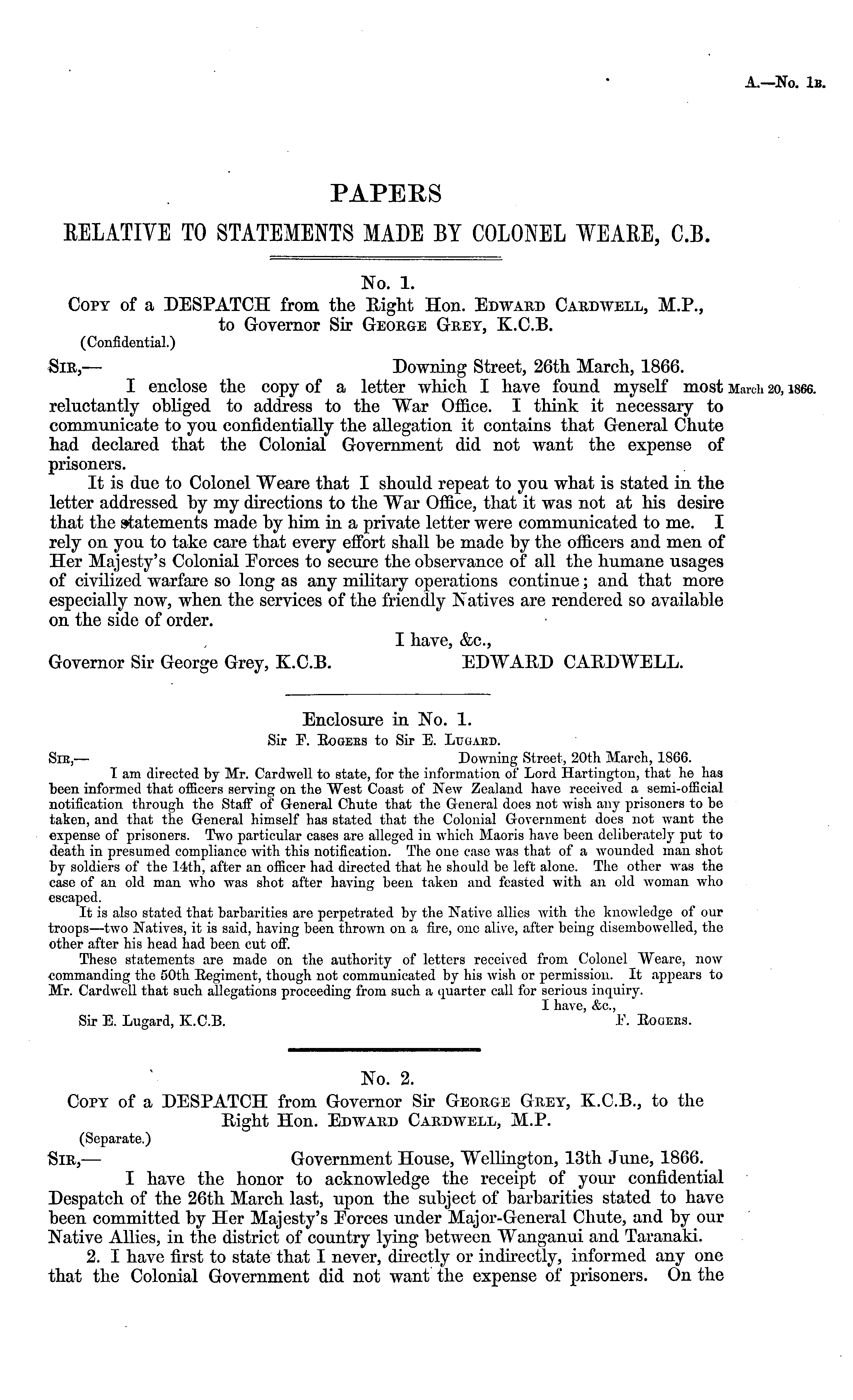 No. 1. Copt of a DESPATCH from the Right Hon. Edward Cardwell, M.P., to Governor Sir George Grey, K.C.B. (Confidential.) Sir,— Downing Street, 26th March, 1866. I enclose the copy of a letter which I have found myself most reluctantly obliged to address to the War Office. I think it necessary to communicate to you confidentially the allegation it contains that General Chute had declared that the Colonial Government did not want the expense of prisoners. It is due to Colonel Weare that I should repeat to you what is stated in the letter addressed by my directions to the War Office, that it was not at his desire that the statements made by him in a private letter were communicated to me. I rely on you to take care that every effort shall be made by the officers and men of Her Majesty's Colonial Forces to secure the observance of all the humane usages of civilized warfare so long as any military operations continue; and that more especially now, when the services of the friendly Natives are rendered so available on the side of order. I have, &c, Governor Sir George Grey, K.C.B. EDWARD CARDWELL.