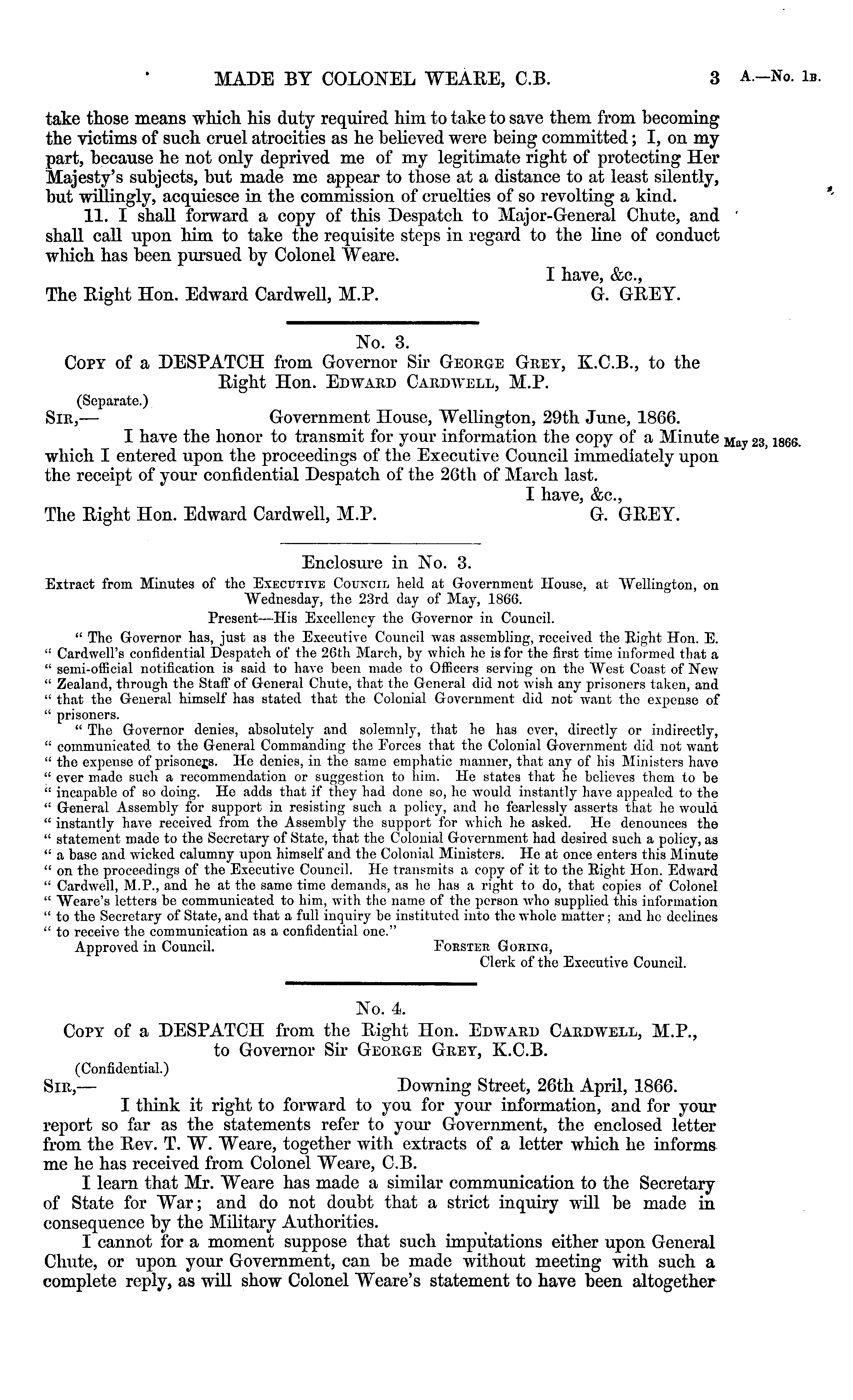 No. 3. Copy of a DESPATCH from Governor Sir George Grey, K.C.8., to the Right Hon. Edward Cardwell, M.P. (Separate.) Sir, — Government House, Wellington, 29th June, 1866. I have the honor to transmit for your information the copy of a Minute which I entered upon the proceedings of the Executive Council immediately upon the receipt of your confidential Despatch of the 26th of March last. I have, &c, The Right Hon. Edward Cardwell, M.P. G. GREY.