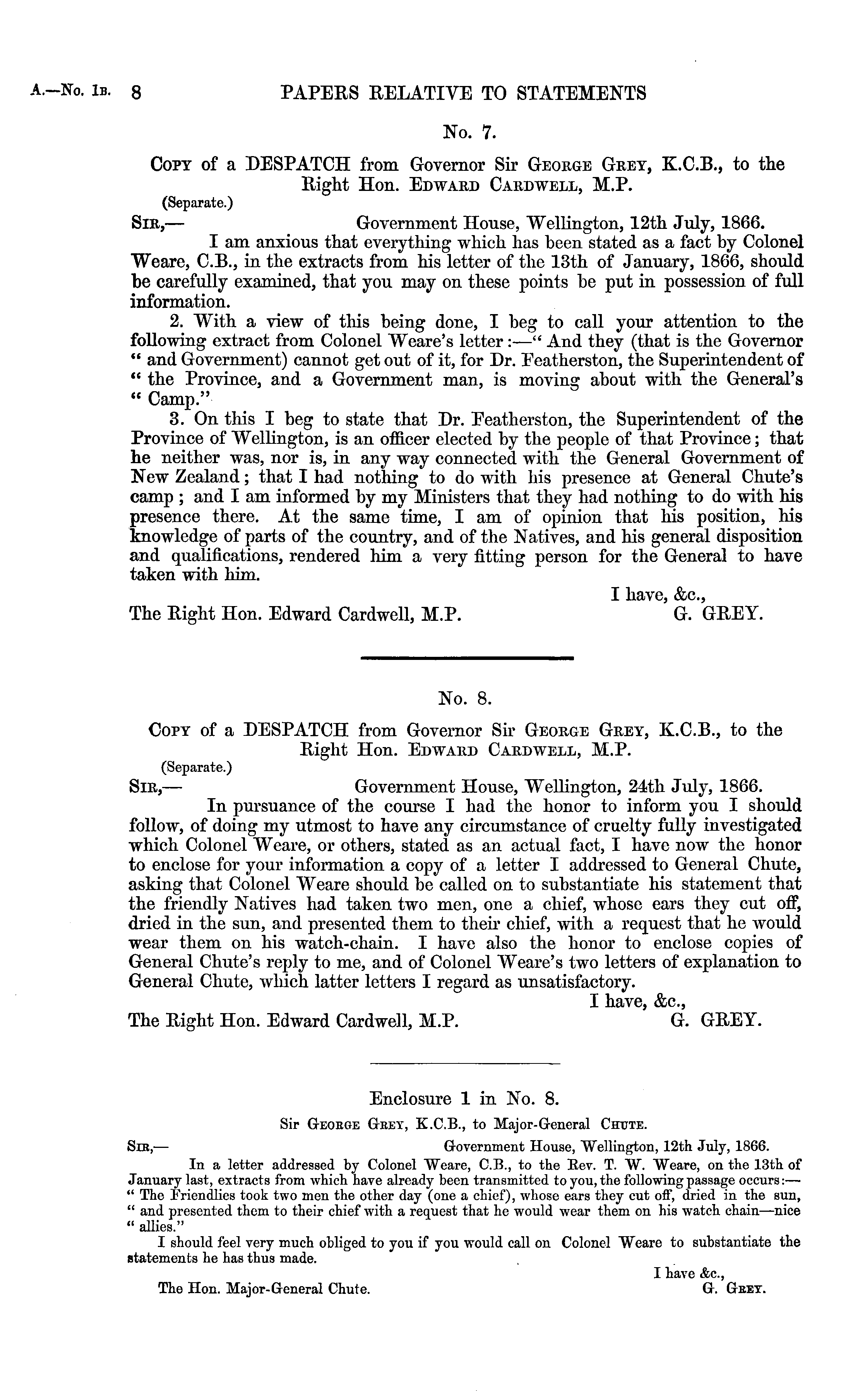 No. 8. Copy of a DESPATCH from Governor Sir George Grey, K.C.8., to the Right Hon. Edward Cardwell, M.P. (Separate.) Sir, — Government House, Wellington, 24th July, 1866. In pursuance of the course I had the honor to inform you I should follow, of doing my utmost to have any circumstance of cruelty fully investigated which Colonel Weare, or others, stated as an actual fact, I have now the honor to enclose for your information a copy of a letter I addressed to General Chute, asking that Colonel Weare should be called on to substantiate his statement that the friendly Natives had taken two men, one a chief, whose ears they cut off, dried in the sun, and presented them to their chief, with a request that he would wear them on his watch-chain. I have also the honor to enclose copies of General Chute's reply to me, and of Colonel Weare's two letters of explanation to General Chute, which latter letters I regard as unsatisfactory. I have, &c, The Right Hon. Edward Cardwell, M.P. G. GREY.