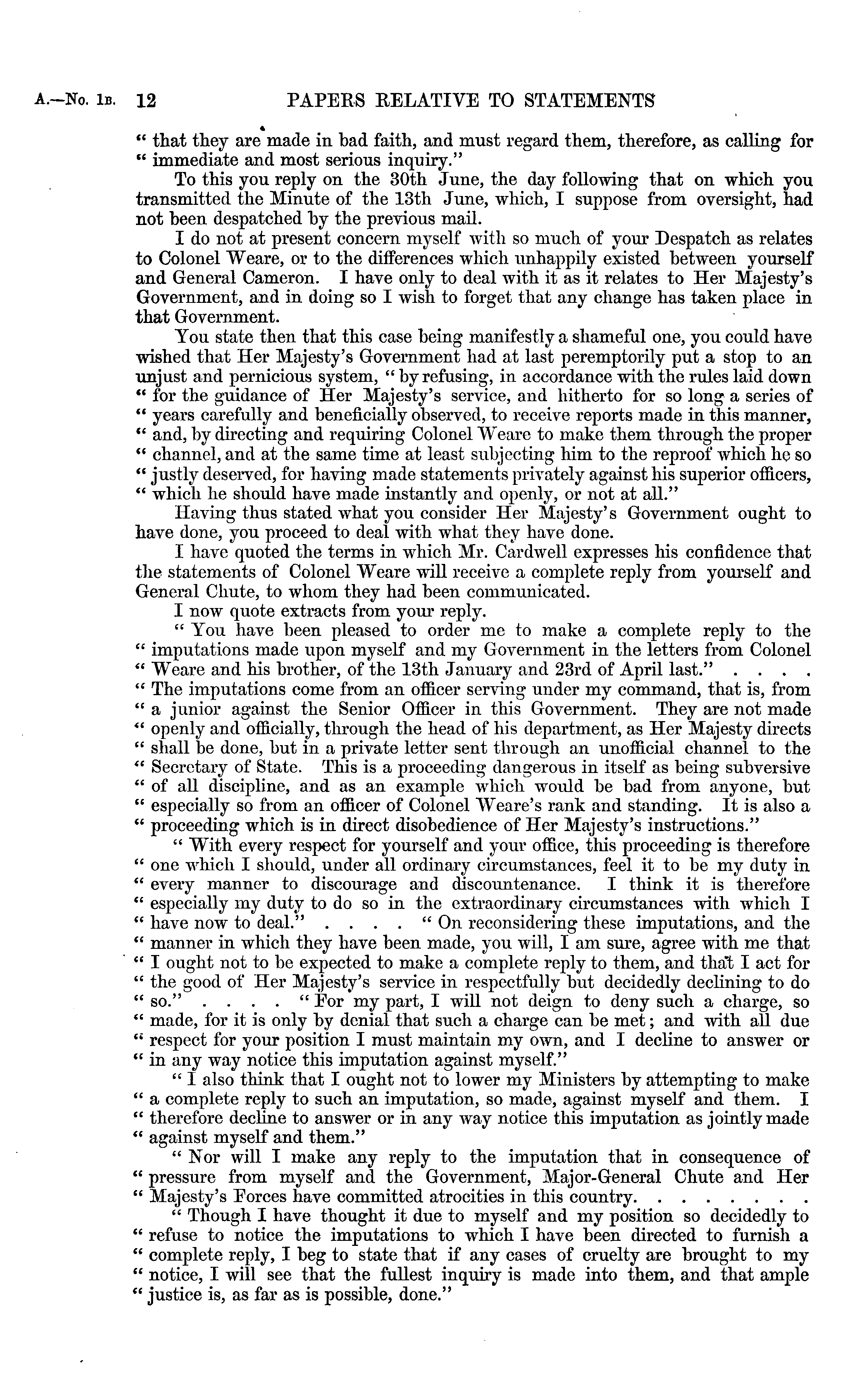 " that they are made in bad faith, and must regard them, therefore, as calling for " immediate and most serious inquiry." To this you reply on the 30th June, the day following that on which you transmitted the Minute of the 13th June, which, I suppose from oversight, had not been despatched by the previous mail. I do not at present concern myself with so much of your Despatch as relates to Colonel Weare, or to the differences which unhappily existed between yourself and General Cameron. I have only to deal with it as it relates to Her Majesty's Government, and in doing so I wish to forget that any change has taken place in that Government. You state then that this case being manifestly a shameful one, you could have wished that Her Majesty's Government had at last peremptorily put a stop to an unjust and pernicious system, " by refusing, in accordance with the rules laid down " for the guidance of Her Majesty's service, and hitherto for so long a series of " years carefully and beneficially observed, to receive reports made in this manner, " and, by directing and requiring Colonel W'eare to make them through the proper " channel, and at the same time at least subjecting him to the reproof which he so " justly deserved, for having made statements privately against his superior officers, " which he should have made instantly and openly, or not at all." Having thus stated what you consider Her Majesty's Government ought to have done, you proceed to deal with what they have done. I have quoted the terms in which Mr. Cardwell expresses his confidence that the statements of Colonel Weare will receive a complete reply from yourself and General Chute, to whom they had been communicated. I now quote extracts from your reply. " You have been pleased to order me to make a complete reply to the " imputations made upon myself and my Government in the letters from Colonel " Weare and his brother, of the 13th January and 23rd of April last." .... " The imputations come from an officer serving under my command, that is, from " a junior against the Senior Officer in this Government. They are not made " openly and officially, through the head of his department, as Her Majesty directs " shall be done, but in a private letter sent through an unofficial channel to the " Secretary of State. This is a proceeding dangerous in itself as being subversive " of all discipline, and as an example which would be bad from anyone, but " especially so from an officer of Colonel Weare's rank and standing. It is also a " proceeding which is in direct disobedience of Her Majesty's instructions." " With every respect for yourself and your office, this proceeding is therefore " one which I should, under all ordinary circumstances, feel it to be my duty in " every manner to discourage and discountenance. I think it is therefore " especially my duty to do so in the extraordinary circumstances with which I " have now to deal." . . . . "On reconsidering these imputations, and the " manner in which they have been made, you will, I am sure, agree with me that " I ought not to be expected to make a complete reply to them, and that I act for " the good of Her Majesty's service in respectfully but decidedly declining to do " so." . . " For my part, I will not deign to deny such a charge, so " made, for it is only by denial that such a charge can be met; and with all due M respect for your position I must maintain my own, and I decline to answer or " in any way notice this imputation against myself." . I also think that I ought not to lower my Ministers by attempting to make " a complete reply to such an imputation, so made, against myself and them. I " therefore decline to answer or in any way notice this imputation as jointly made " against myself and them." " Nor will I make any reply to the imputation that in consequence of " pressure from myself and the Government, Major-General Chute and Her " Majesty's Forces have committed atrocities in this country " Though I have thought it due to myself and my position so decidedly to " refuse to notice the imputations to which I have been directed to furnish a " complete reply, I beg to state that if any cases of cruelty are brought to my " notice, I will see that the fullest inquiry is made into them, and that ample " justice is, as far as is possible, done."