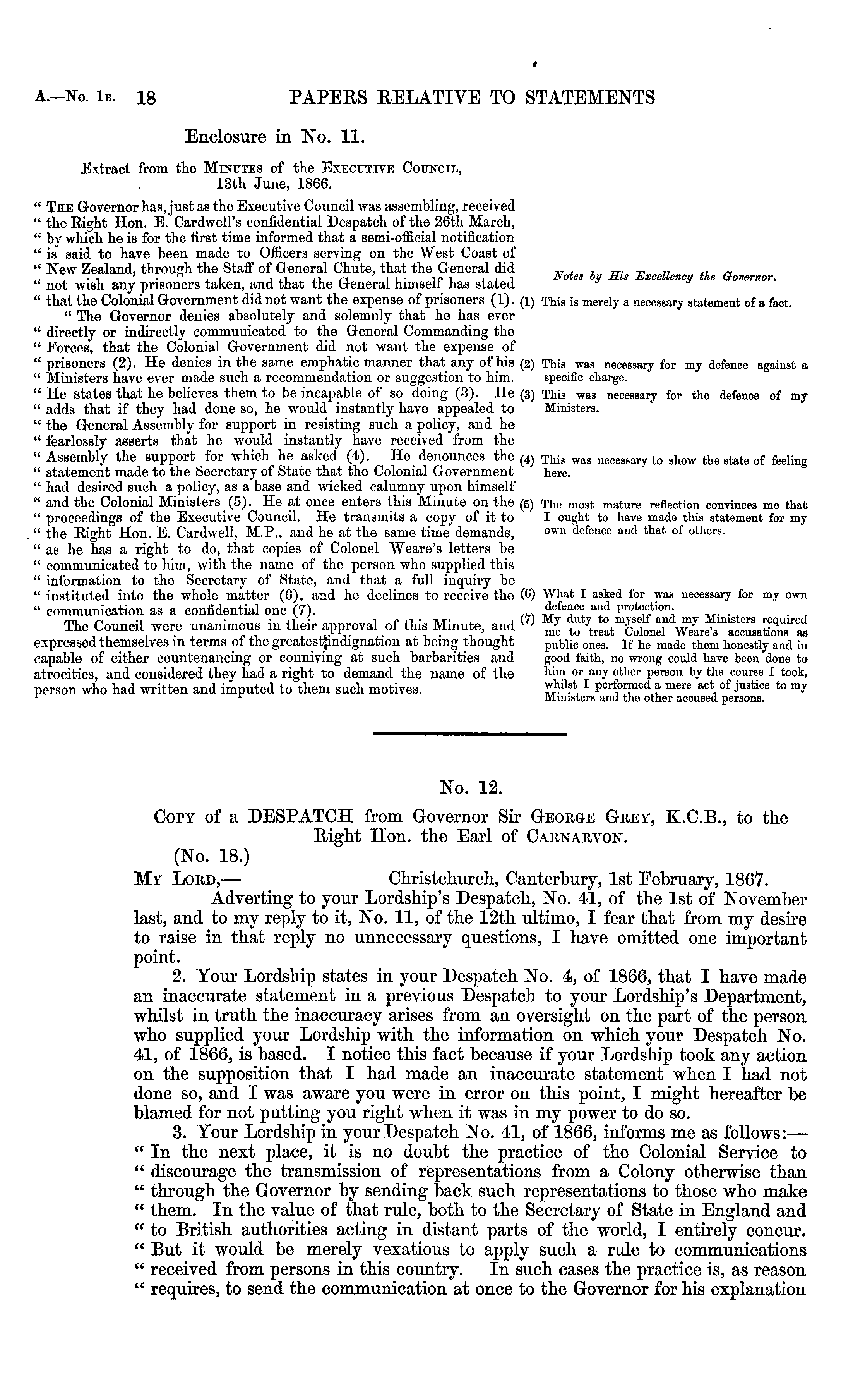 Enclosure in No. 11. Extract from the Minutes of the Executive Council, 13th June, 1866. " The Governor has, just as the Executive Council was assembling, received " the Right Hon. E. Cardwell's confidential Despatch of tho 26th March, " by which he is for the first time informed that a semi-official notification " is said to have been made to Officers serving on the West Coast of " New Zealand, through the Staff of General Chute, that the General did —. . J —, _ .. „ ~ ~, -xi ~i, ,i » ~. -~., i.j.j dotes by His Excellency the Governor. not wish any prisoners taken, and that the General himseit has stated " that the Colonial Government did not want the expense of prisoners (1). (l) This is merely a necessary statement of a fact. " The Governor denies absolutely and solemnly that he has ever " directly or indirectly communicated to the General Commanding the " Forces, that the Colonial Government did not want the expense of " prisoners (2). He denies in the same emphatic manner that any of his (2) This was necessary for my defence against a " Ministers have ever made such a recommendation or suggestion to him. specific charge. "He states that he believes them to be incapable of so doing (3). He (3) This was necessary for the defence of my " adds that if they had done so, he would instantly have appealed to Ministers. " the General Assembly for support in resisting such a policy, and he " fearlessly asserts that he would instantly have received from the " Assembly the support for which he asked (4). He denounces the (4) Tins was necessary to show the state of feeling " statement made to the Secretary of State that the Colonial Government here. " had desired such a policy, as a base and wicked calumny upon himself " and the Colonial Ministers (5). He at once enters this Minute on the (5) The most mature reflection conyinces me that " proceedings of the Executive Council. He transmits a copy of it to I ought to hare made this statement for my " the Eight Hon. E. Cardwcll, M.P., and he at the same time demands, own defence aud that of others. " as he has a right to do, that copies of Colonel Weare's letters be " communicated to him, with the name of the person who supplied this " information to the Secretary of State, and that a full inquiry be " instituted into the whole matter (6), and he declines to receive the (6) What I asked for was necessary for my own " communication as a confidential one (7). ,„ ,d, eflT o and protection. The Council were unanimous in their approval .of tMs Minute, and «» Stt£-fiWRSK£L^ expressed themselves in terms ot the greatest|indignation at being thought public ones. If he made them honestly and in capable of either countenancing or conniving at such barbarities and good faith, no wrong could have been done to atrocities, and considered they had a right to demand the name of the him or any other person by the course I took, person who had written and imputed to them such motives. Ut r performed a mere act of juatice to my r x Ministers and the other accused persons.