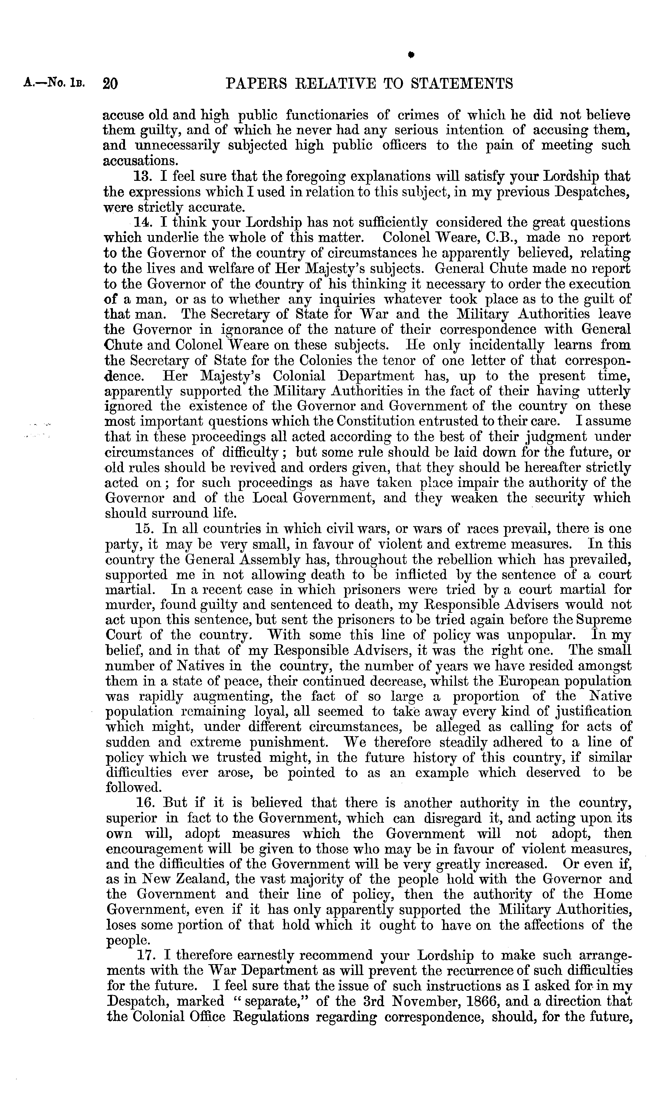 accuse old and high public functionaries of crimes of which he did not believe them guilty, and of which he never had any serious intention of accusing them, and unnecessarily subjected high public officers to the pain of meeting such accusations. 13. I feel sure that the foregoing explanations will satisfy your Lordship that the expressions which I used in relation to this subject, in my previous Despatches, were strictly accurate. 14. I think your Lordship has not sufficiently considered the great questions which underlie the whole of this matter. Colonel Weare, C.8., made no report to the Governor of the country of circumstances he apparently believed, relating to the lives and welfare of Her Majesty's subjects. General Chute made no report to the Governor of the country of his thinking it necessary to order the execution of a man, or as to whether any inquiries whatever took place as to the guilt of that man. The Secretary of State for War and the Military Authorities leave the Governor in ignorance of the nature of their correspondence with General Chute and Colonel Weare on these subjects. He only incidentally learns from the Secretary of State for the Colonies the tenor of one letter of that correspondence. Her Majesty's Colonial Department has, up to the present time, apparently supported the Military Authorities in the fact of their having utterly ignored the existence of the Governor and Government of the country on these most important questions which the Constitution entrusted to their care. I assume that in these proceedings all acted according to the best of their judgment under circumstances of difficulty ; but some rule should be laid down for the future, or old rules should be revived and orders given, that they should be hereafter strictly acted on; for such proceedings as have taken place impair the authority of the Governor and of the Local Government, and they weaken the security which should surround life. 15. In all countries in which civil wars, or Avars of races prevail, there is one party, it may be very small, in favour of violent and extreme measures. In this country the General Assembly has, throughout the rebellion which has prevailed, supported me in not allowing death to be inflicted by the sentence of a court martial. In a recent case in which }_isoners were tried by a court martial for murder, found guilty and sentenced to death, my Responsible Advisers would not act upon this sentence, but sent the prisoners to be tried again before the Supreme Court of the country. With some this line of policy was unpopular. In my belief, and in that of my Responsible Advisers, it was the right one. The small number of Natives in the country, the number of years we haA'e resided amongst them in a state of peace, their continued decrease, whilst the European population was rapidly augmenting, the fact of so large a proportion of the Native population remaining loyal, all seemed to take aAvay every kind of justification which might, under different circumstances, be alleged as calling for acts of sudden and extreme punishment. We therefore steadily adhered to a line of policy which Ave trusted might, in the future history of this country, if similar difficulties ever arose, be pointed to as an example which deserved to be followed. 16. But if it is believed that there is another authority in the country, superior in fact to the Government, which can disregard it, and acting upon its own will, adopt measures which the Government Avill not adopt, then encouragement will be given to those who may be in favour of violent measures, and the difficulties of the Government Avill be very greatly increased. Or even if, as in New Zealand, the vast majority of the people hold with the Governor and the Government and their line of policy, then the authority of the Home Government, even if it has only apparently supported the Military Authorities, loses some portion of that hold which it ought to have on the affections of the people. 17. I therefore earnestly recommend your Lordship to make such arrangements Avith the War Department as will prevent the recurrence of such difficulties for the future. I feel sure that the issue of such instructions as I asked for in my Despatch, marked " separate," of the 3rd November, 1866, and a direction that the Colonial Office Regulations regarding correspondence, should, for the future,