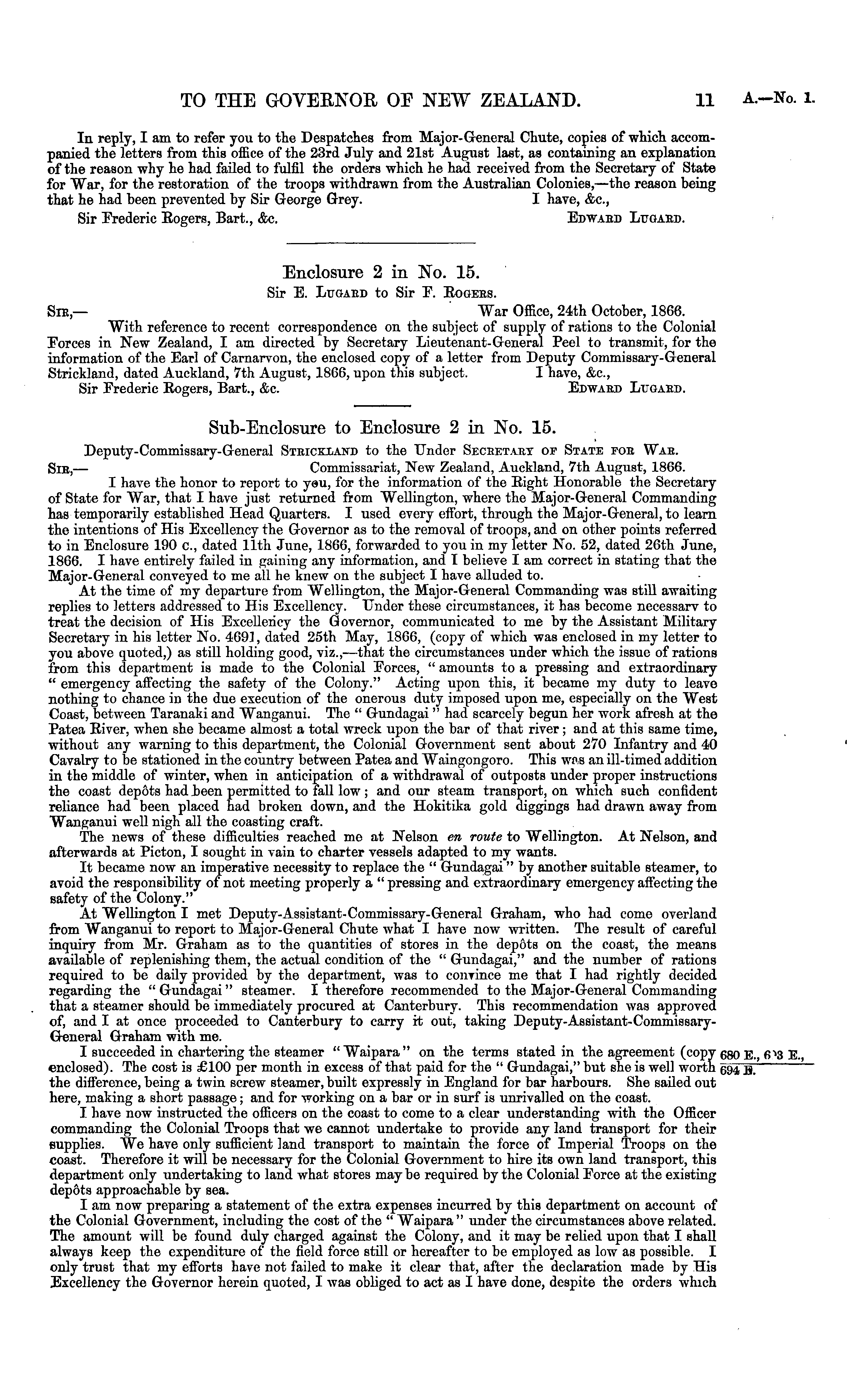 Enclosure 2 in No. 15. Sir E. Lugaed to Sir F. Eogees. Sie— War Office, 24th October, 1866. With reference to recent correspondence on the subject of supply of rations to the Colonial Forces in New Zealand, I am directed by Secretary Lieutenant-General Peel to transmit, for the information of the Earl of Carnarvon, the enclosed copy of a letter from Deputy Commissary-General Strickland, dated Auckland, 7th August, 1866, upon this subject. I have, &c, Sir Frederic Eogers, Bart., &c. Edwaed Lugaed.