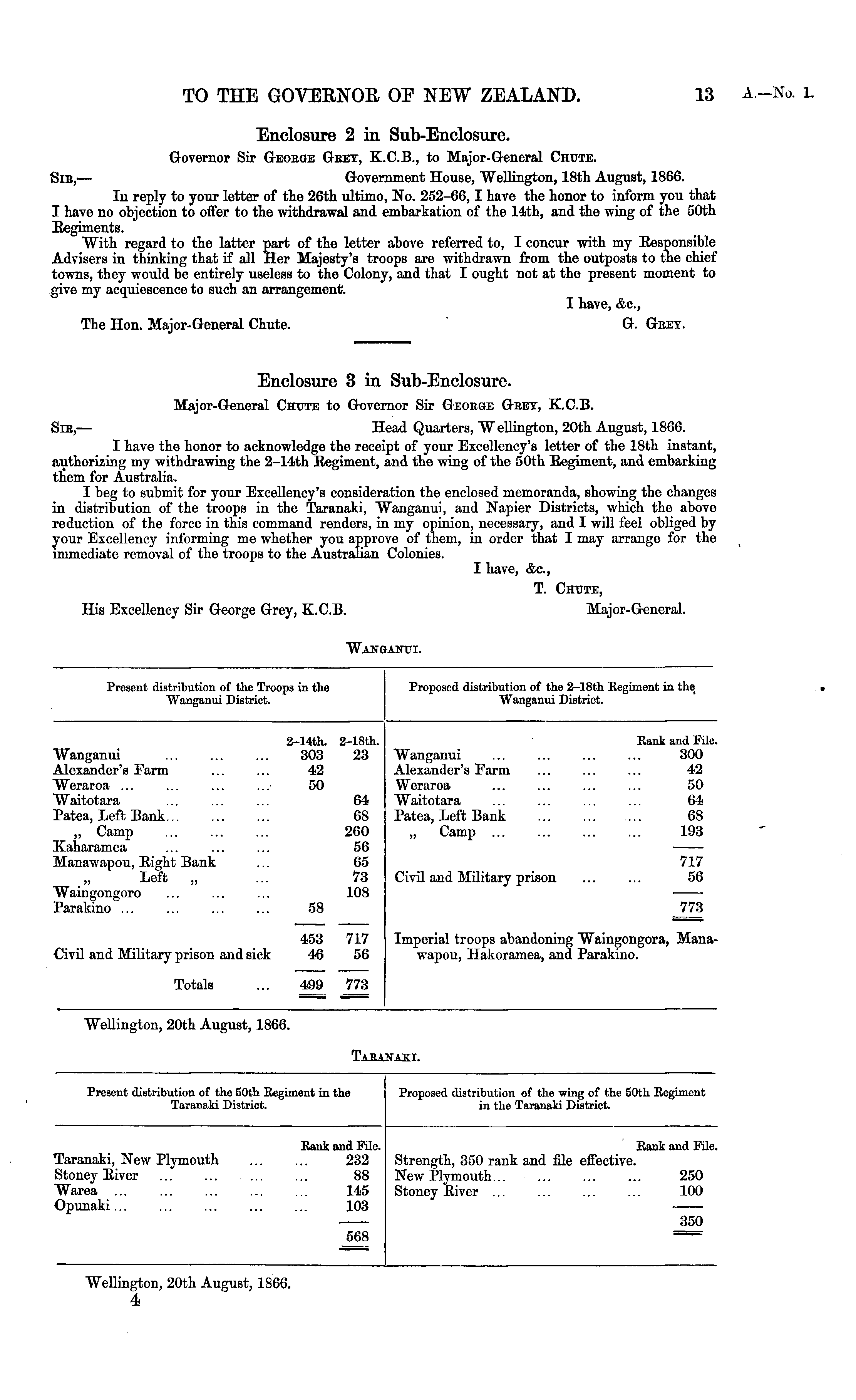 Enclosure 3 in Sub-Enclosure. Major-General Chute to Governor Sir Geoege Geet, K.C.B. Sie,— Head Quarters, Wellington, 20th August, 1866. I have the honor to acknowledge the receipt of your Excellency's letter of the 18th instant, authorizing my withdrawing the 2-14th Eegiment, and the wing of the 50th Eegiment, and embarking them for Australia. I beg to submit for your Excellency's consideration the enclosed memoranda, showing the changes in distribution of the troops in the Taranaki, Wanganui, and Napier Districts, which the above reduction of the force in this command renders, in my opinion, necessary, and I will feel obliged by your Excellency informing me whether you approve of them, in order that I may arrange for the immediate removal of the troops to the Australian Colonies. I have, &c., T. Chute, His Excellency Sir George Grey, K.C.B. Major-General.