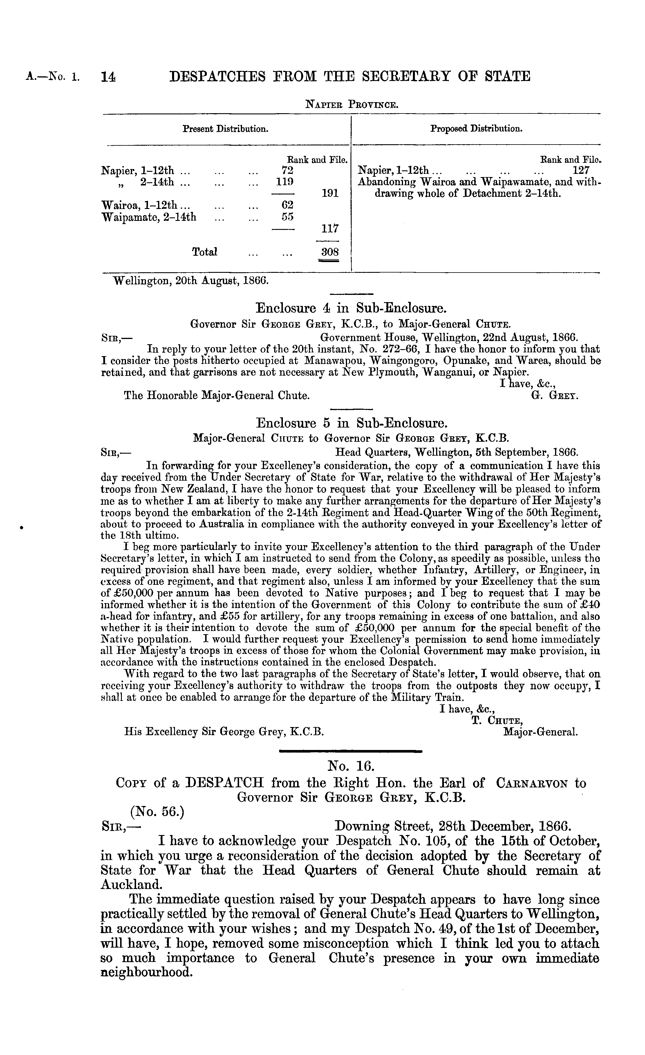 No. 16. Copy of a DESPATCH from the Right Hon. the Earl of Carnarvon to Governor Sir George Grey, K.C.B. (No. 56.) Sir, — Downing Street, 28th December, 1866. I have to acknowledge your Despatch No. 105, of the 15th of October, in which you urge a reconsideration of the decision adopted by the Secretary of State for War that the Head Quarters of General Chute should remain at Auckland. The immediate question raised by your Despatch appears to have long since practically settled by the removal of General Chute's Head Quarters to Wellington, in accordance with your wishes ; and my Despatch No. 49, of the Ist of December, will have, I hope, removed some misconception which I think led you to attach so much importance to General Chute's presence in your own immediate neighbourhood.