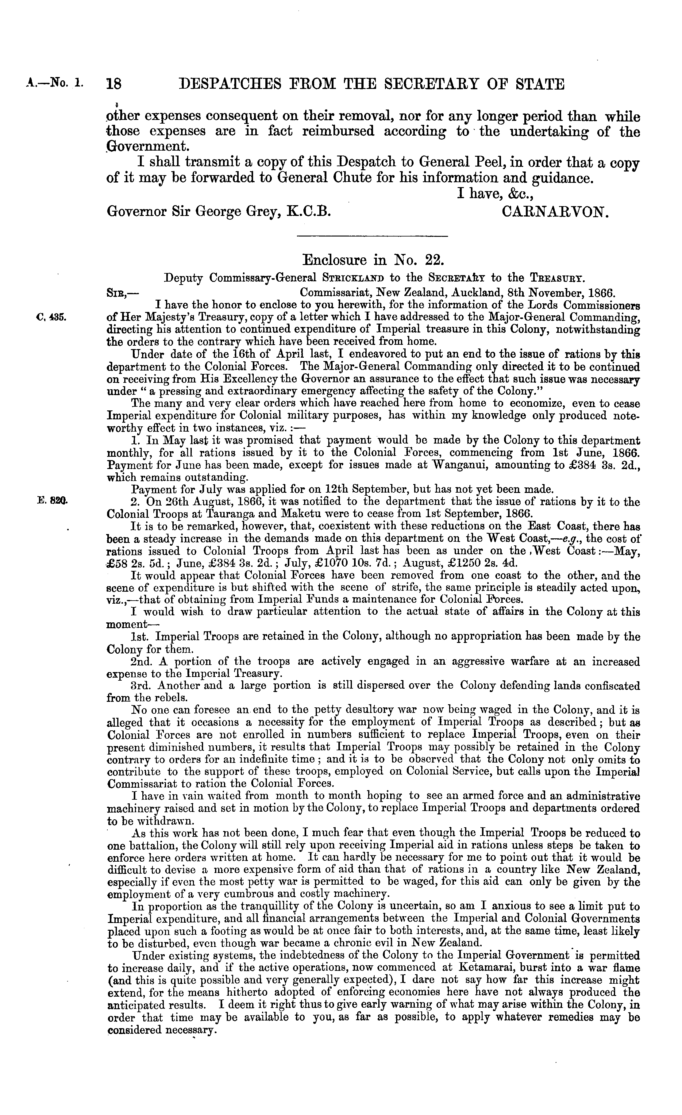 Enclosure in No. 22. Deputy Commissary-General Steickland to the Seceetaet to the Teeasuet. Sie, — Commissariat, New Zealand, Auckland, Bth November, 1866. I have the honor to enclose to you herewith, for the information of the Lords Commissioners of Her Majesty's Treasury, copy of a letter which I have addressed to the Major-General Commanding, directing his attention to continued expenditure of Imperial treasure in this Colony, notwithstanding tho orders to the contrary which have been received from home. Under date of the 16th of April last, I endeavored to put an end to the issue of rations by this department to the Colonial Forces. The Major-General Commanding only directed it to be continued on receiving from His Excellency the Governor an assurance to the effect that such issue was necessary under " a pressing and extraordinary emergency affecting the safety of the Colony." The many and very clear orders which have reached here from home to economize, even to cease Imperial expenditure for Colonial military purposes, has within my knowledge only produced noteworthy effect in two instances, viz. : — 1. In May last it was promised that payment would bo made by the Colony to this department monthly, for all rations issued by it to the Colonial Forces, commencing from Ist June, 1866. Payment for June has been made, except for issues made at Wanganui, amounting to £384 3s. 2d., which remains outstanding. Payment for July was applied for on 12th September, but has not yet been made. 2. On 26th August, 1866, it was notified to the department that the issue of rations by it to the Colonial Troops at Tauranga and Maketu were to cease from Ist September, 1866. It is to be remarked, however, that, coexistent with these reductions on the East Coast, there has been a steady increase in the demands made on this department on the West Coast, — e.g., the cost of rations issued to Colonial Troops from April last has been as under on the .West Coast: —May, £58 2s. 5d.; June, £384 3s. 2d.; July, £1070 10s. 7d.; August, £1250 2s. 4d. It would appear that Colonial Forces have been removed from one coast to the other, and the scene of expenditure is but shifted with the scene of strife, the same principle is steadily acted upon, viz.,—that of obtaining from Imperial Funds a maintenance for Colonial Forces. I would wish to draw particular attention to the actual state of affairs in the Colony at this moment — Ist. Imperial Troops are retained in the Colony, although no appropriation has been made by the Colony for them. 2nd. A portion of the troops are actively engaged in an aggressive warfare at an increased expense to the Imperial Treasury. 3rd. Another and a large portion is still dispersed over the Colony defending lands confiscated from tho rebels. No one can foresee an end to the petty desultory war now being waged in the Colony, and it is alleged that it occasions a necessity for the employment of Imperial Troops as described; but as Colonial Forces are not enrolled in numbers sufficient to replace Imperial Troops, even on their present diminished numbers, it results that Imperial Troops may possibly be retained in the Colony contrary to orders for an indefinite time ; and it is to be observed that the Colony not only omits to contribute to the support of these troops, employed on Colonial Service, but calls upon the Imperial Commissariat to ration the Colonial Forces. I have in vain waited from month to month hoping to see an armed force and an administrative machinery raised and set in motion by the Colony, to replace Imperial Troops and departments ordered to be withdrawn. As this work has not been done, I much fear that even though the Imperial Troops be reduced to one battalion, the Colony will still rely upon receiving Imperial aid in rations unless steps be taken to enforce here orders written at home. It can hardly be necessary for me to point out that it would be difficult to devise a more expensive form of aid than that of rations in a country like New Zealand, especially if even the most petty war is permitted to be waged, for this aid can only be given by the employment of a very cumbrous and costly machinery. In proportion as the tranquillity of the Colony is uncertain, so am I anxious to see a limit put to Imperial expenditure, and all financial arrangements between the Imperial and Colonial Governments placed upon such a footing as would be at once fair to both interests, and, at the same time, least likely to be disturbed, even though war became a chronic evil in New Zealand. Under existing systems, the indebtedness of the Colony to the Imperial Government is permitted to increase daily, and if the active operations, now commenced at Ketamarai, burst into a war flame (and this is quite possible and very generally expected), I dare not say how far this increase might extend, for tho means hitherto adopted of enforcing economies here have not always produced the anticipated results. I deem it right thus to give early warning of what may arise within the Colony, in order that time may be available to you, as far as possible, to apply whatever remedies may be considered necessary.