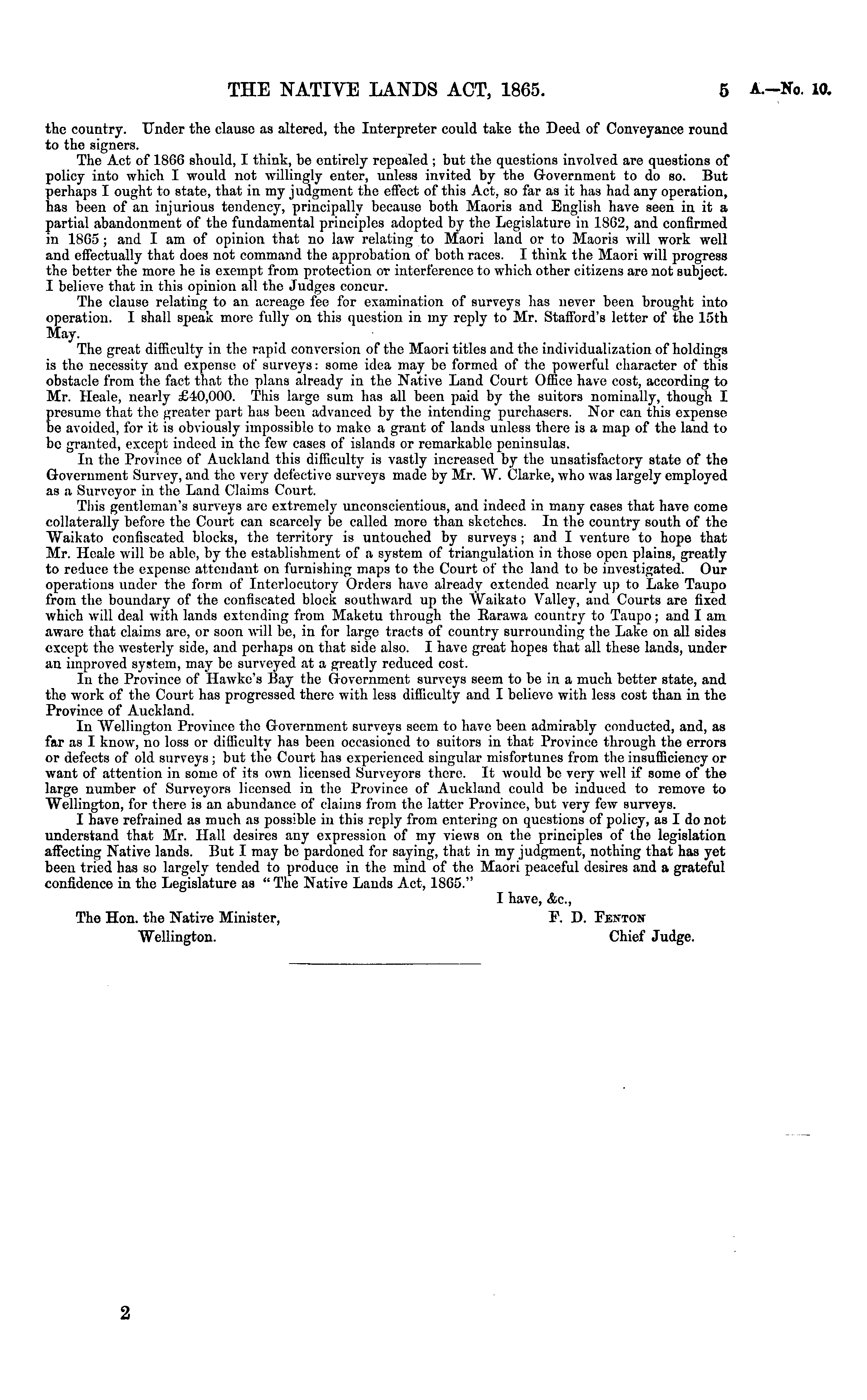 the country. Under the clause as altered, the Interpreter could take the Deed of Conveyance round to the signers. The Act of 1806 should, I think, be entirely repealed ; but the questions involved are questions of policy into which I would not willingly enter, unless invited by the Government to do so. But perhaps I ought to state, that in my judgment the effect of this Act, so far as it has had any operation, has been of an injurious tendency, principally because both Maoris and English have seen in it a partial abandonment of the fundamental principles adopted by the Legislature in 18G2, and confirmed in 1865 ; and I am of opinion that no law relating to Maori land or to Maoris will work well and effectually that docs not command the approbation of both races. I think the Maori will progress the better the more he is exempt from protection or interference to which other citizens are not subject. I believe that in this opinion all the Judges concur. The clause relating to an acreage fee for examination of surveys lias never been brought into operation. I shall speak more fully on this question in my reply to Mr. Stafford's letter of the 15th May. The great difficulty in the rapid conversion of the Maori titles and the individualization of holdings is the necessity and expense of surveys: some idea may be formed of the powerful character of this obstacle from the fact that the plans already in the Native Land Court Office have cost, according to Mr. Heale, nearly £40,000. This large sum has all been paid by the suitors nominally, though I presume that the greater part has been advanced by the intending purchasers. Nor can this expense be avoided, for it is obviously impossible to make a grant of lands unless there is a map of the land to be granted, except indeed in the few cases of islands or remarkable peninsulas. In the Province of Auckland this difficulty is vastly increased by the unsatisfactory state of the Government Survey, and the very defective surveys made by Mr. W. Clarke, who was largely employed as a Surveyor in the Land Claims Court. Tins gentleman's surveys are extremely unconscientious, and indeed in many cases that have come collaterally before the Court can scarcely be called more than sketches. In the country south of the Waikato confiscated blocks, the territory is untouched by surveys ; and I venture to hope that Mr. Hcale will be able, by the establishment of a system of triangulation in those open plains, greatly to reduce the expense attendant on furnishing maps to the Court of the land to be investigated. Our operations under the form of Interlocutory Orders have already extended nearly up to Lake Taupo from the boundary of the confiscated block southward up the Waikato Valley, and Courts are fixed which will deal with lands extending from Maketu through the Earawa country to Taupo; and lam aware that claims are, or soon will be, in for large tracts of country surrounding the Lake on all sides except the westerly side, and perhaps on that side also. I have great hopes that all these lands, under an improved system, may be surveyed at a greatly reduced cost. In the Province of Hawke's Bay the Government surveys seem to be in a much better state, and the work of the Court has progressed there with less difficulty and I believe with less cost than in the Province of Auckland. In "Wellington Province the Government surveys seem to have been admirably conducted, and, as far as I know, no loss or difficulty has been occasioned to suitors in that Province through the errors or defects of old surveys ; but the Court has experienced singular misfortunes from the insufficiency or want of attention in some of its own licensed Surveyors there. It would be very well if some of the large number of Surveyors licensed in the Province of Auckland could be induced to remove to Wellington, for there is an abundance of claims from the latter Province, but very few surveys. I have refrained as much as possible in this reply from entering on questions of policy, as I do not understand that Mr. Hall desires any expression of my views on the principles of the legislation affecting Native lands. But I may be pardoned for saying, that in my judgment, nothing that has yet been tried has so largely tended to produce in the mind of the Maori peaceful desires and a grateful confidence in the Legislature as " The Native Lauds Act, 1865." I have, &c, The Hon. the Native Minister, F. D. Fexton Wellington. Chief Judge. 2