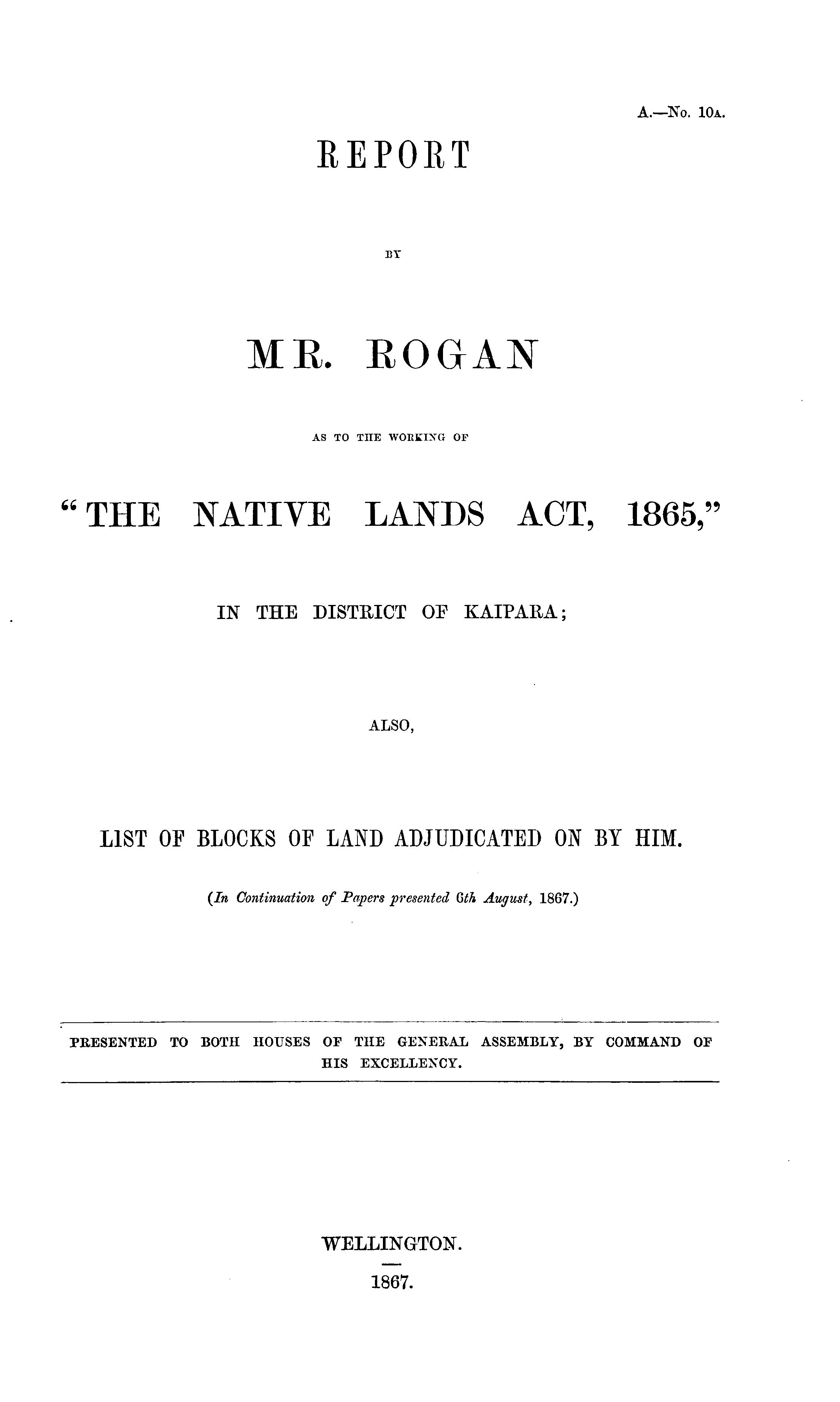 REPORT MR. ROGAN AS TO THE WORKING OF "THE NATIVE LANDS ACT, 1865," IN THE DISTRICT OF KAIPARA; ALSO, LIST OF BLOCKS OF LAND ADJUDICATED ON BY HIM.